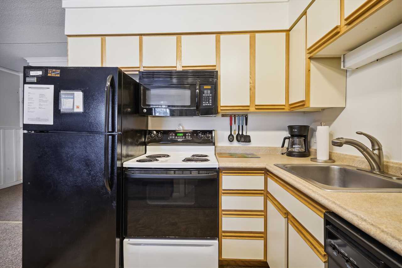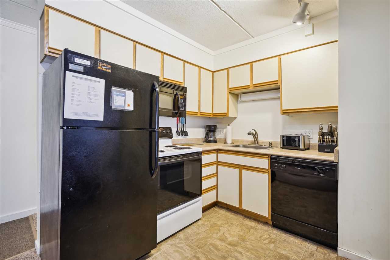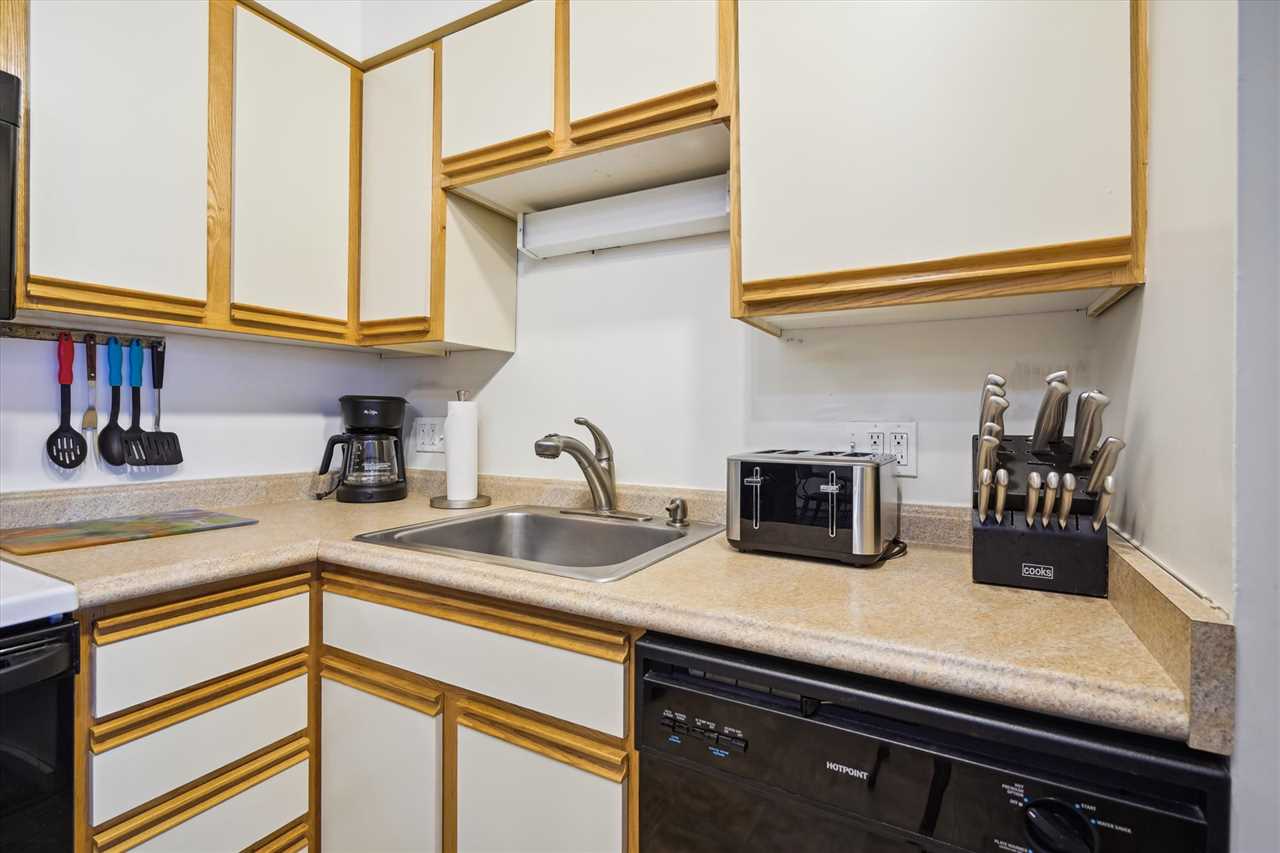 The fully stocked kitchen has everything you need for meal preparation, including basic cookware, a coffee maker, a toaster, a microwave, and a dishwasher.