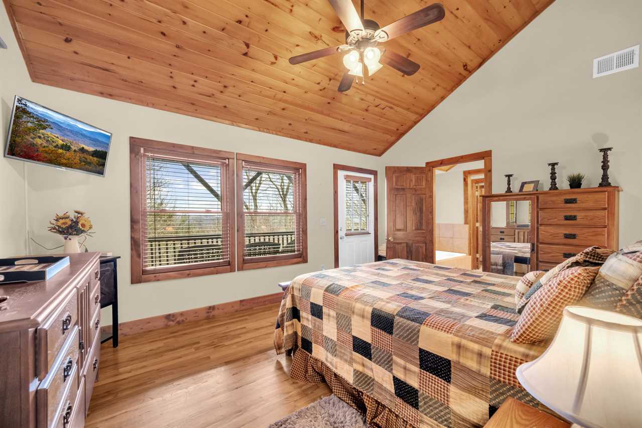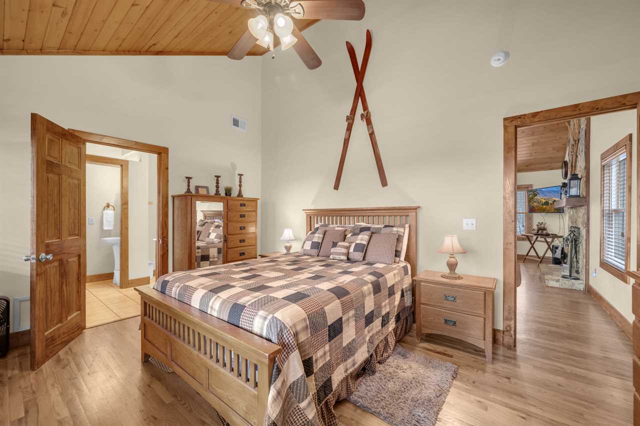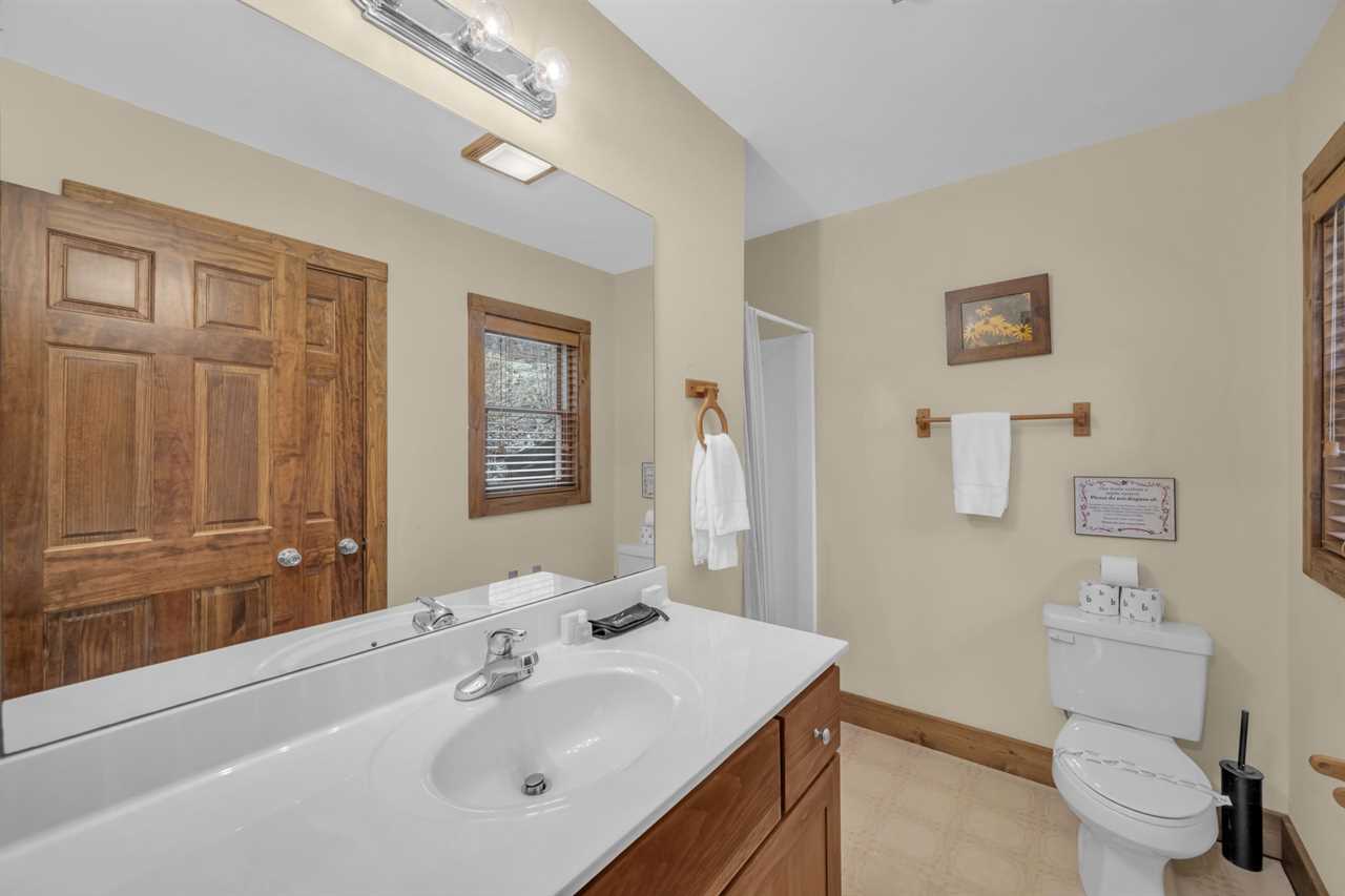 This two-story house has a spacious master suite on each floor. There is a queen master suite on the main floor with an HD Smart TV, a full ensuite bathroom featuring ceramic tile floors, a walk-in closet, a large shower stall, and a jetted Jacuzzi tub beside a window looking out to the mountains. A large king master suite on the first floor boasts an HD Smart TV with expanded digital cable programming, a full ensuite bathroom with an oversized tiled shower stall, and a walk-in closet.