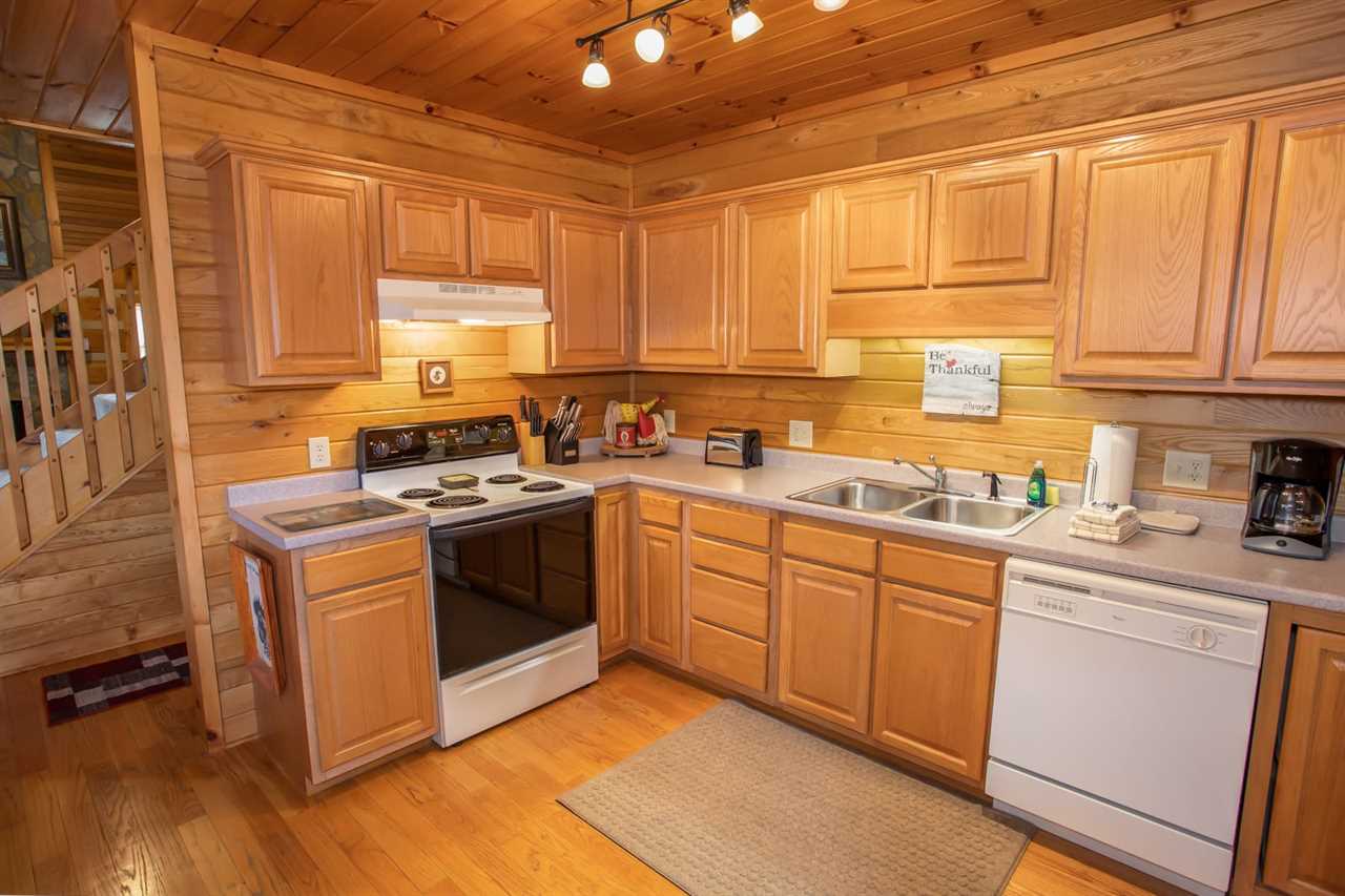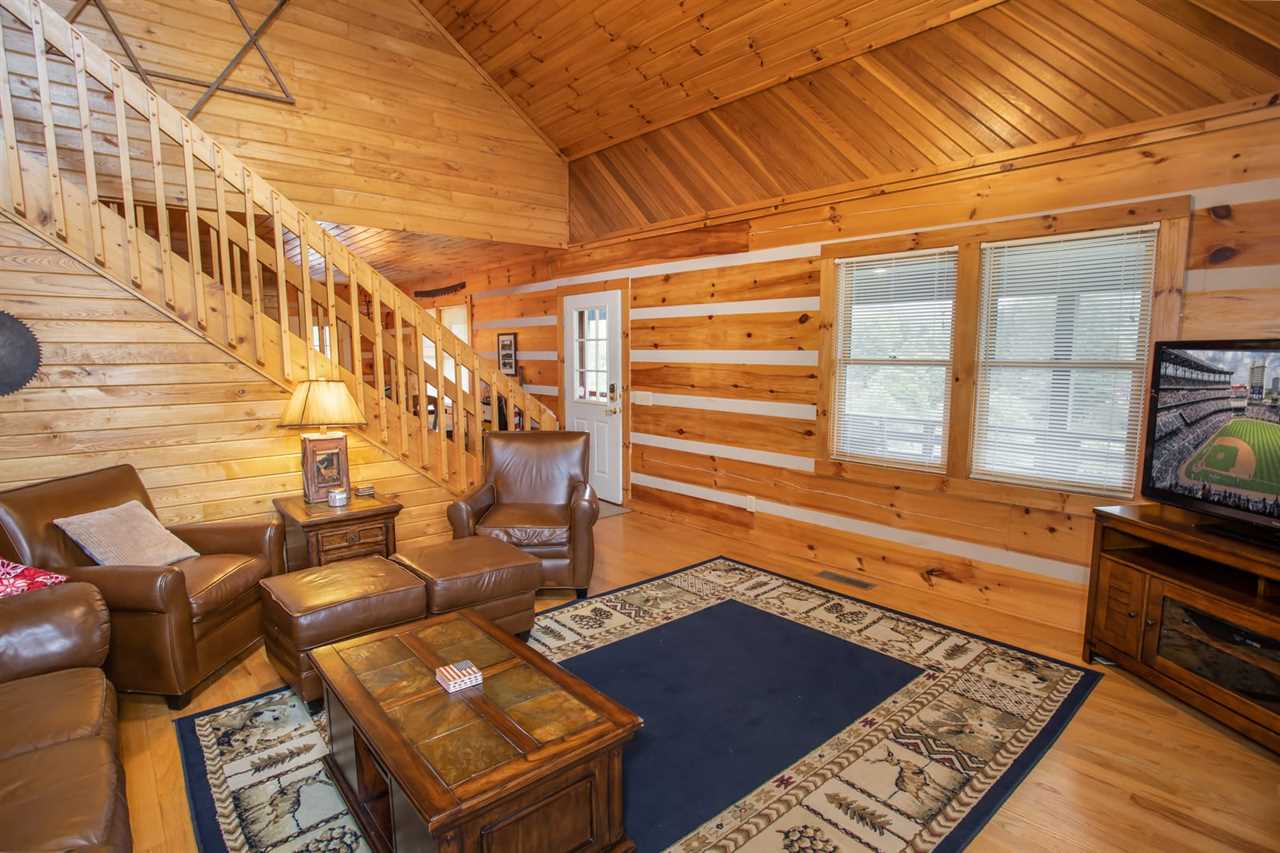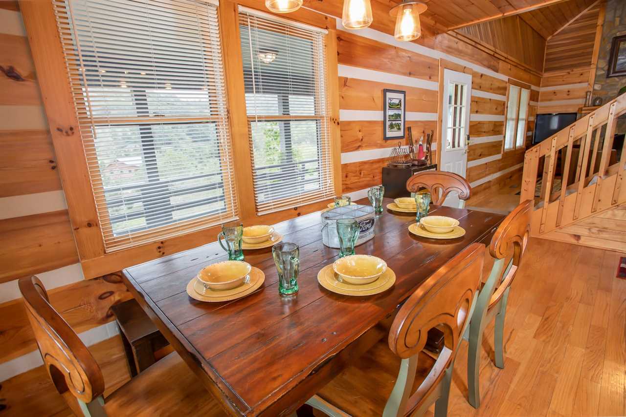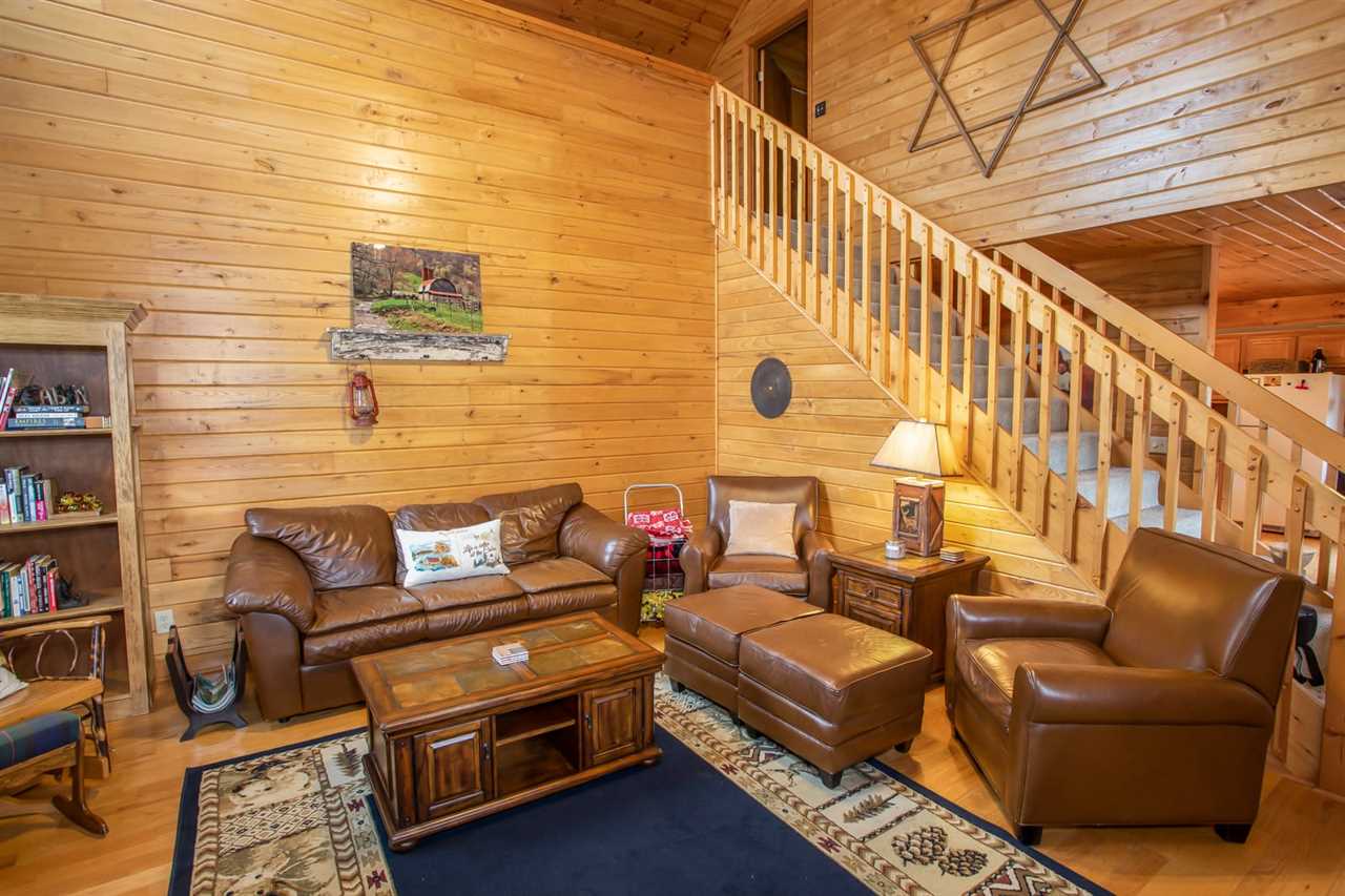 Inside the cabin, tongue-and-groove wood walls and leather furniture create a warm and rustic atmosphere. The living room is two stories tall and is centered around a wood-burning fireplace and flat-screen TV. The open kitchen is adjacent to the dining area, with seating for 6.
