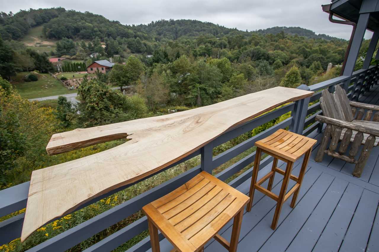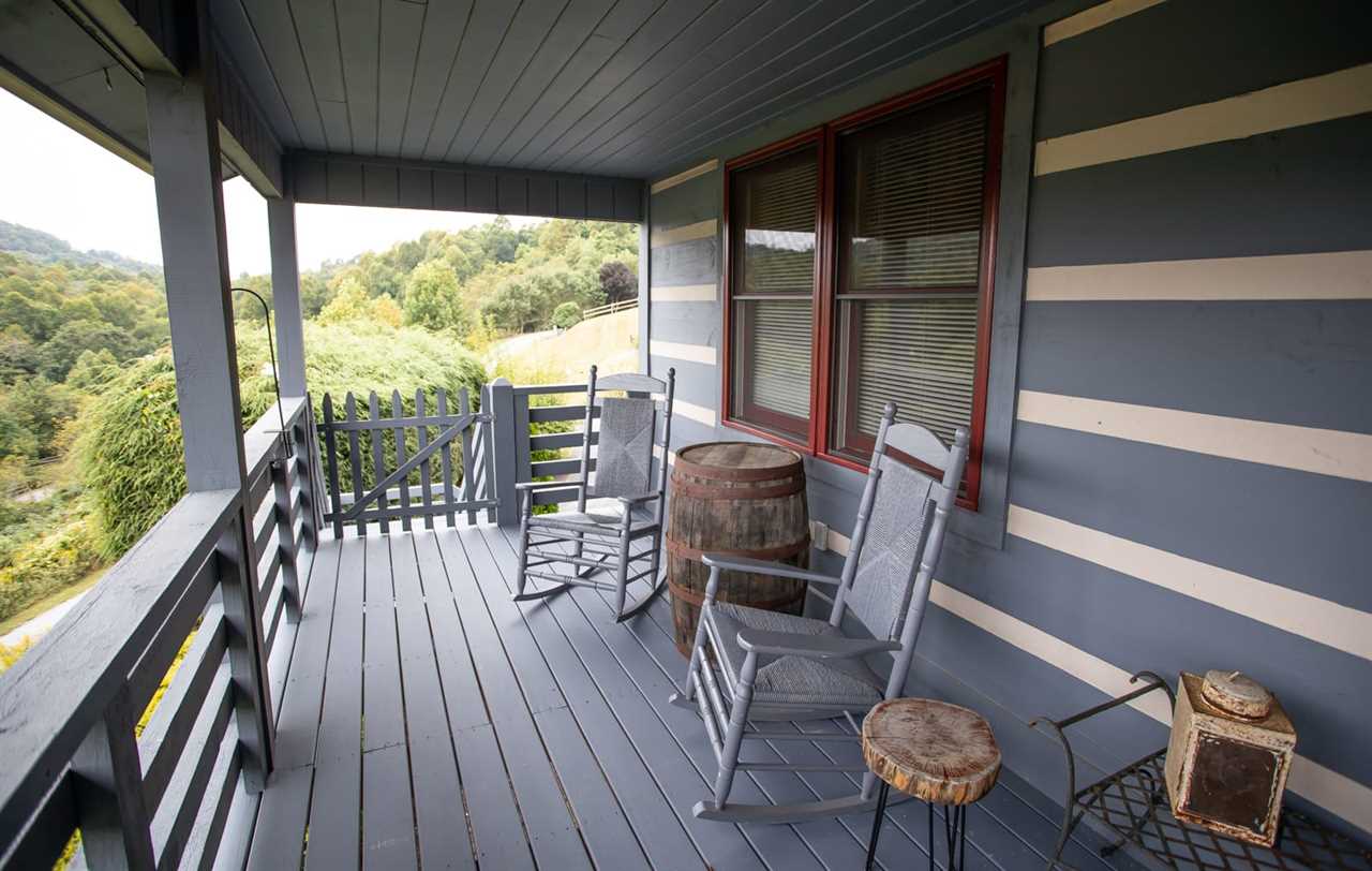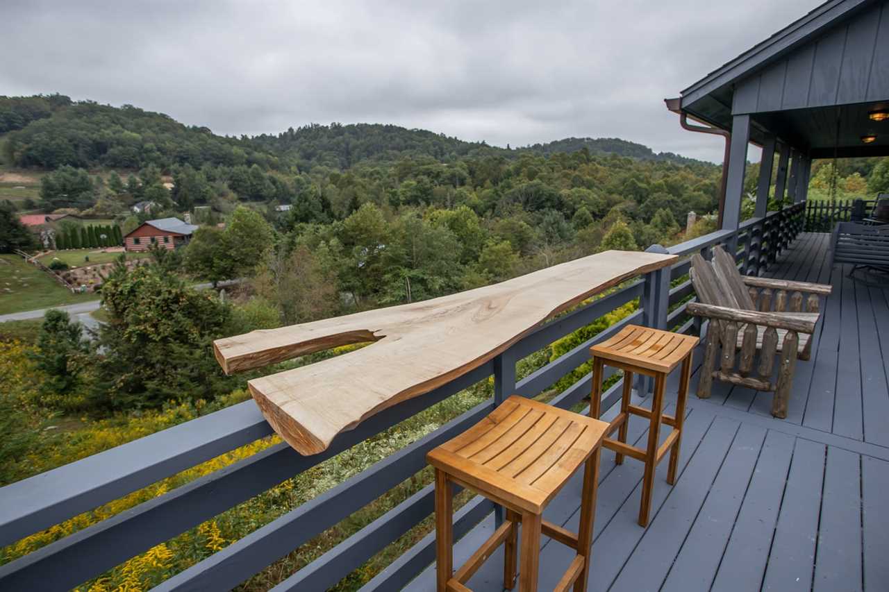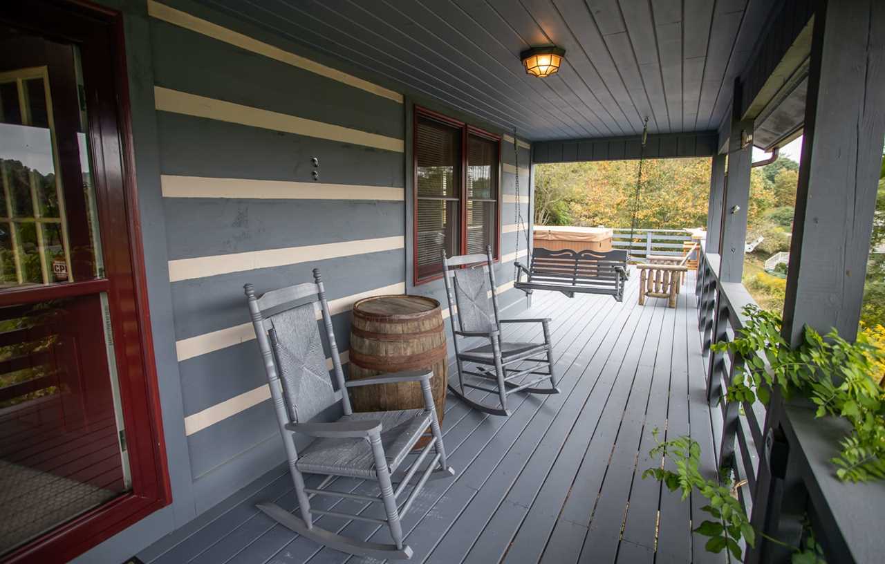 The spacious porch at Boots Off Bungalow overlooks a sweeping mountain landscape, with rocking chairs and a porch swing to take in the view. There is an outdoor bar area with seating for 2 overlooking the mountains, along with a large hot tub, which is the perfect way to relax after a long day of High Country adventures.