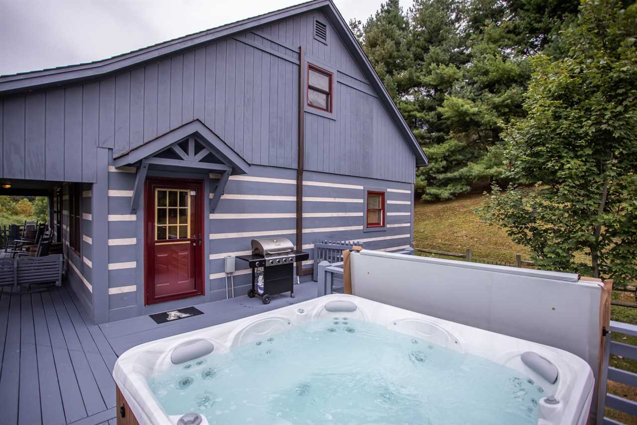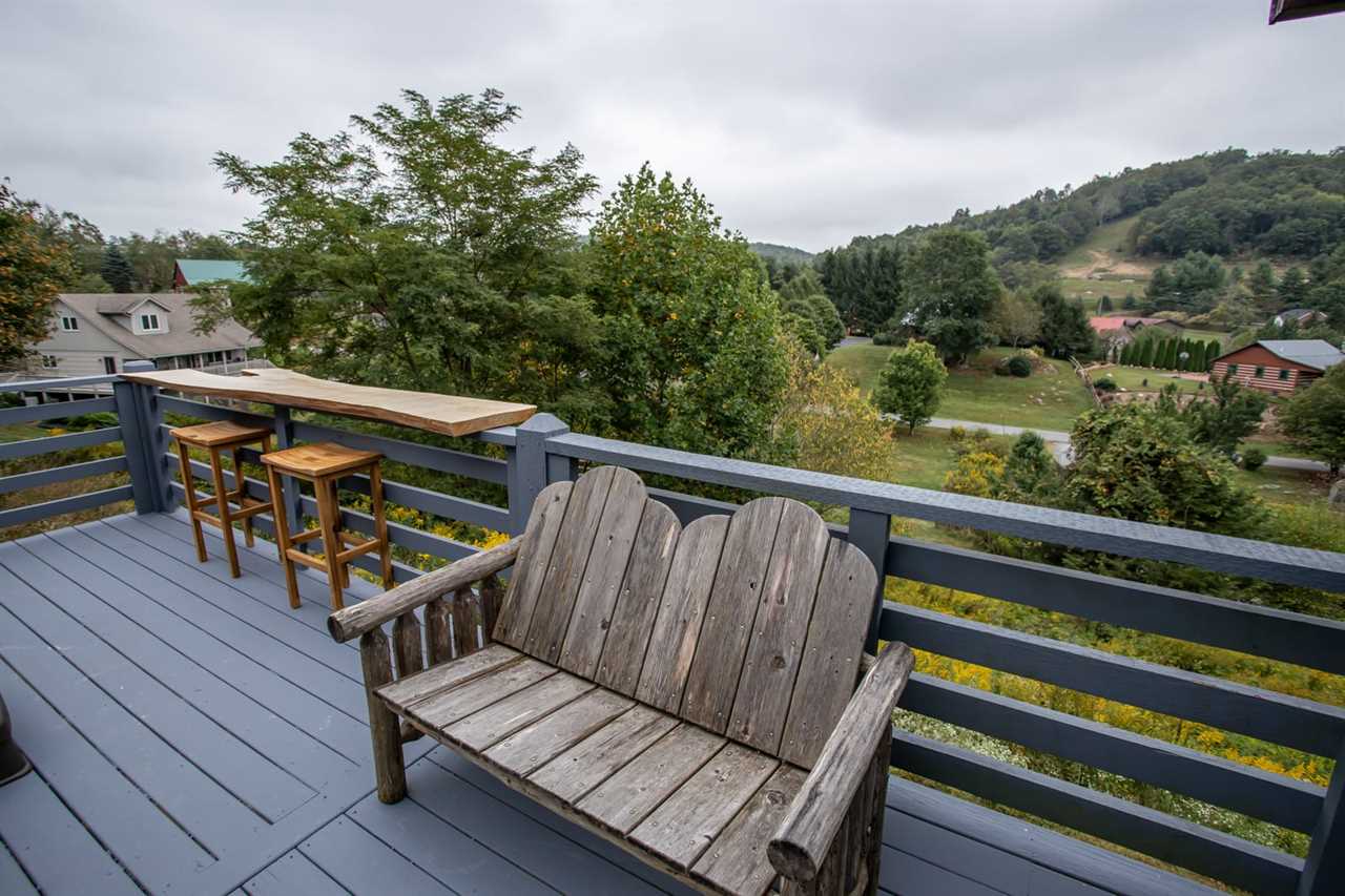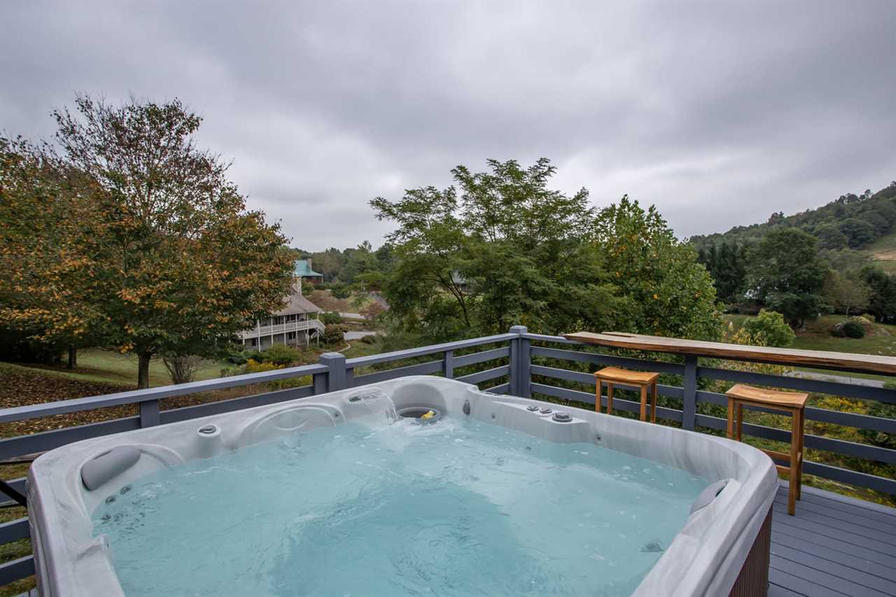The spacious porch at Boots Off Bungalow overlooks a sweeping mountain landscape, with rocking chairs and a porch swing to take in the view. There is an outdoor bar area with seating for 2 overlooking the mountains, along with a large hot tub, which is the perfect way to relax after a long day of High Country adventures.