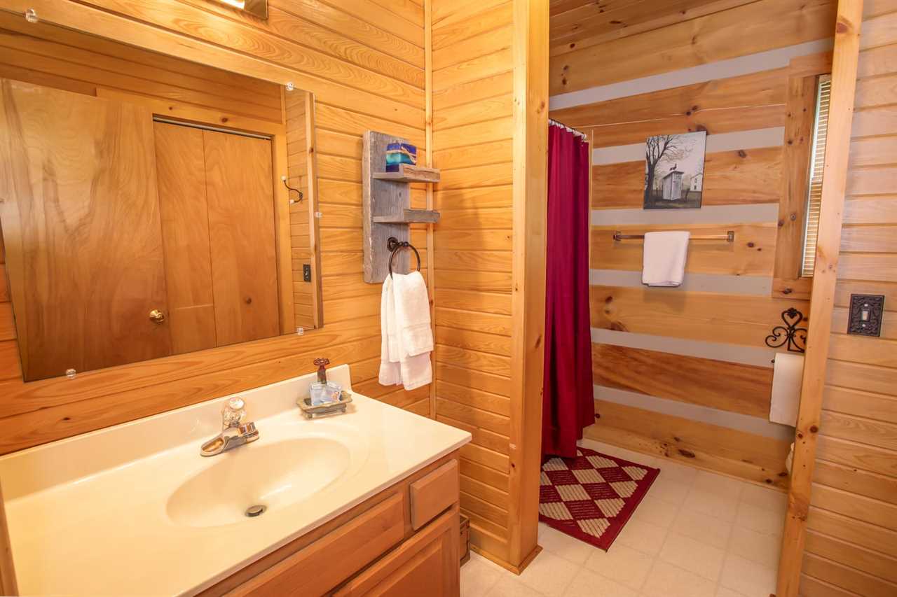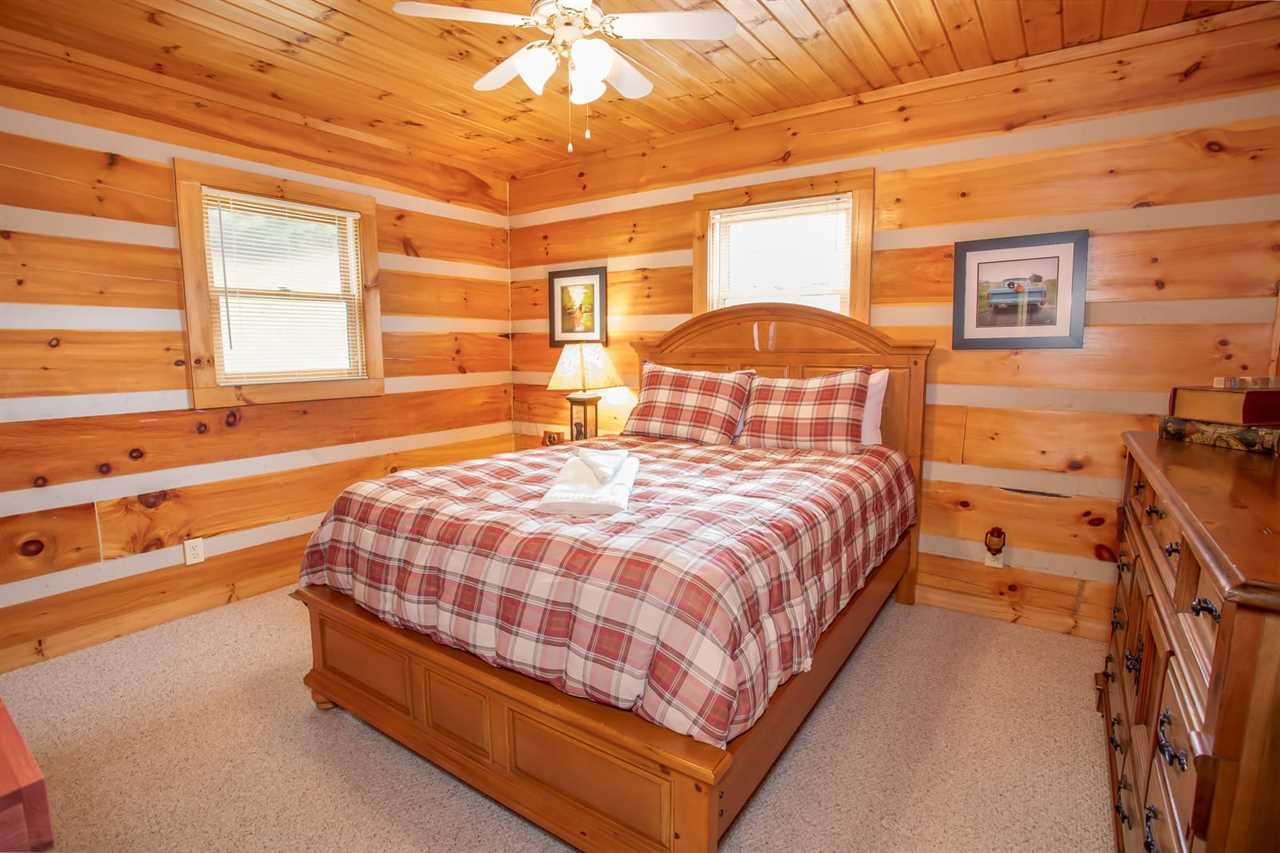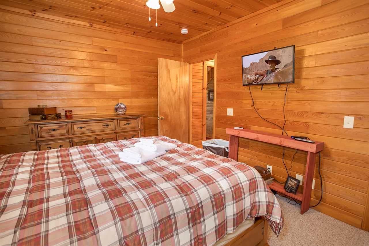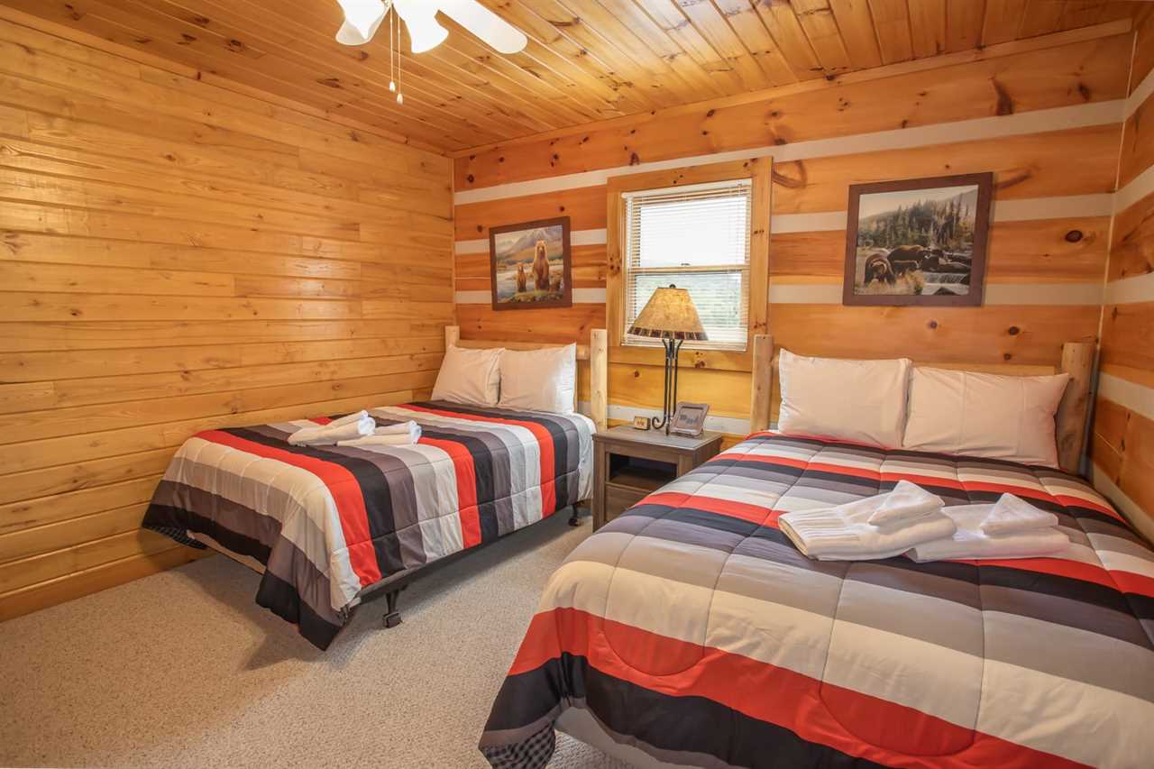 On the main level, there are two bedrooms. The first is a queen bedroom with a flat-screen TV, and the second bedroom has two full beds to sleep up to 4 guests. These two bedrooms share a full bathroom with a walk-in shower.