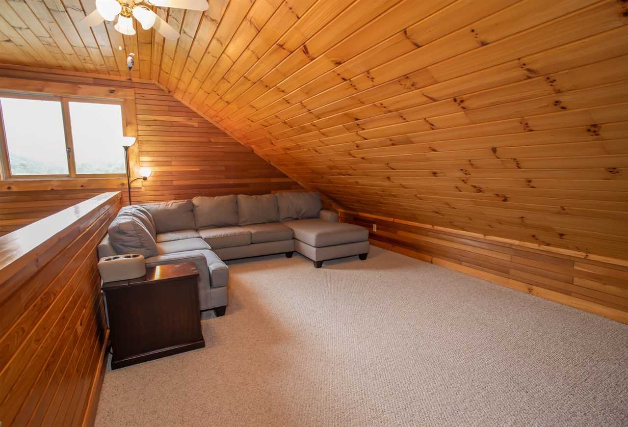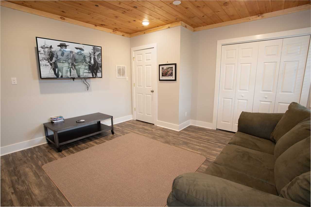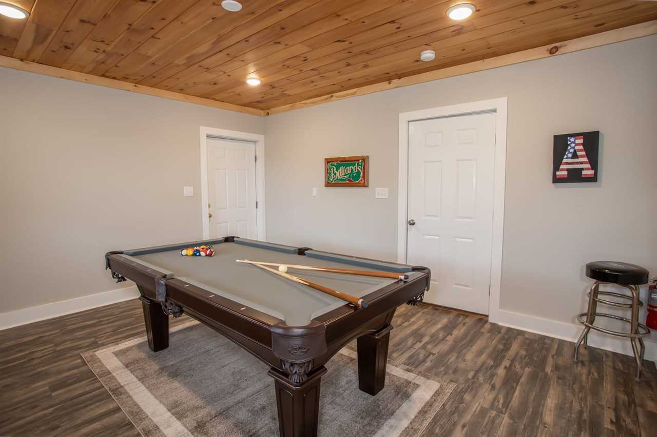 The lower level of the home boasts a fantastic game space with a pool table. There is also a seating area with a flat-screen TV and a half bathroom.