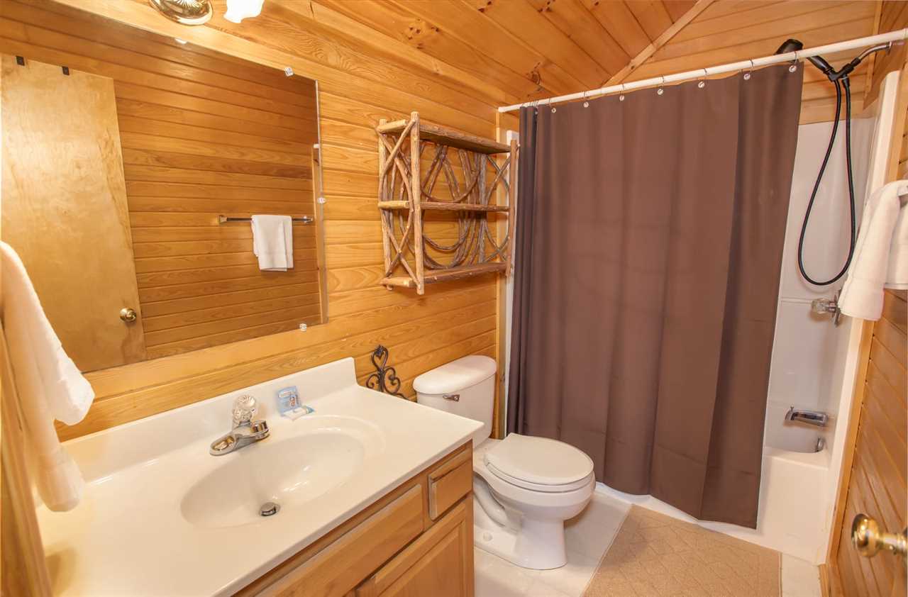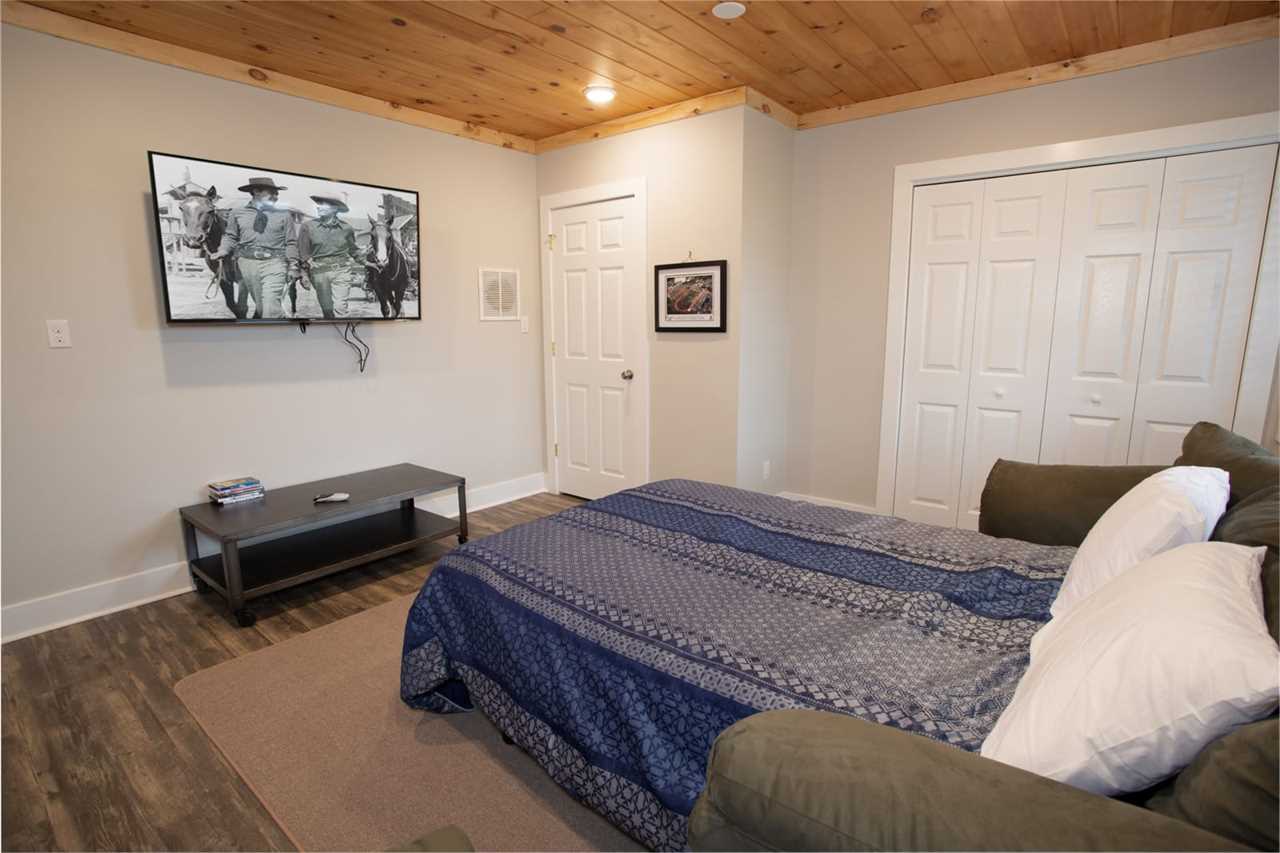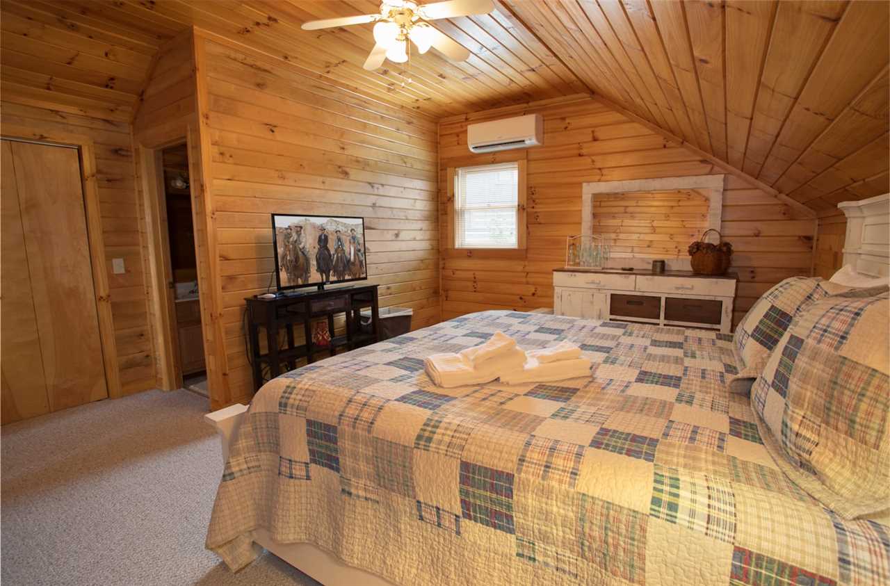 Upstairs, the loft is equipped with comfy seating, a large flat-screen TV, and a game system for additional entertainment space. The king bed master suite is upstairs and has a TV and private full bathroom with a tub and shower combo.