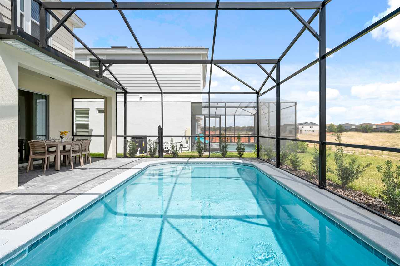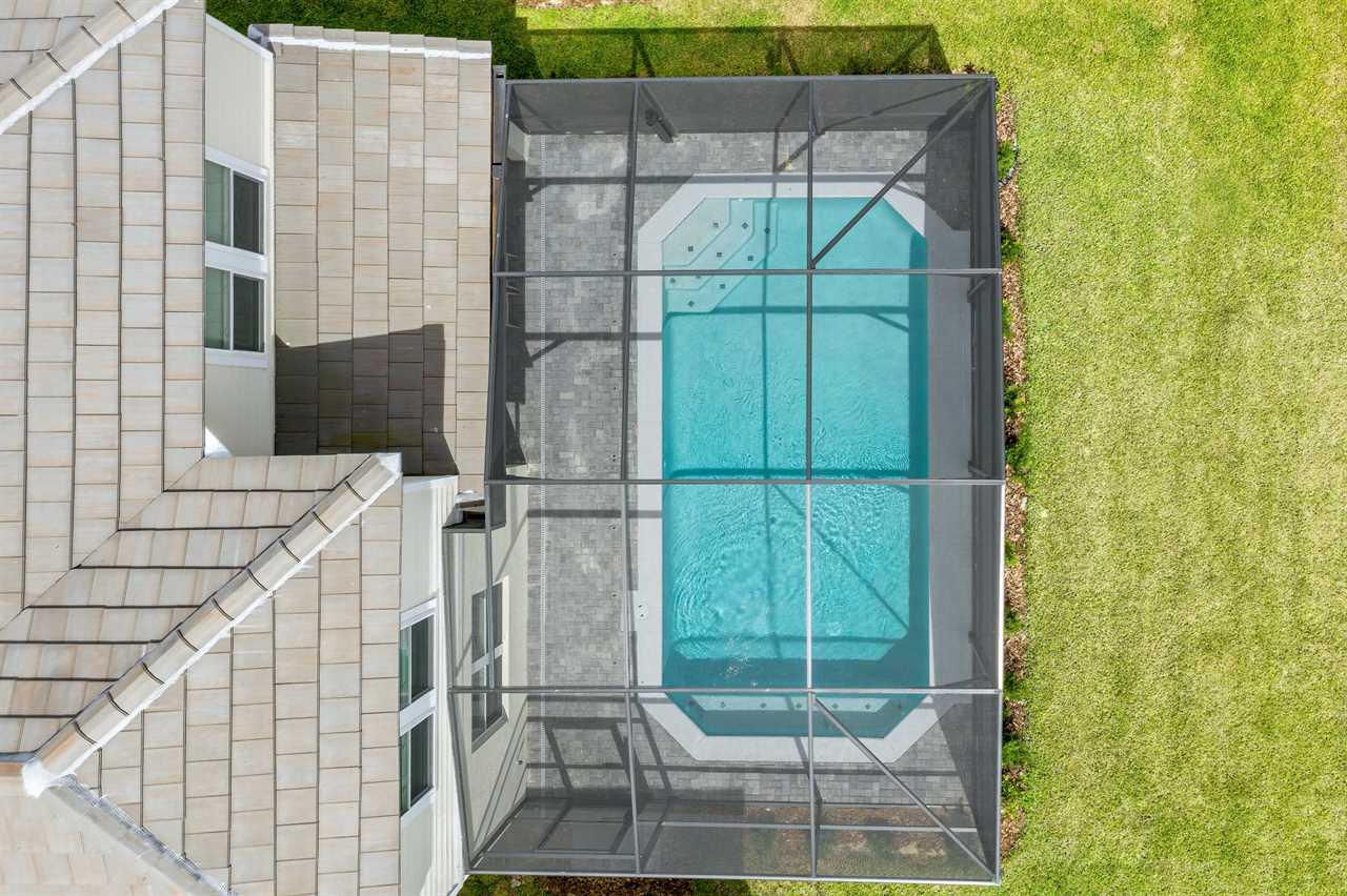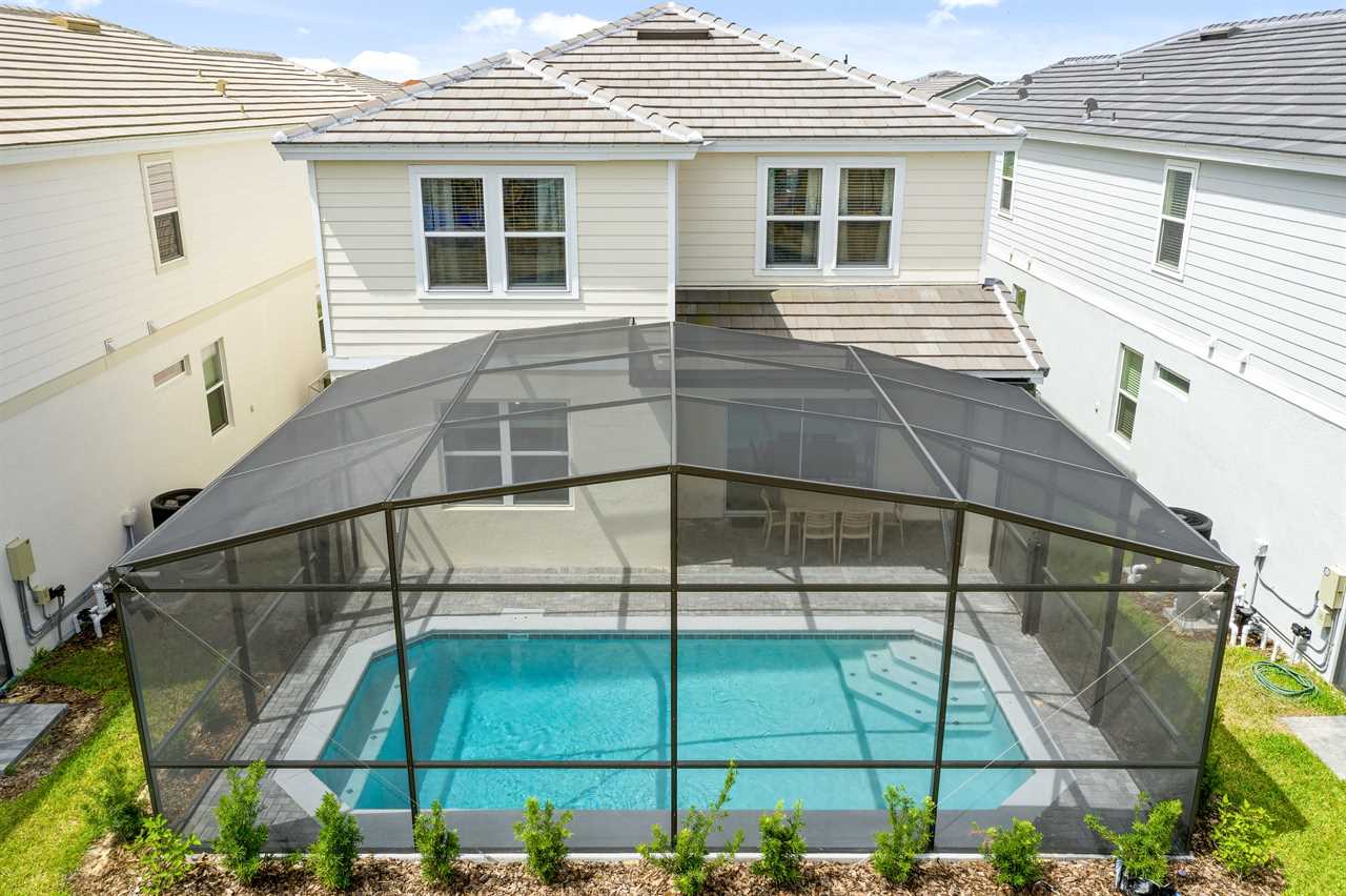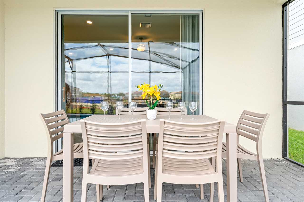 The great room sliding doors open up to the lanai and pool deck, serving as an extension of the shared space you ll enjoy with family and friends during your Florida vacation. Lunch poolside at the patio dining table for 6, or take a refreshing dip in the pool. The entire pool area is screened-in, keeping suburban critters out while letting the welcoming rays of the Florida sun in.