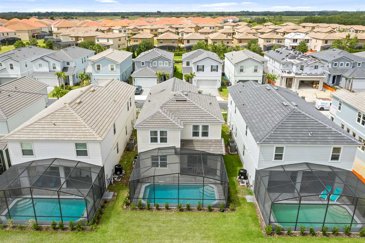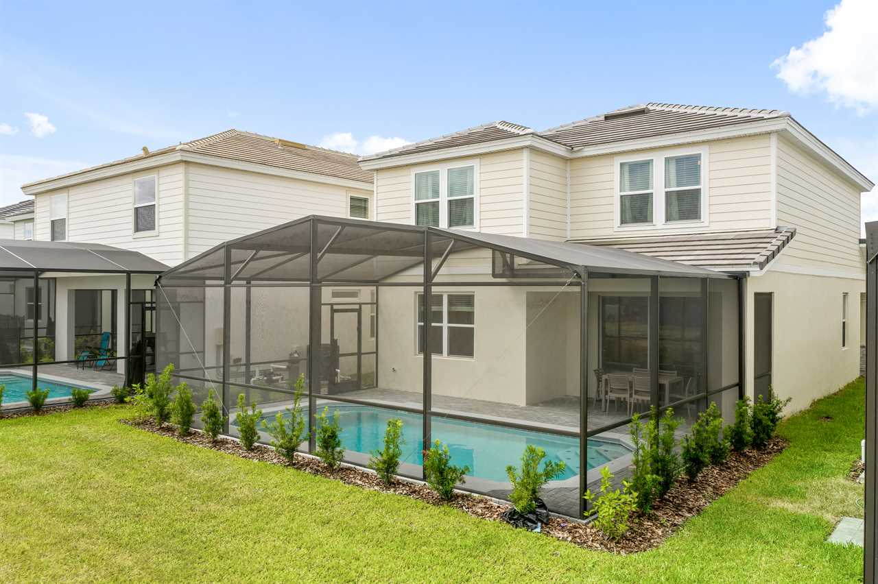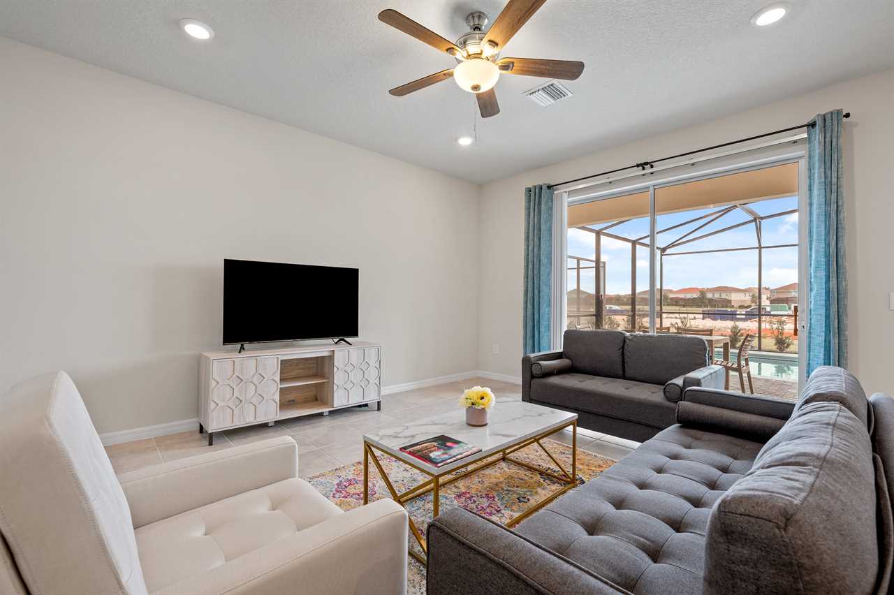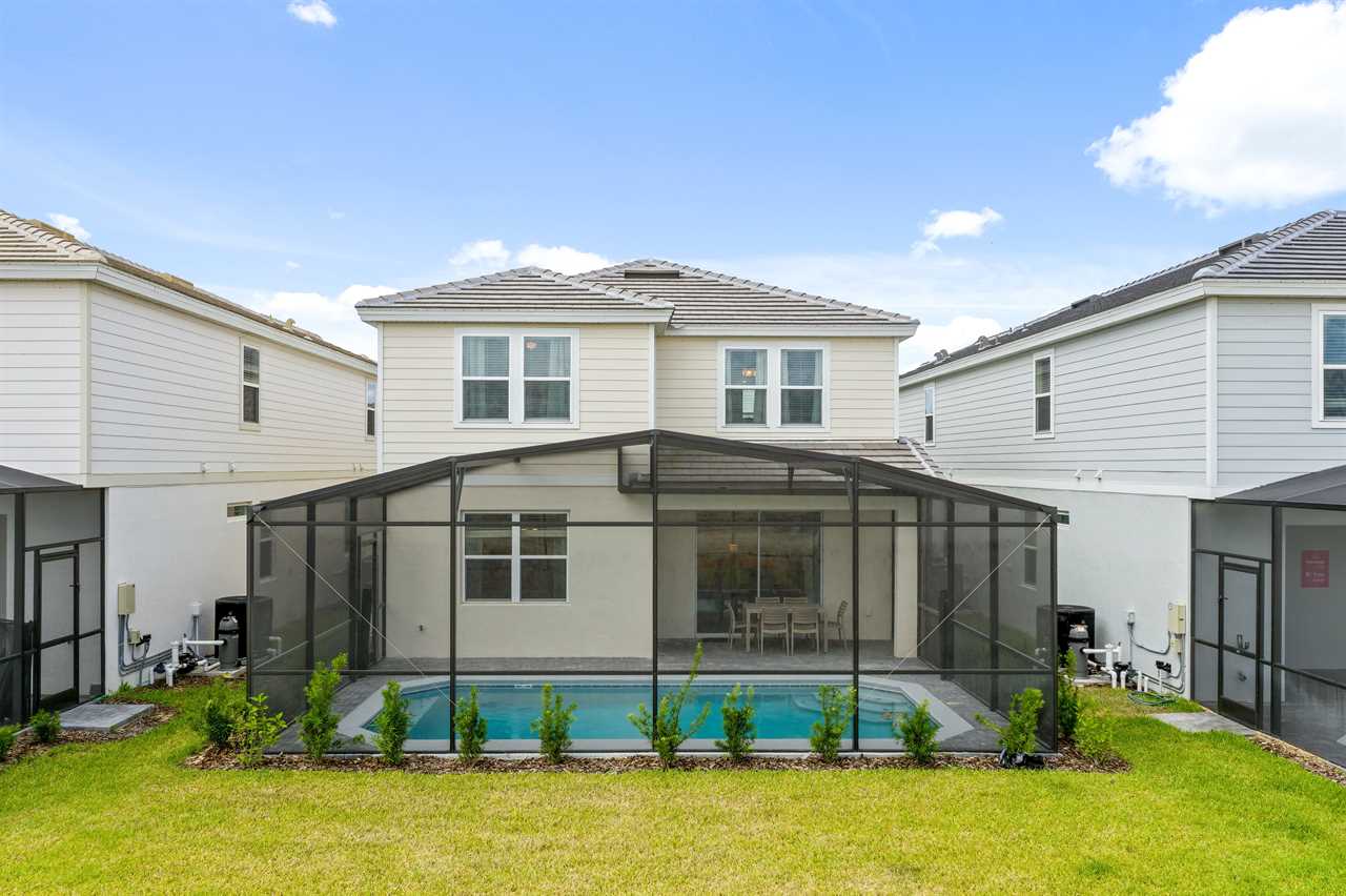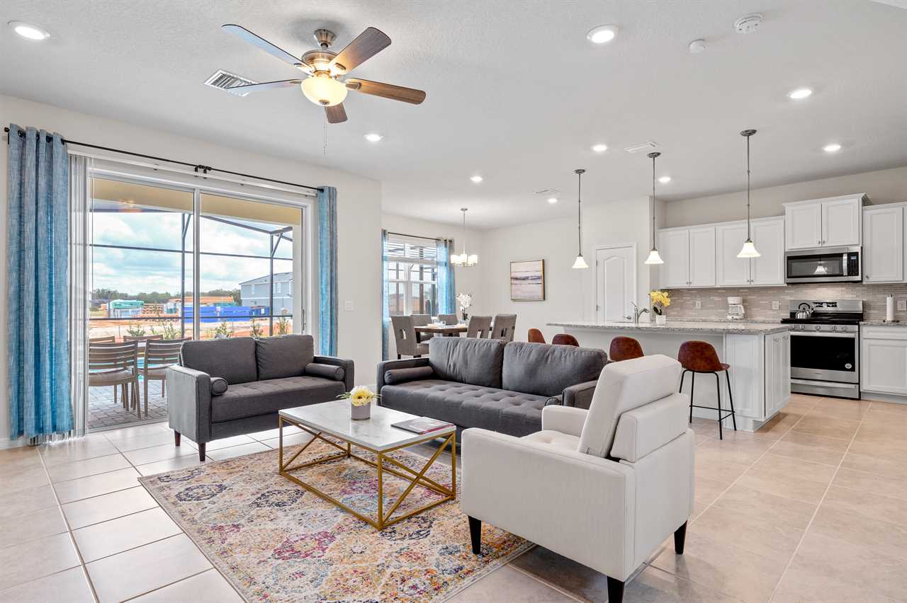The great room sliding doors open up to the lanai and pool deck, serving as an extension of the shared space you ll enjoy with family and friends during your Florida vacation. Lunch poolside at the patio dining table for 6, or take a refreshing dip in the pool. The entire pool area is screened-in, keeping suburban critters out while letting the welcoming rays of the Florida sun in.