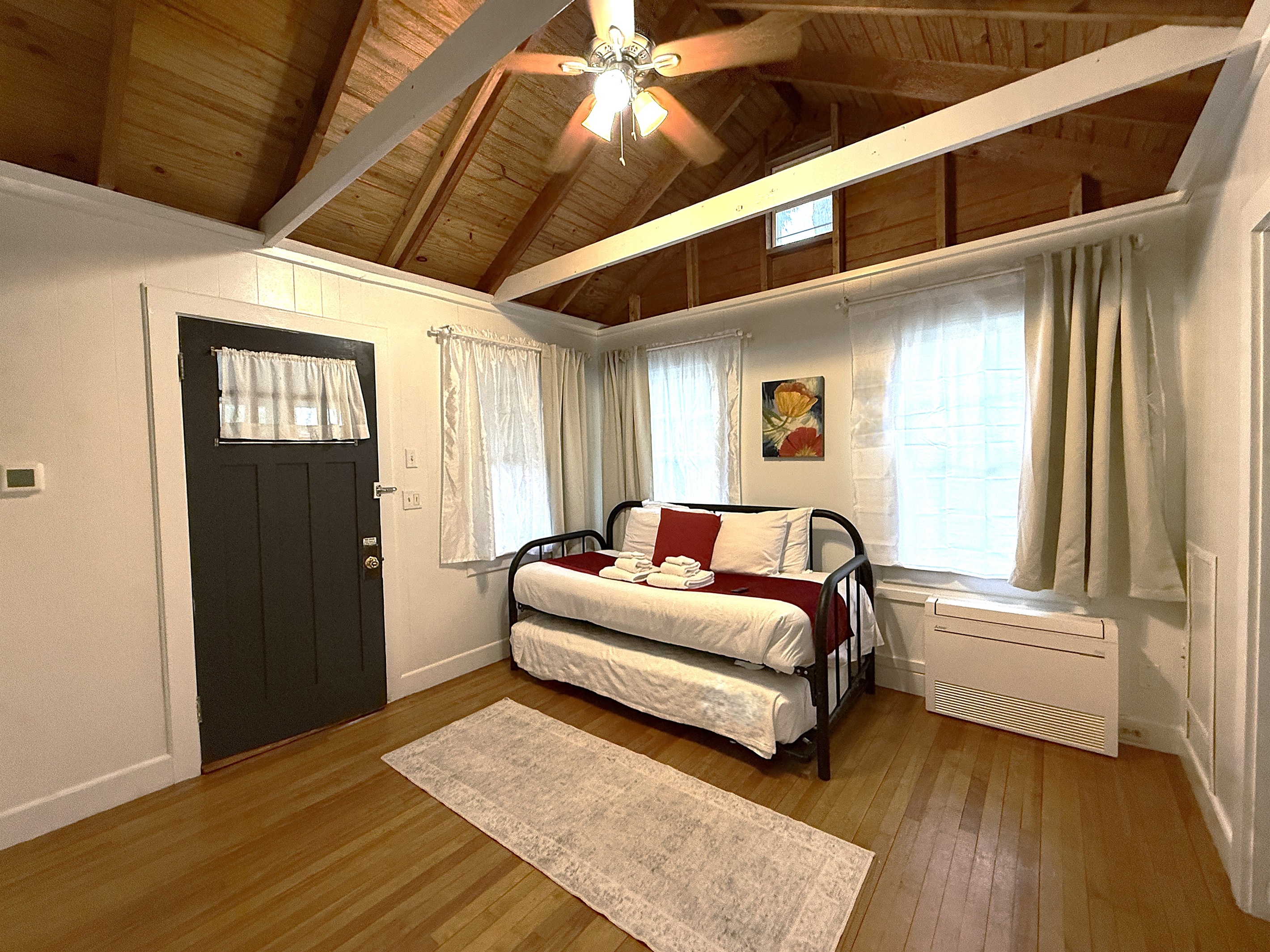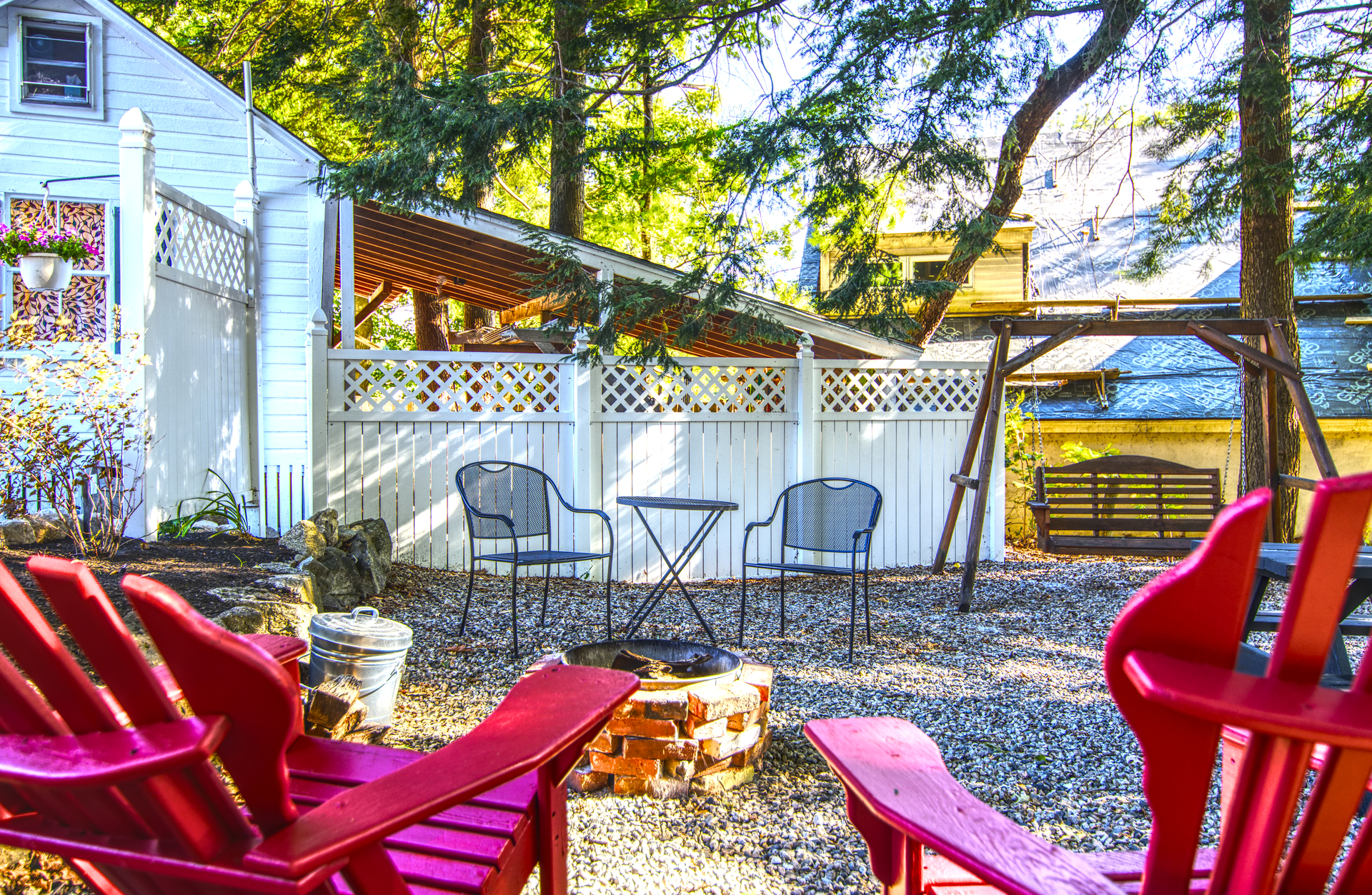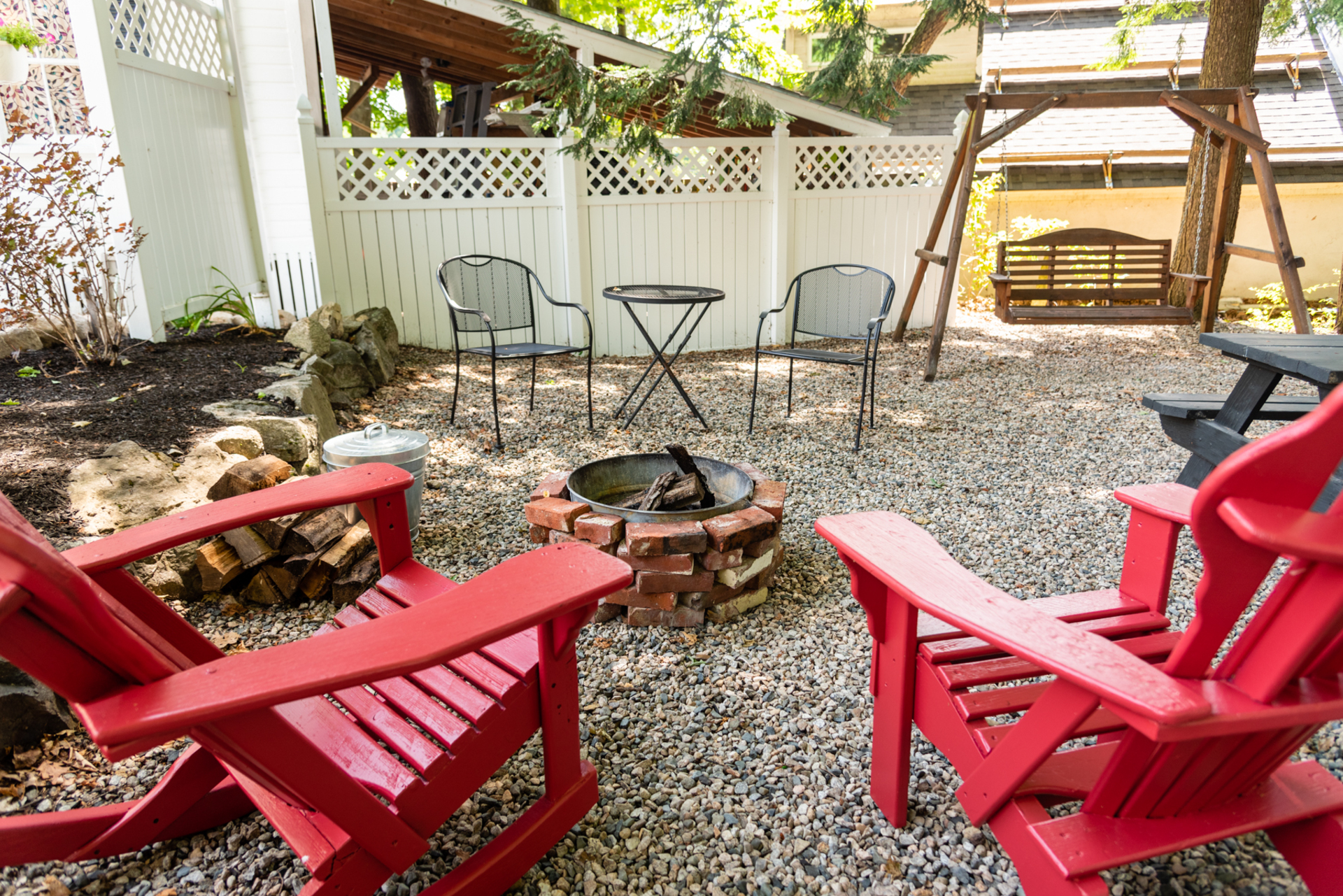 There is a private courtyard complete with Adirondack chairs, a charcoal grill (charcoal provided),chiminea, a hammock, a swing, and a picnic table. This unit sleeps a max of 6 Adults plus children up to a max of 8 guests.