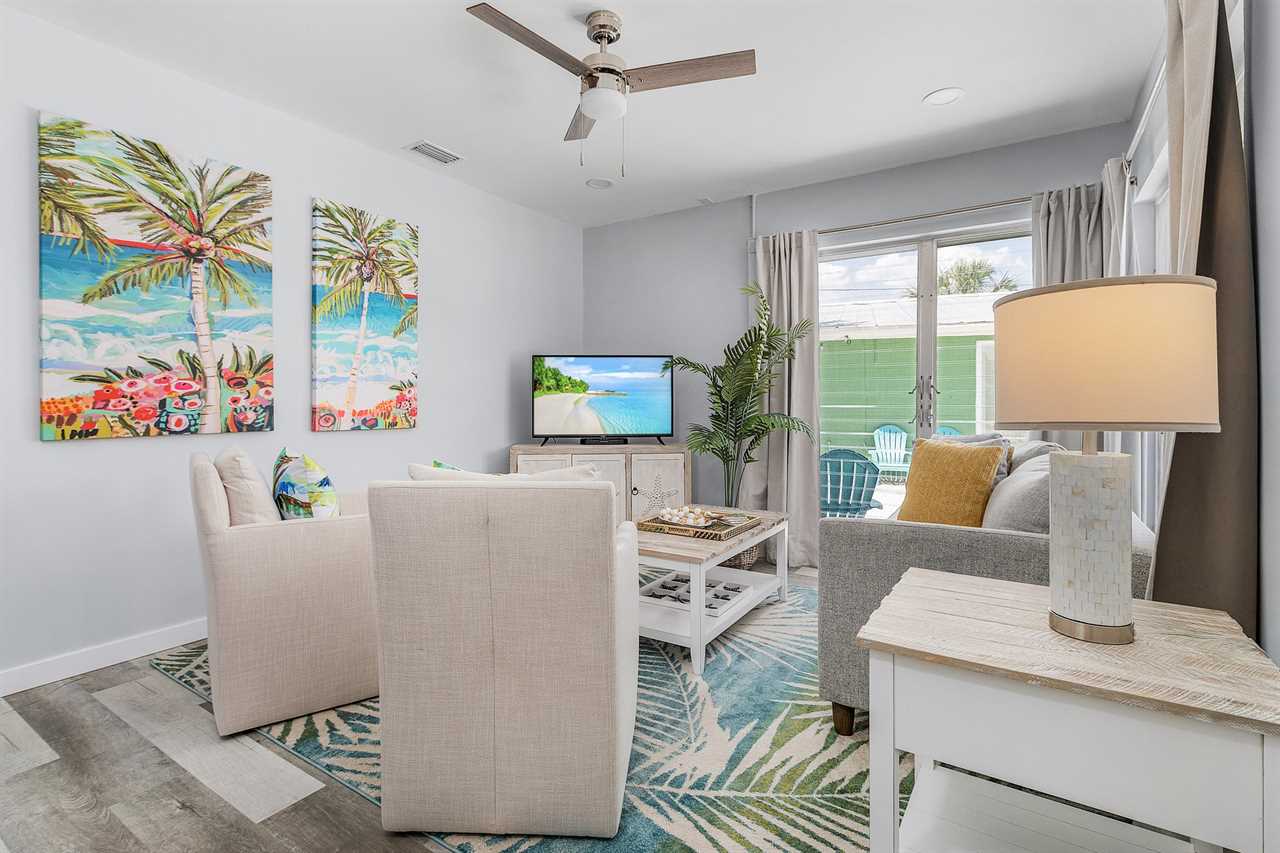 Washington Avenue Villas Unit B is a recently renovated and redecorated two-bedroom, one-bath vacation destination nestled in with three other villas, all surrounding a large heated swimming pool with sun deck located mid-way down the beautiful Estero Island, your tropical paradise that still maintains its Olde Florida charm. Beach access is just a short hop across Estero Boulevard to a 7-mile stretch of white, sugar sand beach providing a place for daytime beach activities and to view the endless variety of sunsets. Trolley service along the boulevard is available to transport you to Times Square with all of its restaurants, clubs, and nightlife. One of the island's largest supermarkets and the upscale Bayfront Bistro are just a short car ride away. Amenities include central air conditioning, complimentary WiFi, remote-controlled ceiling fans, all linens and towels provided, and shared on-site laundry facilities.