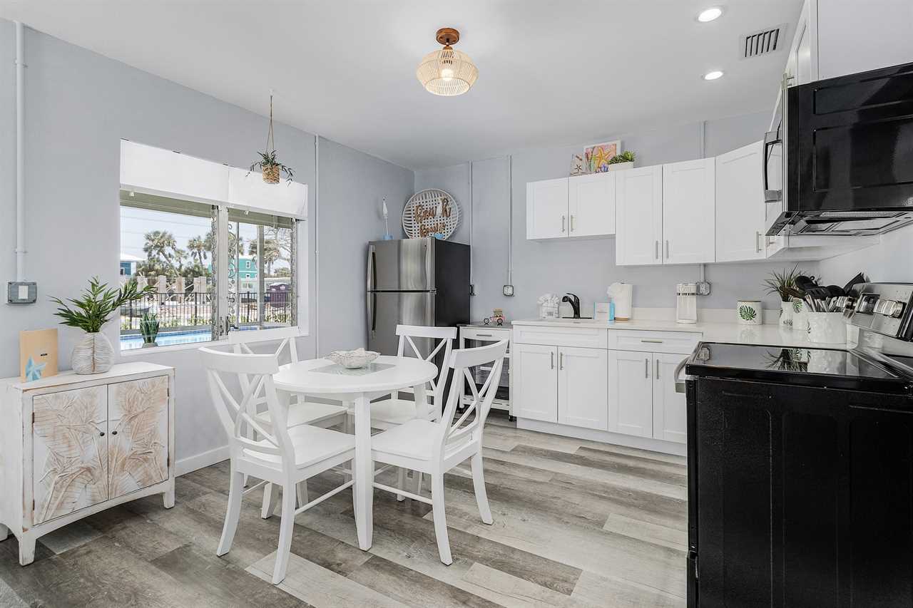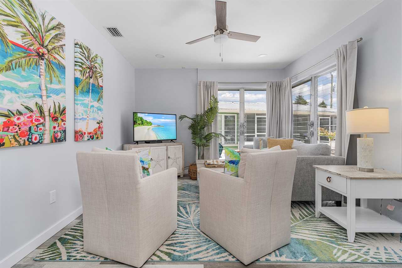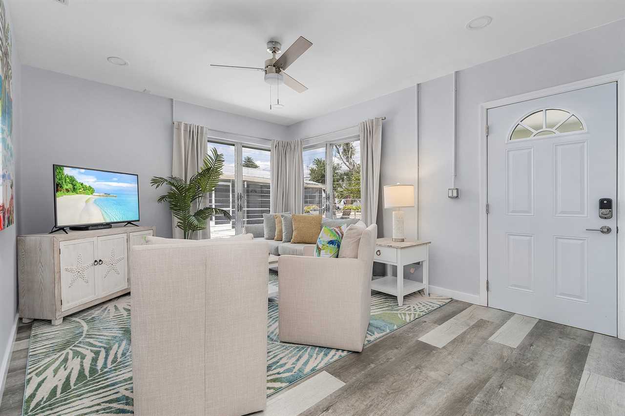 Upon arrival, there is ample off-street parking. Enter through the furnished screened-in front porch and into the open-plan kitchen, dining, and living areas. There is beautiful wood flooring throughout, and décor is a beachy motif. The kitchen has a quartz counter space, a stainless-steel sink, and well-stocked cabinets with everything necessary to cook full-course meals if desired. Appliances include a refrigerator/freezer, a 5-burner glass top range with a self-cleaning oven, a microwave oven, and a Keurig coffee maker. The dining area adjacent to the kitchen has a table seating four. This flows into the living area furnished with a queen-size sleeper sofa and area rug, as well as a corner accent table and lamp. Opposite the sofa are two matching side chairs and a wall-mounted large flat-screen TV.