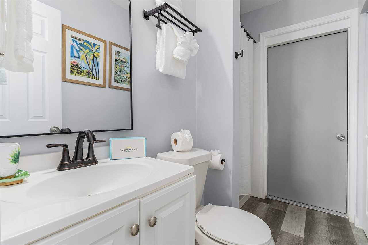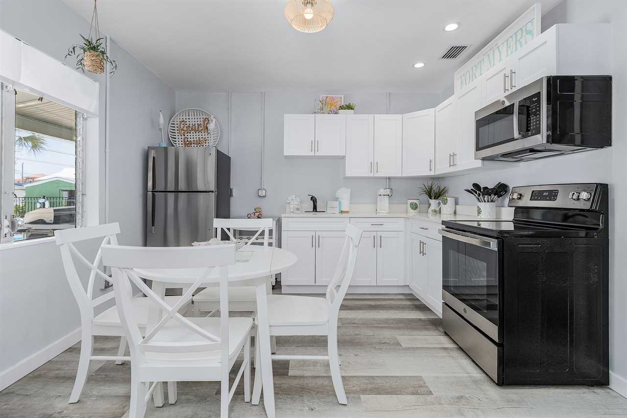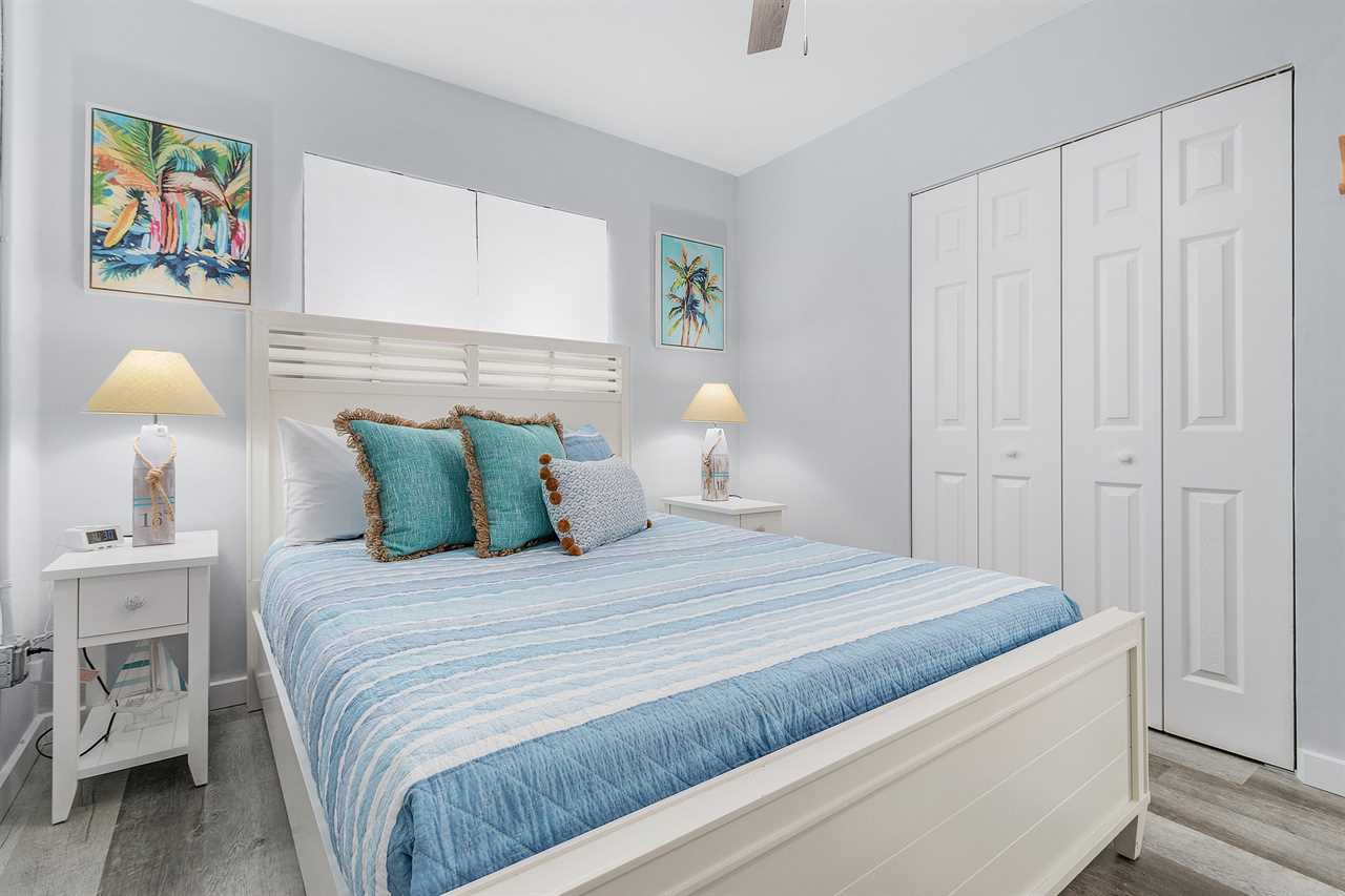 Upon arrival, there is ample off-street parking. Enter through the furnished screened-in front porch and into the open-plan kitchen, dining, and living areas. There is beautiful wood flooring throughout, and décor is a beachy motif. The kitchen has a quartz counter space, a stainless-steel sink, and well-stocked cabinets with everything necessary to cook full-course meals if desired. Appliances include a refrigerator/freezer, a 5-burner glass top range with a self-cleaning oven, a microwave oven, and a Keurig coffee maker. The dining area adjacent to the kitchen has a table seating four. This flows into the living area furnished with a queen-size sleeper sofa and area rug, as well as a corner accent table and lamp. Opposite the sofa are two matching side chairs and a wall-mounted large flat-screen TV.