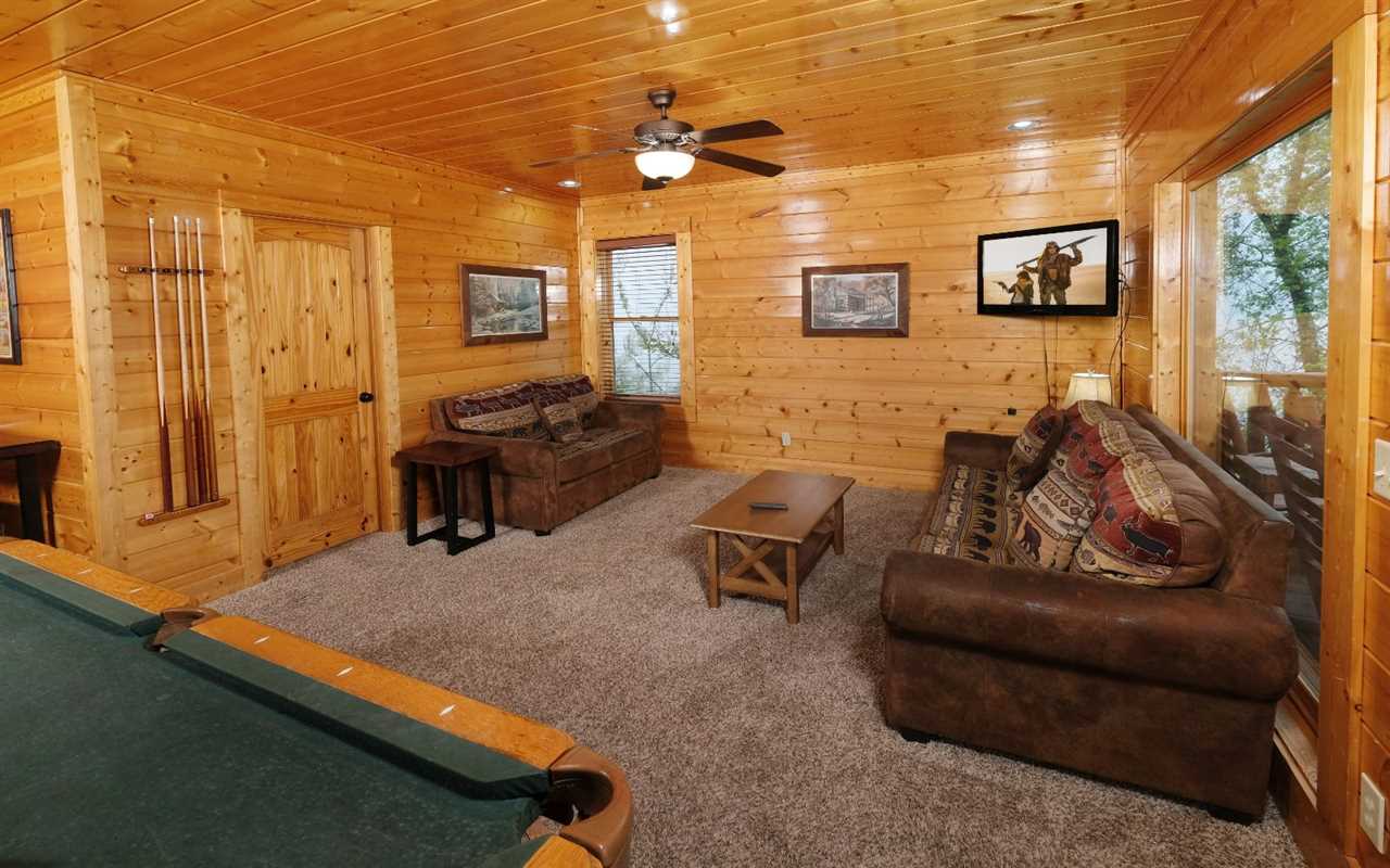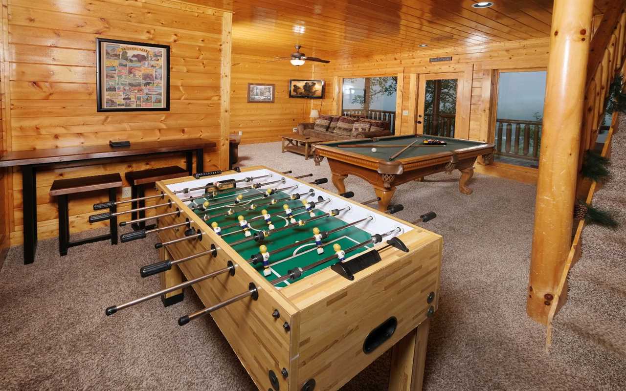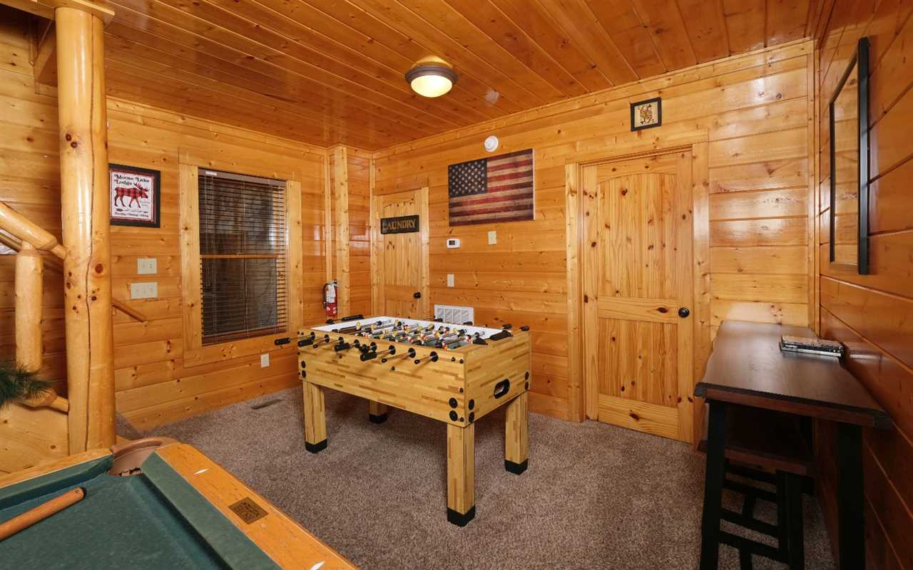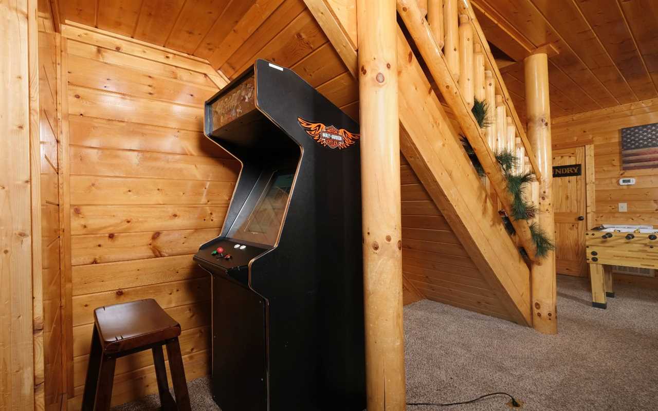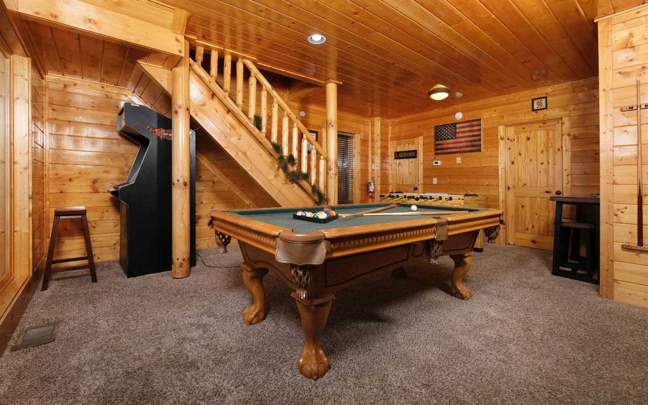 Pull up in the flat, paved driveway and step inside to get cozy in front of the electric (no heat) fireplace. Kick back in front of the big screen TV and pop in a DVD or Blu-ray movie – chosen from the movie library in the cabin. Have fun with pool, foosball, and arcade games in the rec room before enjoying a relaxing soak in the outdoor hot tub.
