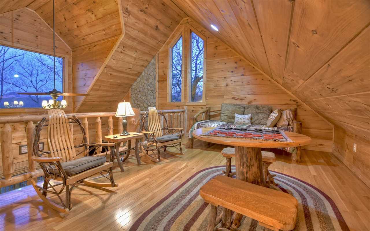 - Bonus loft with twin daybed, rocking chairs, and checker table