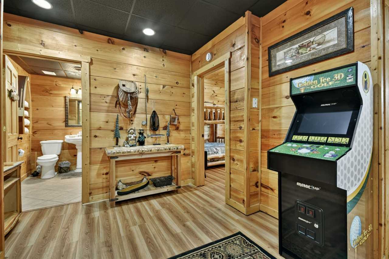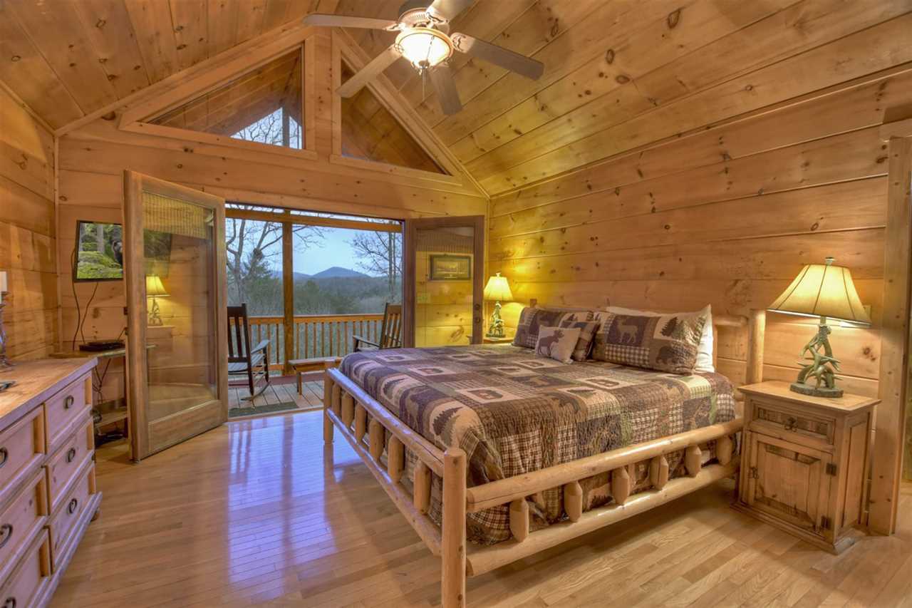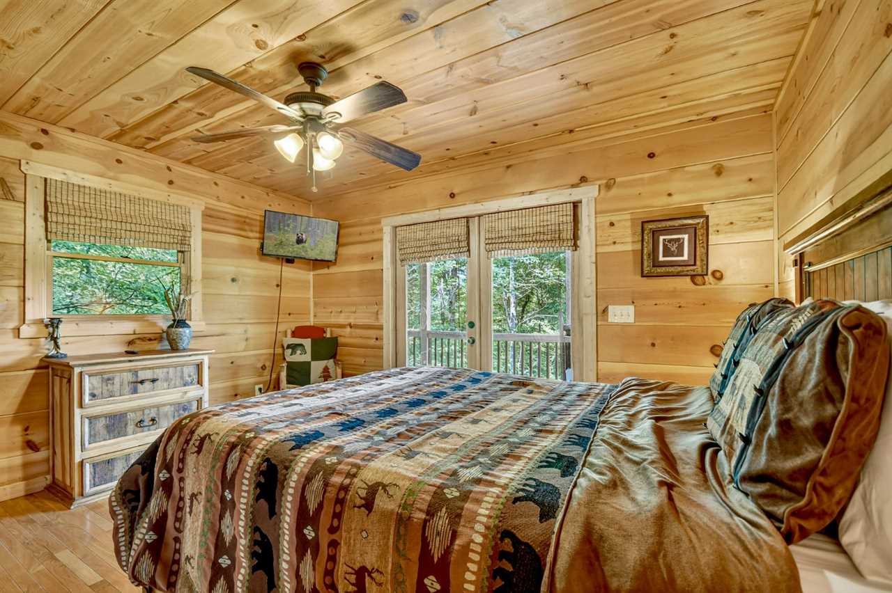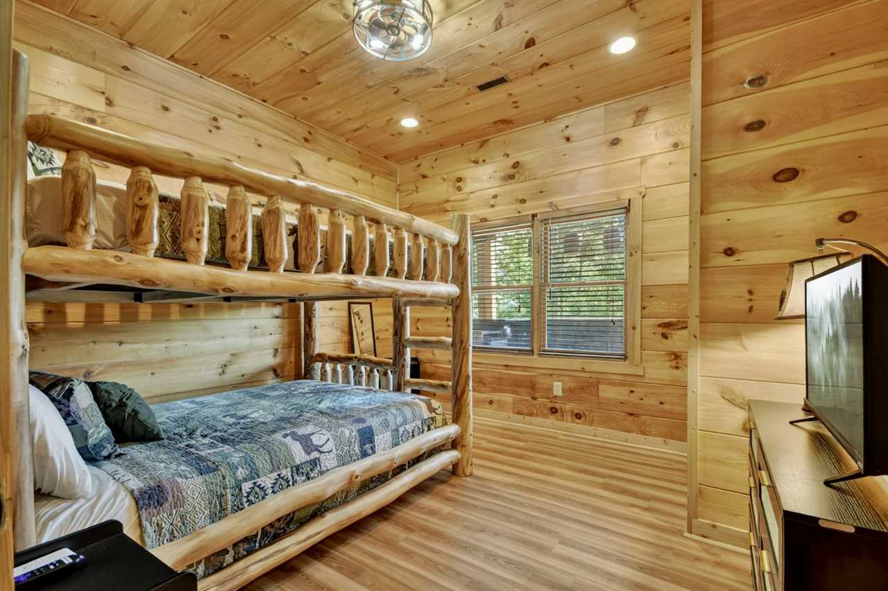 - Lower-level QUEEN-over-QUEEN log bunk room