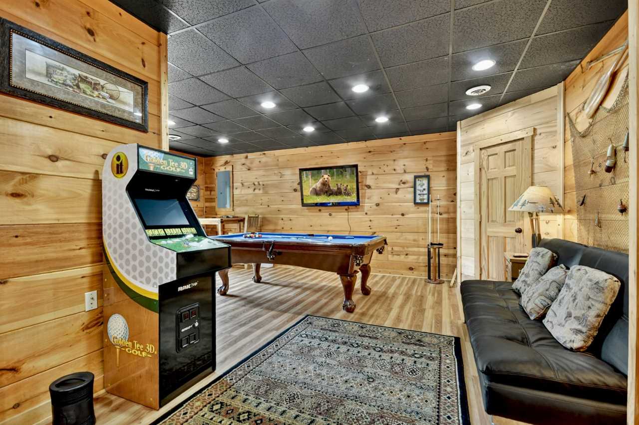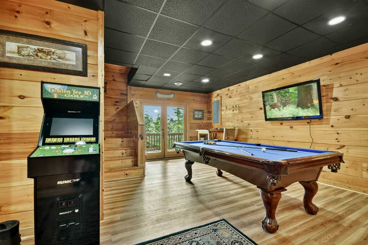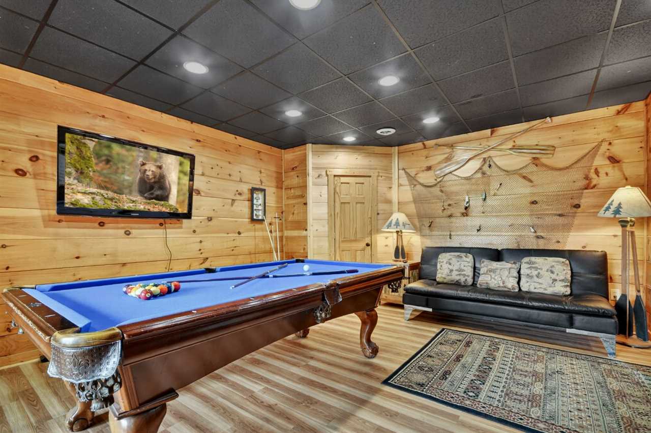 - Game room with pool table π±, pub table, big screen TV, and futon