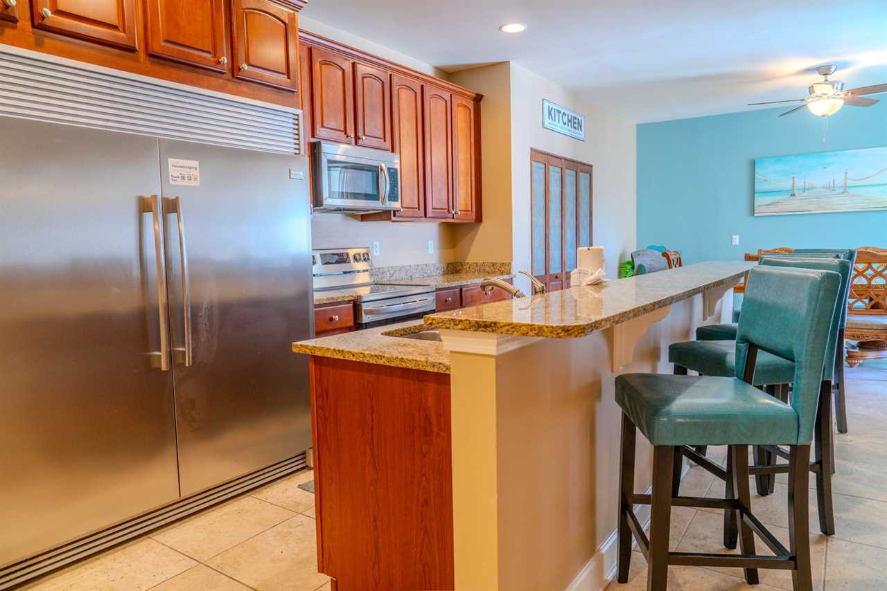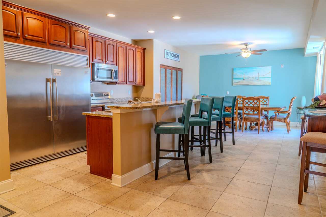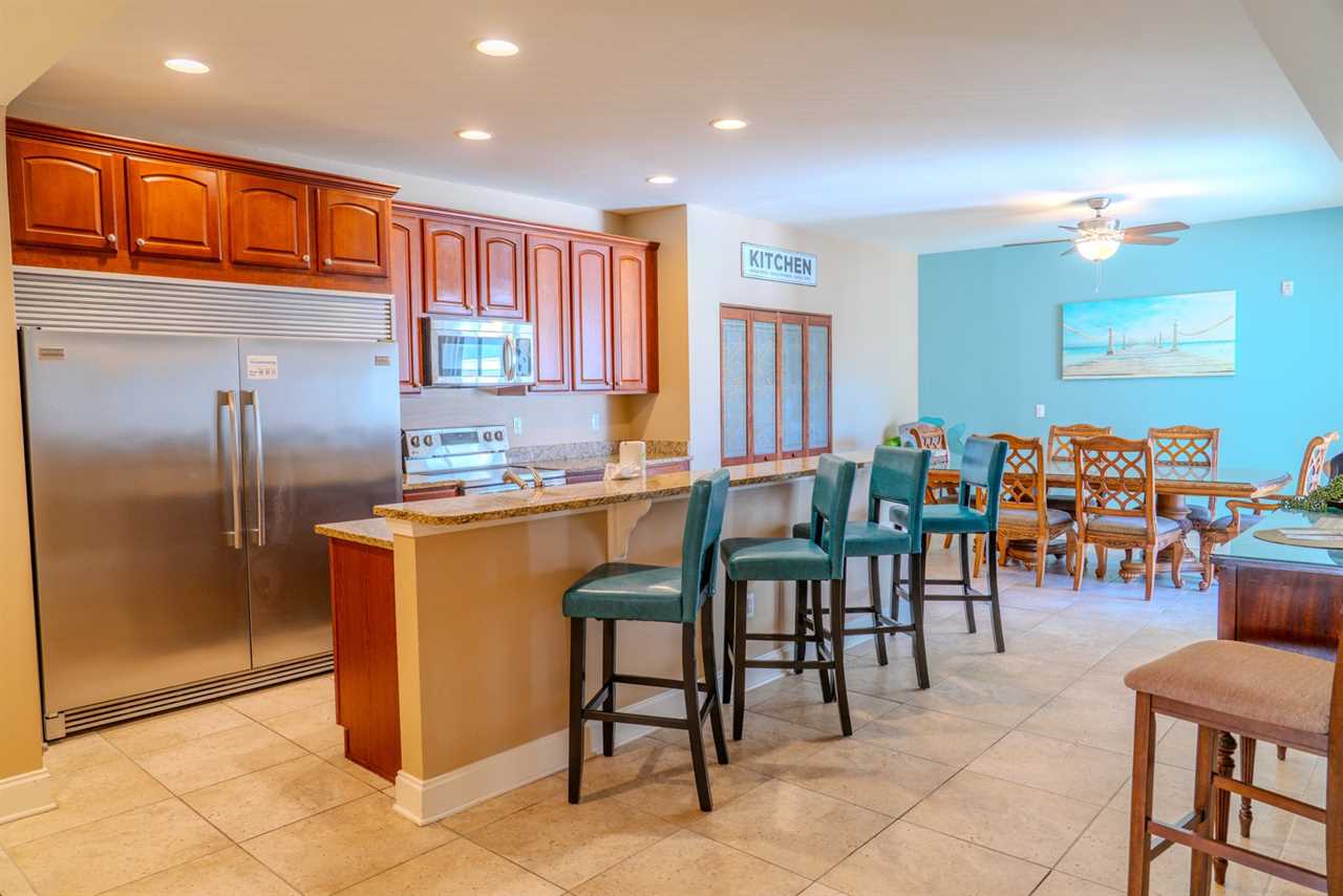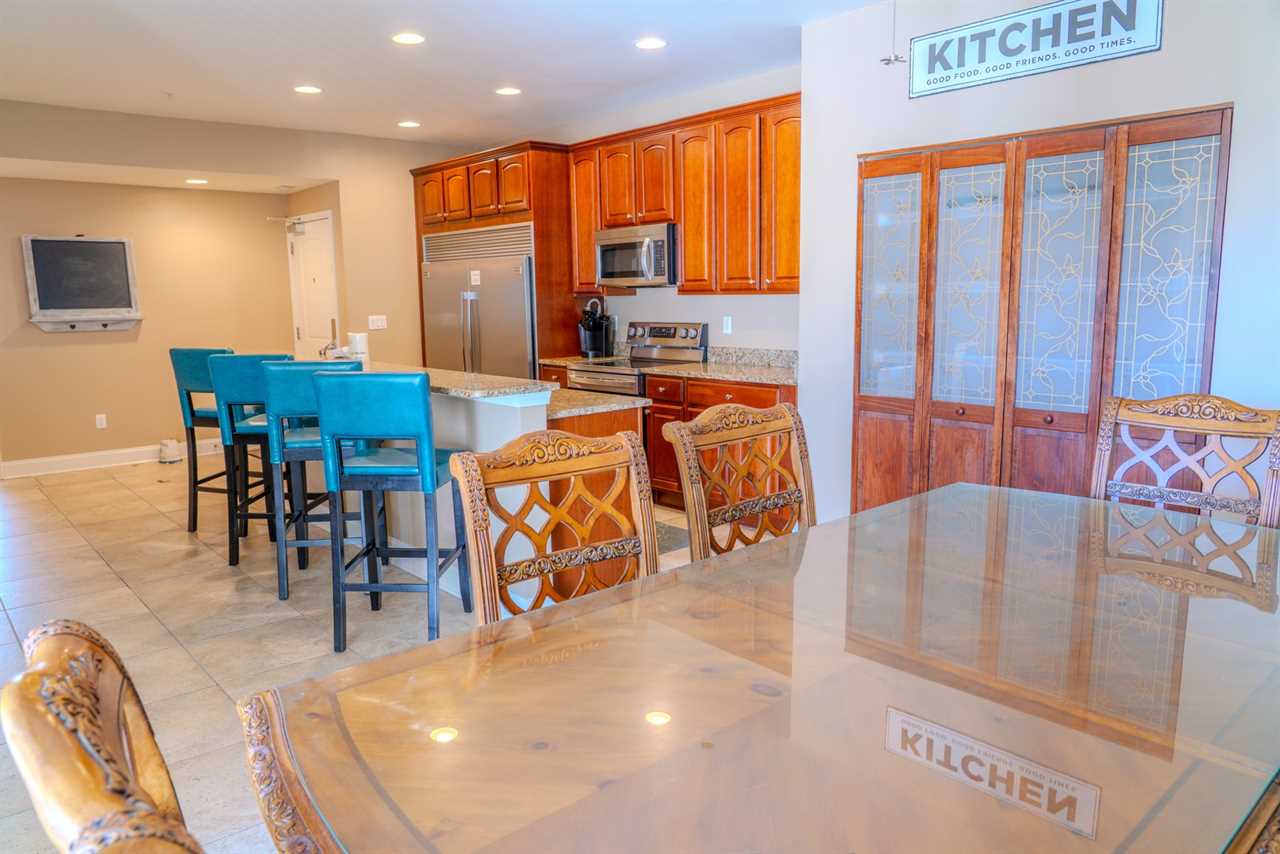 Upon arrival, guests will enter through the oversized kitchen. The kitchen features a large dining table, along with several dining chairs and bar stools. There is plenty of seating for everyone. Guests will enjoy full-sized stainless steel appliances, generous counter space, and ample cabinetry stocked with all the basic cookware and kitchen essentials. One of the main highlights of the kitchen is the oversized fridge and freezer. It's perfect for storing food and beverages for a group of 10. The kitchen also features granite countertops, and a small balcony is accessible from the kitchen area.
