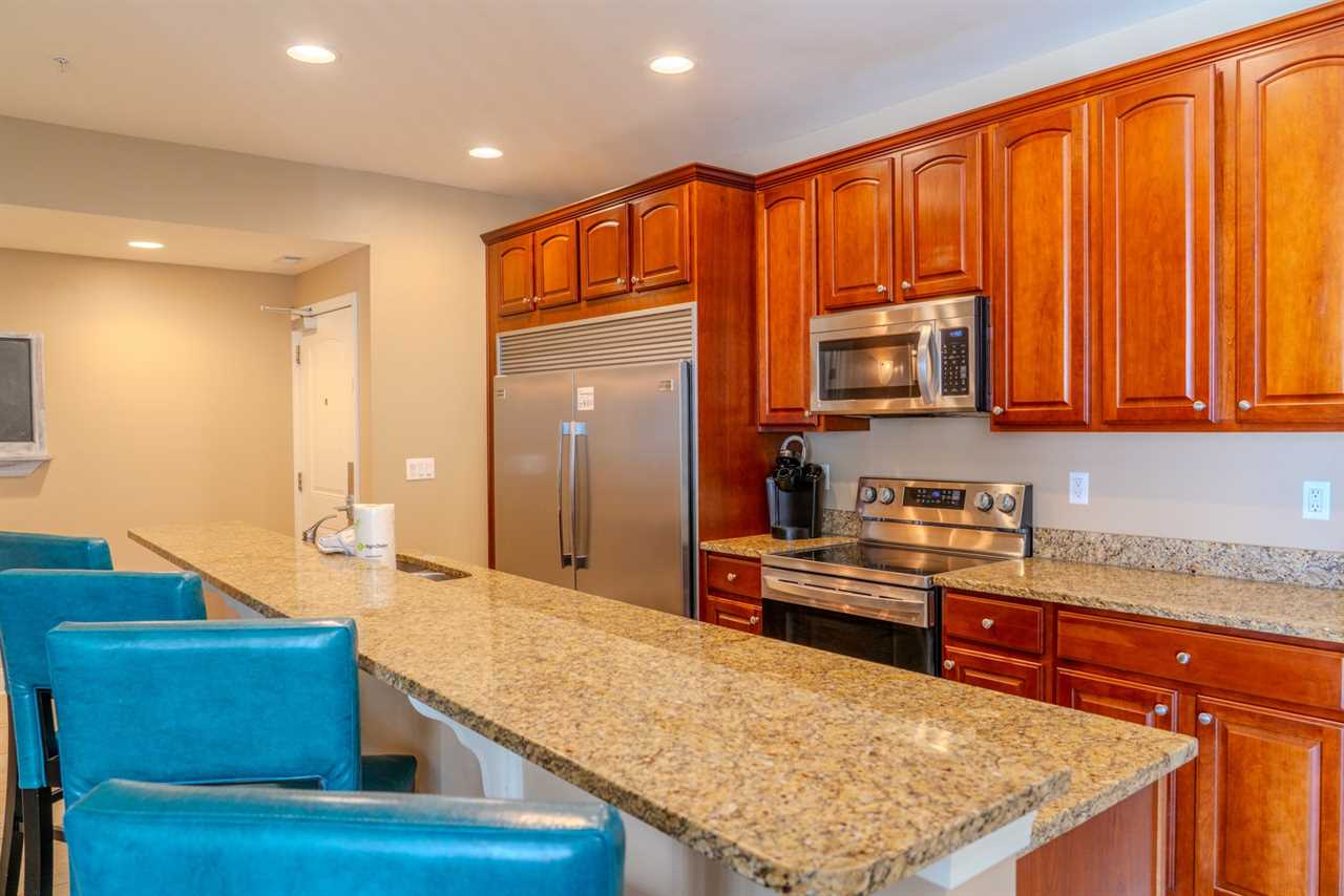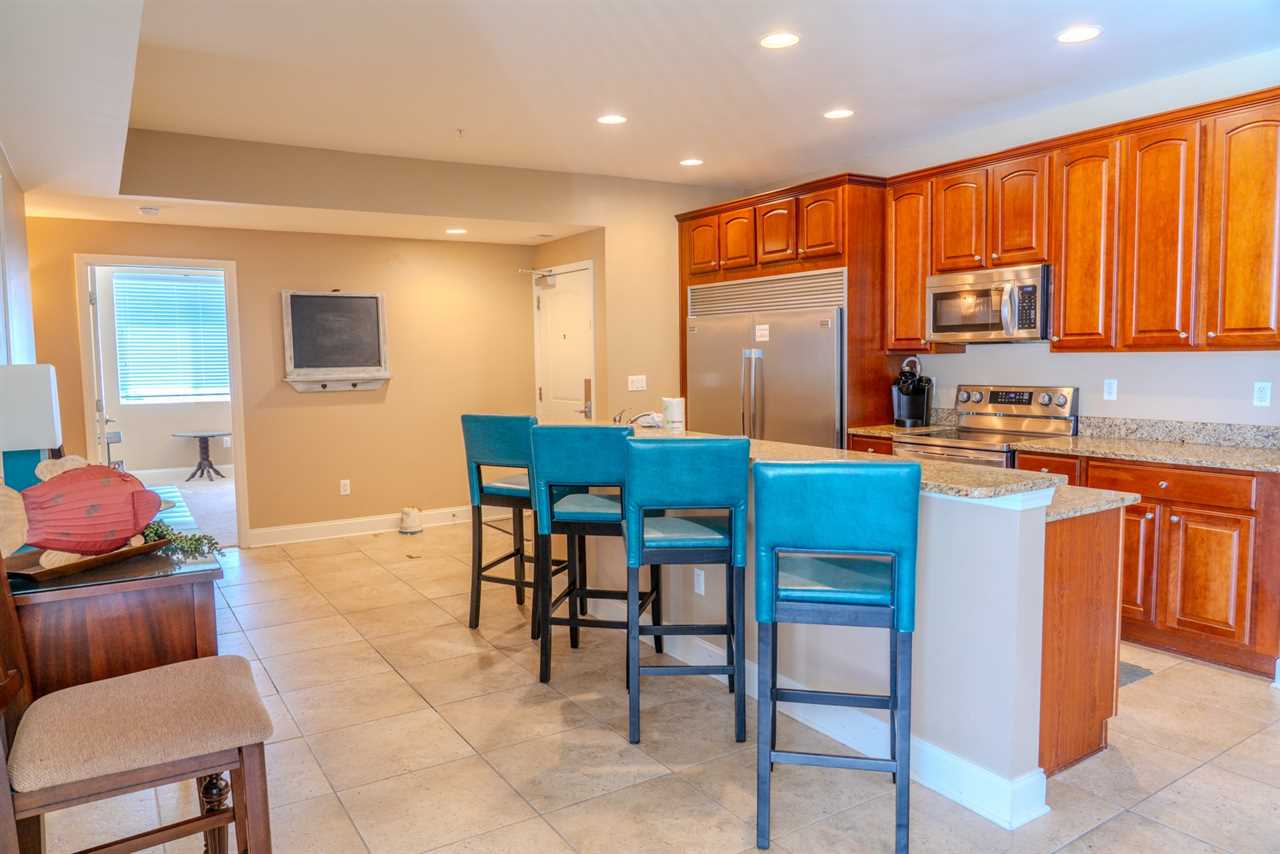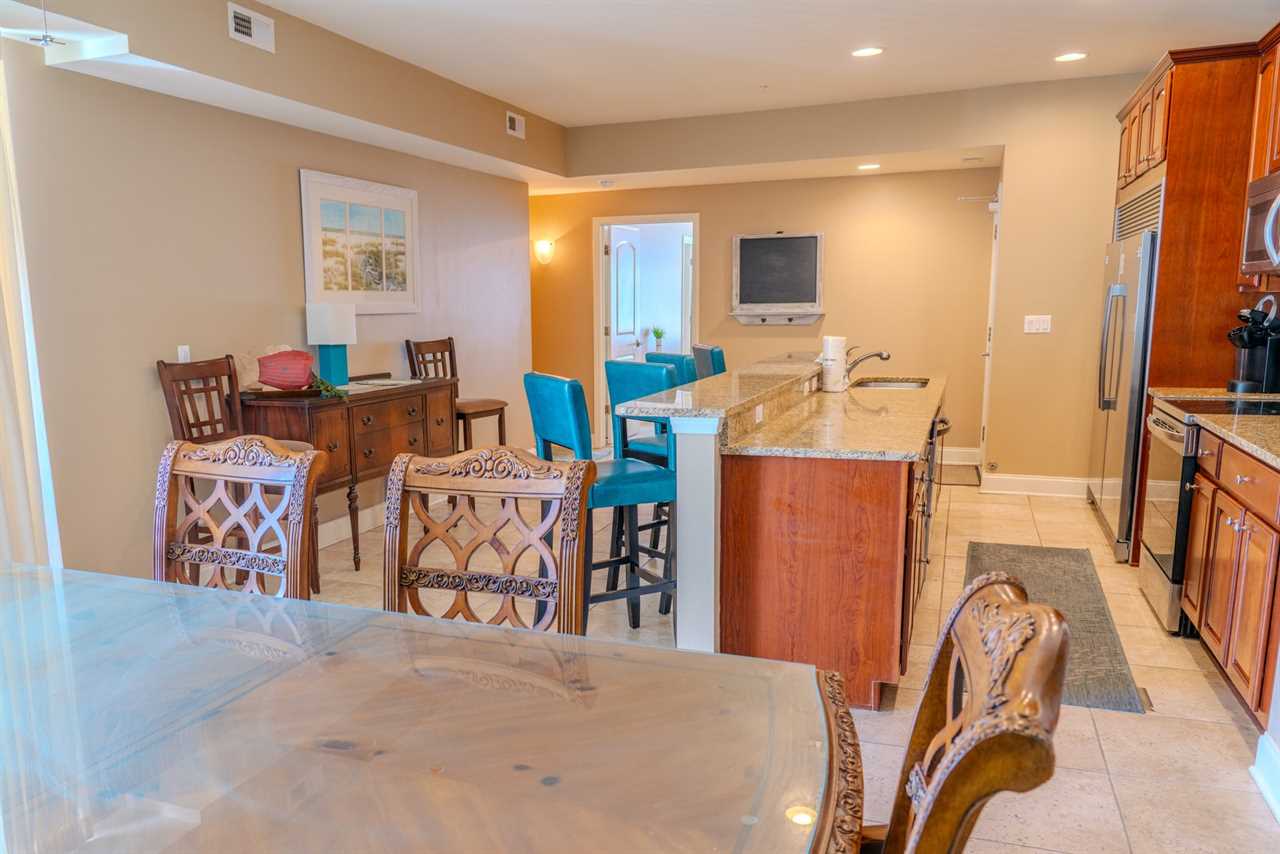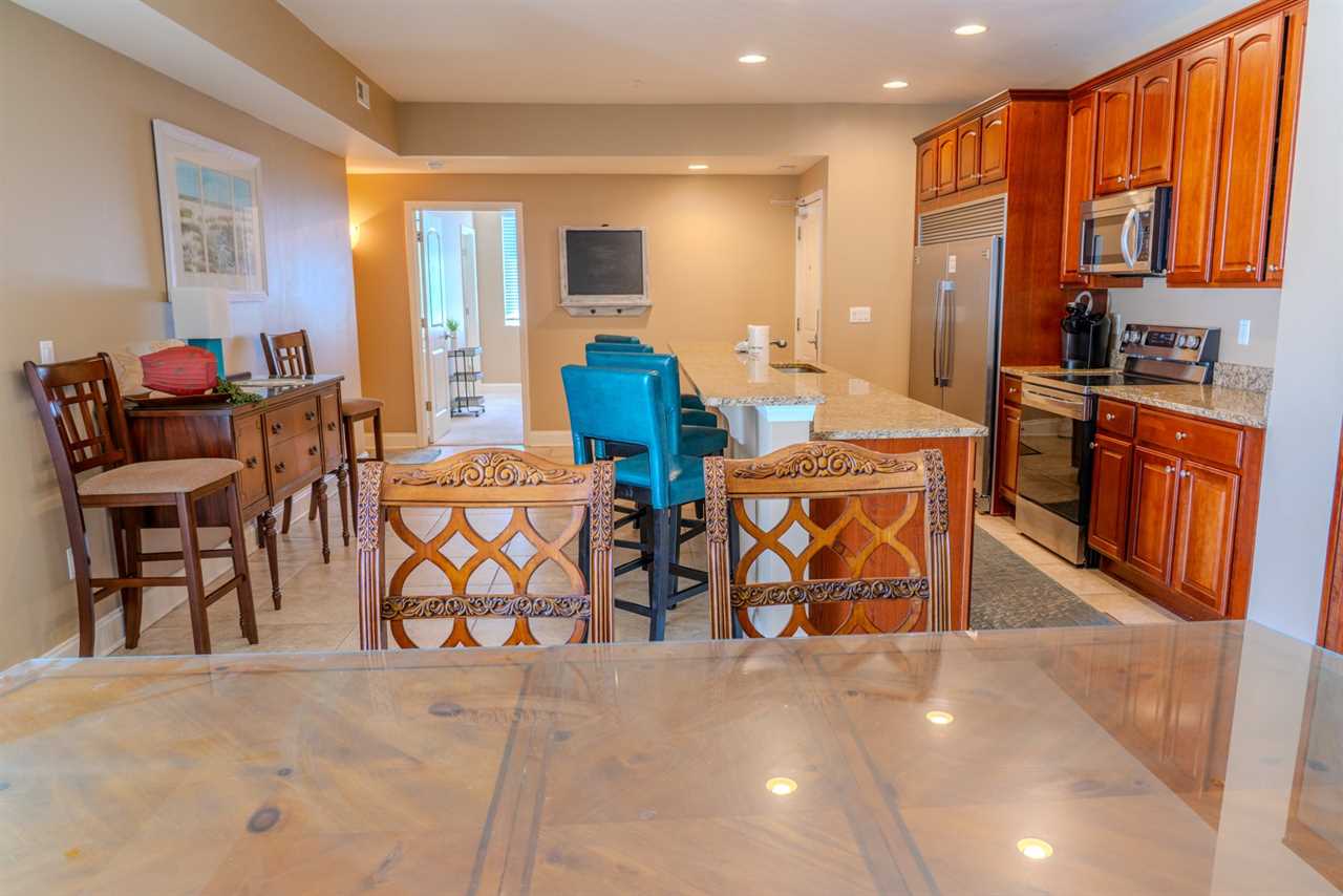 Upon arrival, guests will enter through the oversized kitchen. The kitchen features a large dining table, along with several dining chairs and bar stools. There is plenty of seating for everyone. Guests will enjoy full-sized stainless steel appliances, generous counter space, and ample cabinetry stocked with all the basic cookware and kitchen essentials. One of the main highlights of the kitchen is the oversized fridge and freezer. It's perfect for storing food and beverages for a group of 10. The kitchen also features granite countertops, and a small balcony is accessible from the kitchen area.