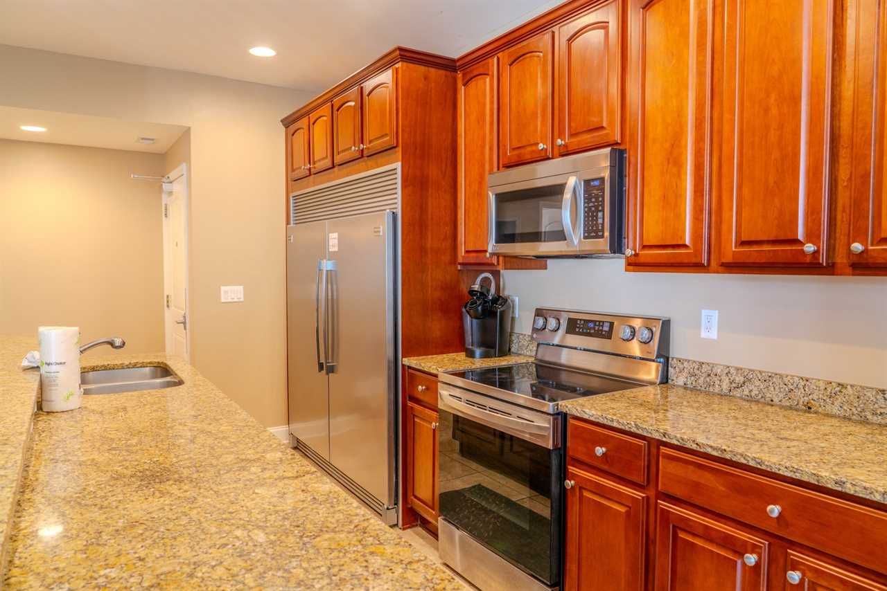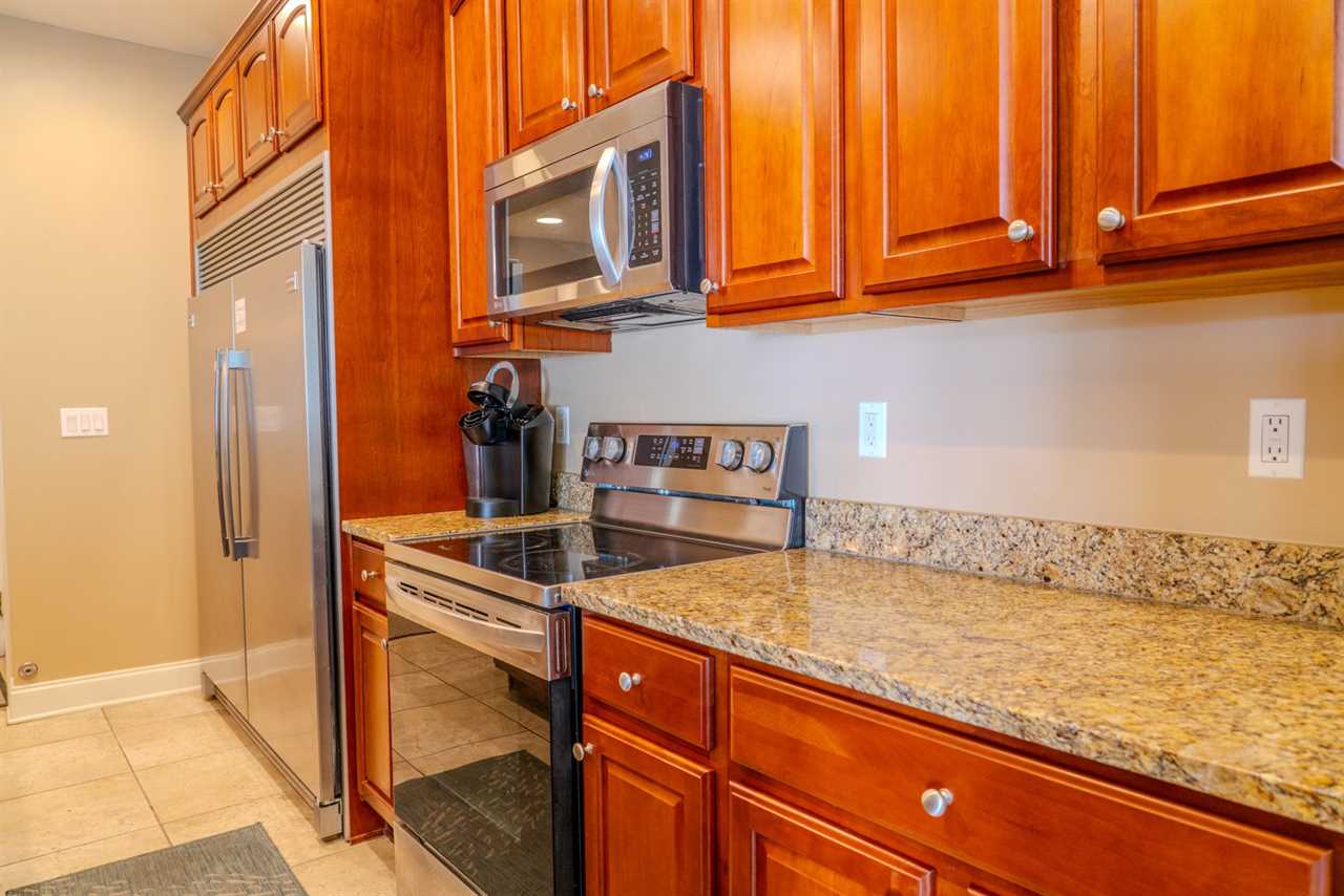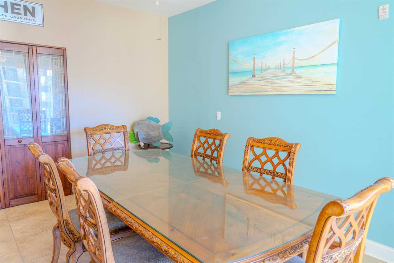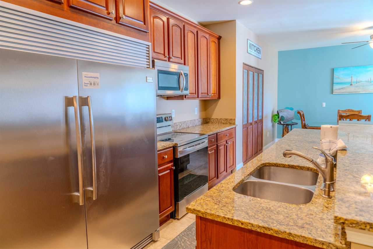 Upon arrival, guests will enter through the oversized kitchen. The kitchen features a large dining table, along with several dining chairs and bar stools. There is plenty of seating for everyone. Guests will enjoy full-sized stainless steel appliances, generous counter space, and ample cabinetry stocked with all the basic cookware and kitchen essentials. One of the main highlights of the kitchen is the oversized fridge and freezer. It's perfect for storing food and beverages for a group of 10. The kitchen also features granite countertops, and a small balcony is accessible from the kitchen area.