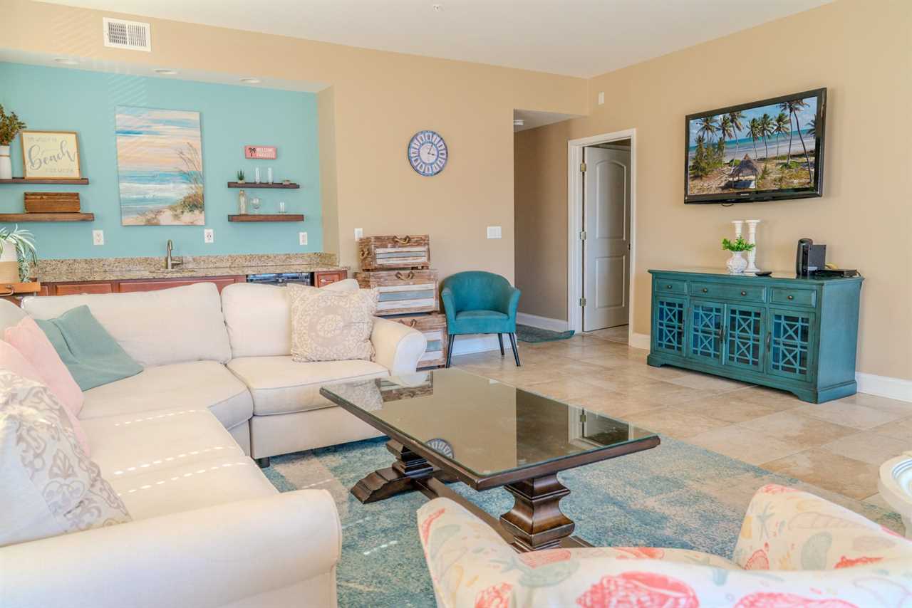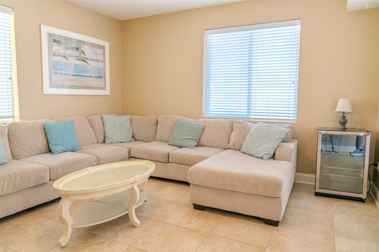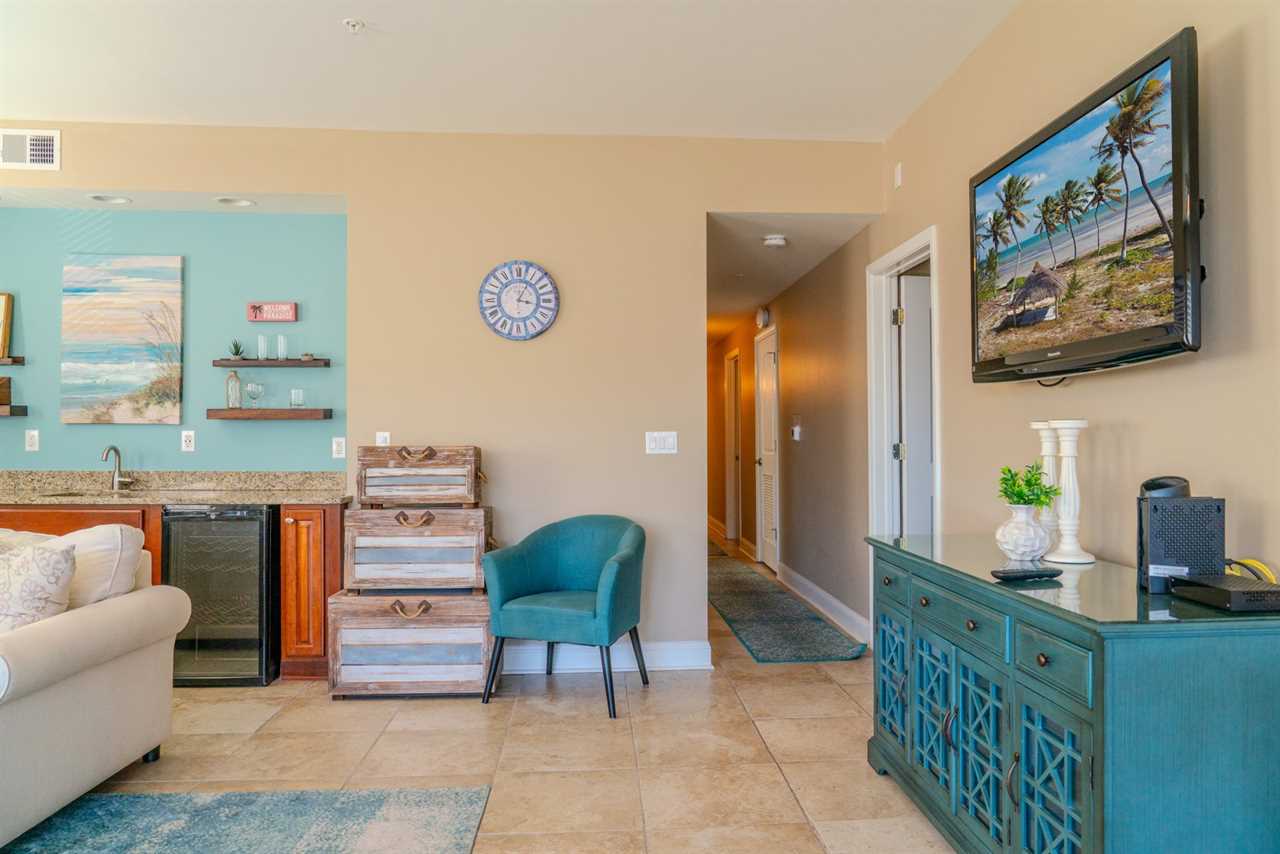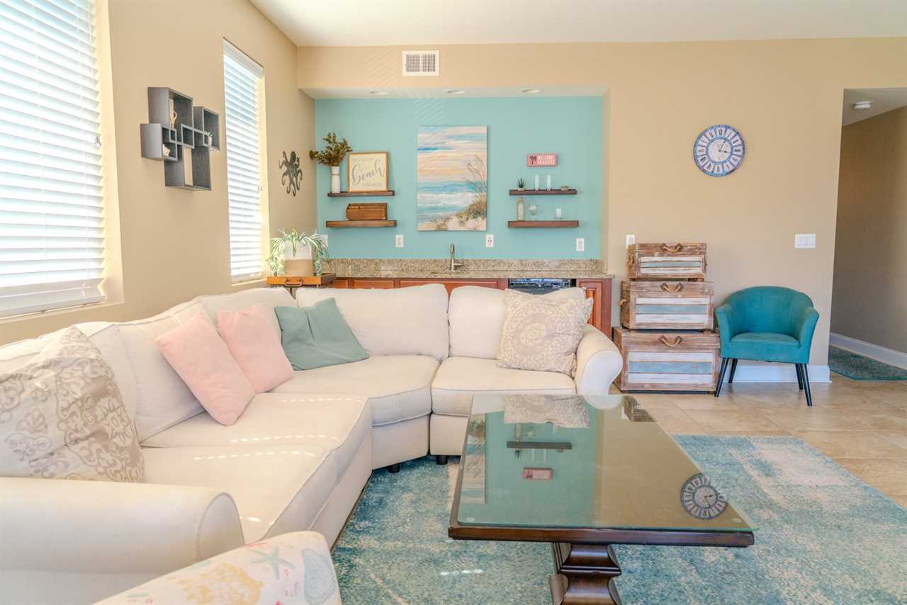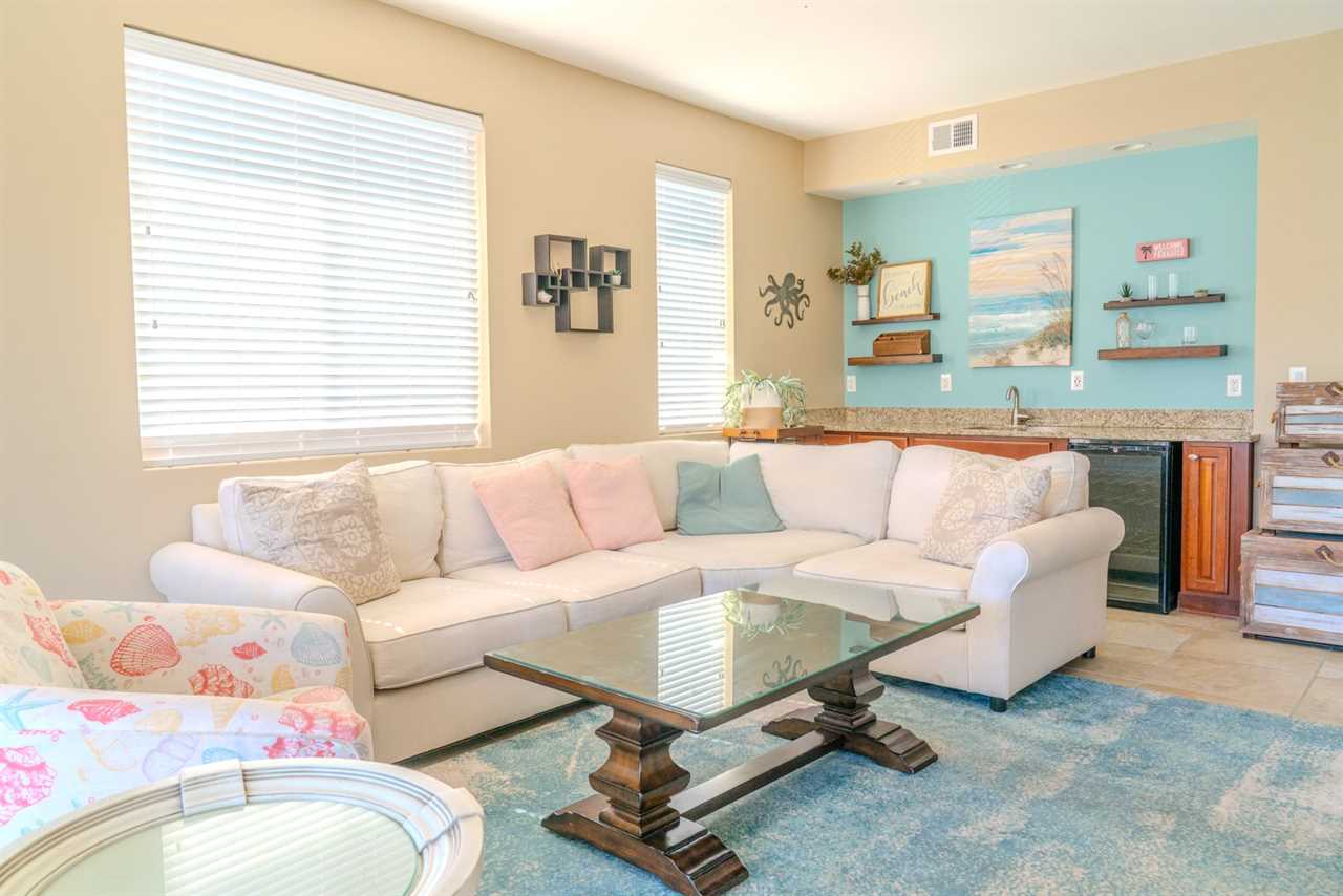 At the front of the condo is the main living area. This condo features two separate living spaces, making it the perfect setup for a large group. Both living areas are fully furnished, and one includes a wet bar. Please note that the beverages shown in the photos are not included in the rental. Guests will have access to two large sofas, accent chairs, an entertainment center, a TV with cable, and access to the private balcony.