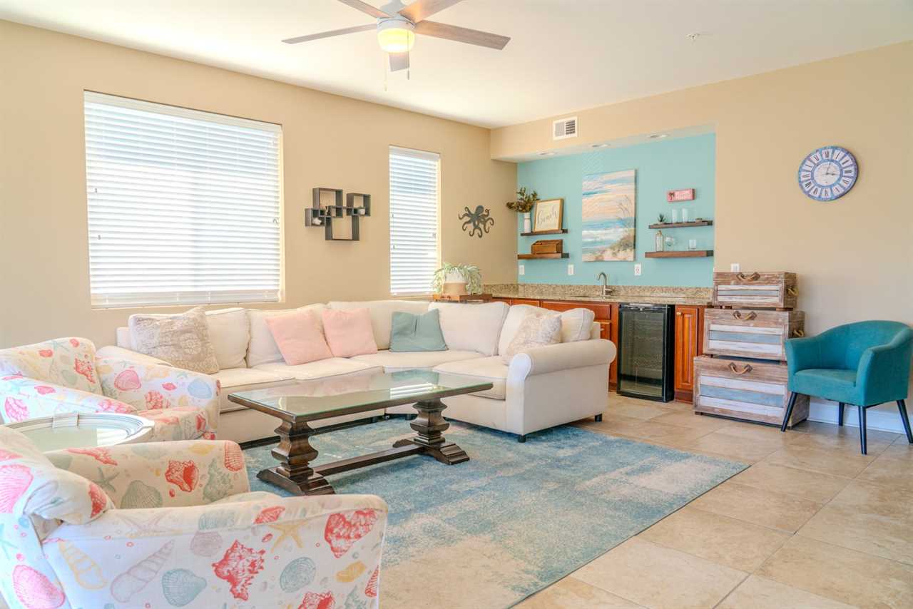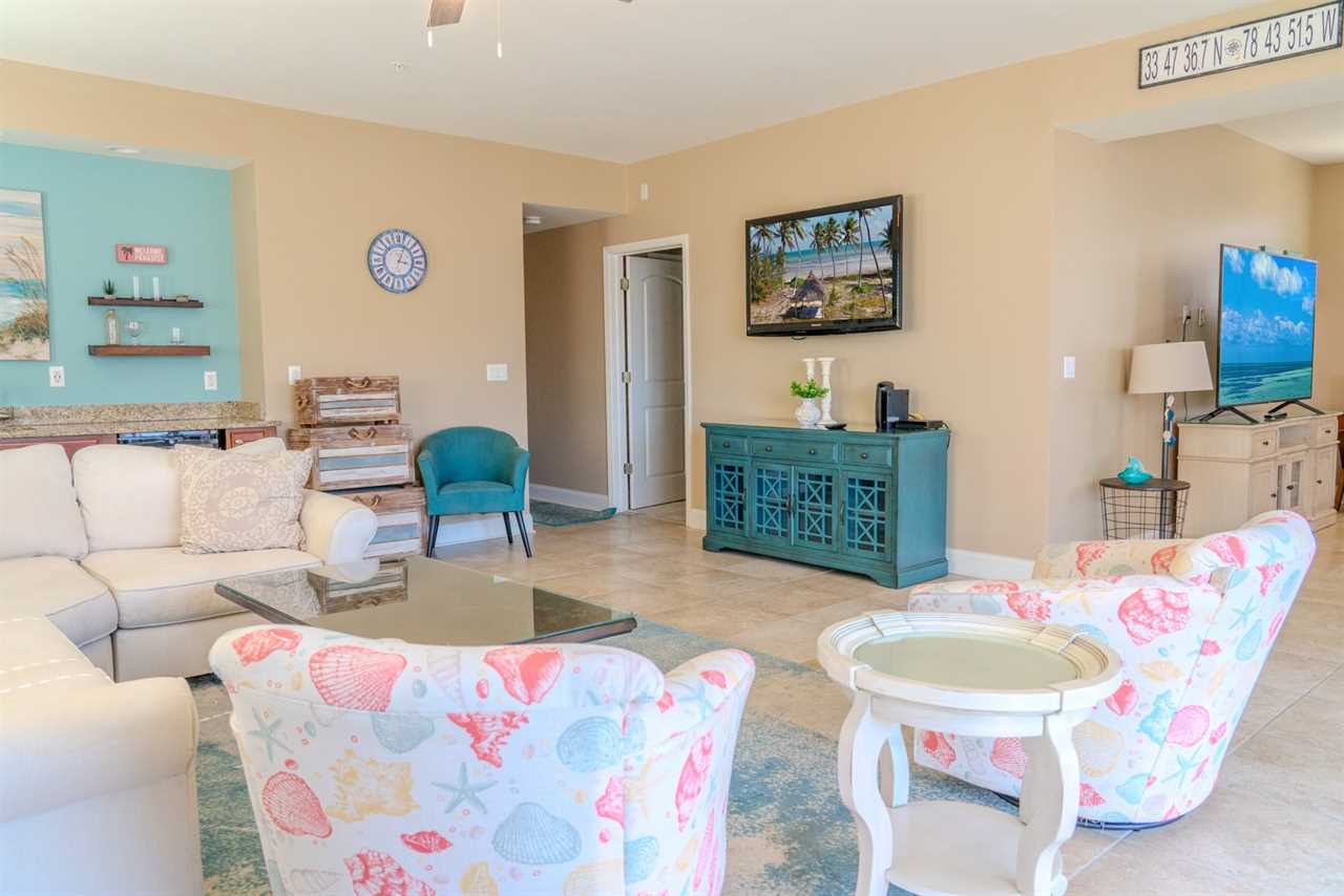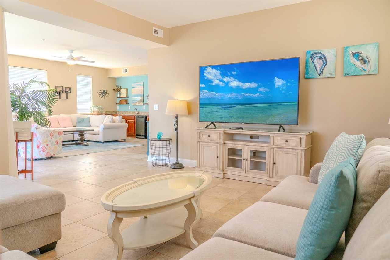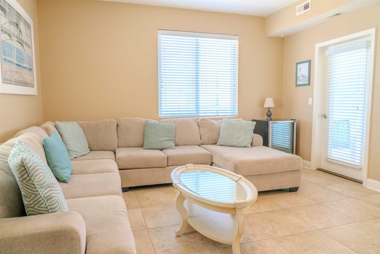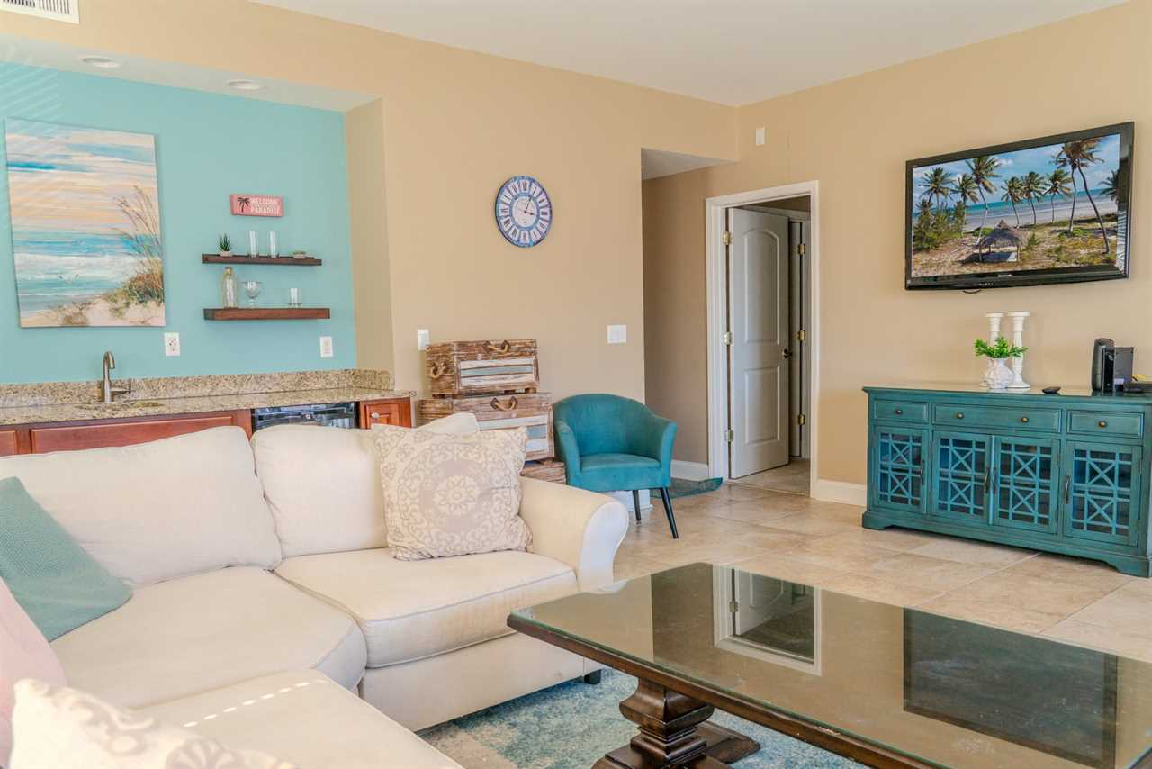 At the front of the condo is the main living area. This condo features two separate living spaces, making it the perfect setup for a large group. Both living areas are fully furnished, and one includes a wet bar. Please note that the beverages shown in the photos are not included in the rental. Guests will have access to two large sofas, accent chairs, an entertainment center, a TV with cable, and access to the private balcony.