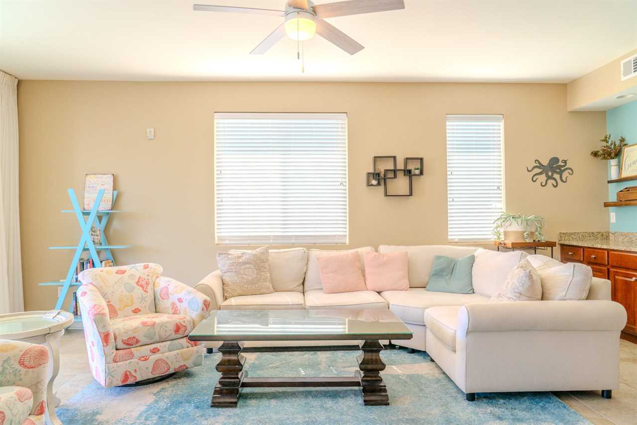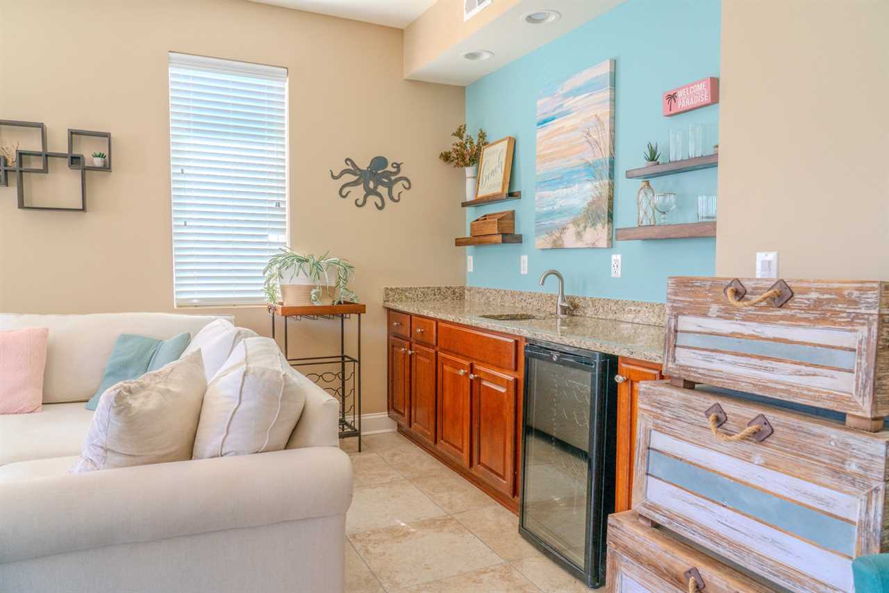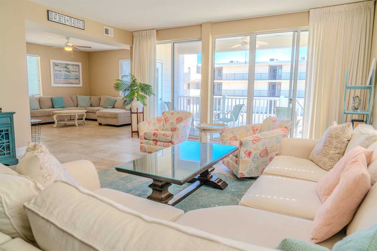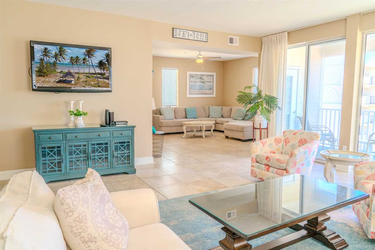 At the front of the condo is the main living area. This condo features two separate living spaces, making it the perfect setup for a large group. Both living areas are fully furnished, and one includes a wet bar. Please note that the beverages shown in the photos are not included in the rental. Guests will have access to two large sofas, accent chairs, an entertainment center, a TV with cable, and access to the private balcony.