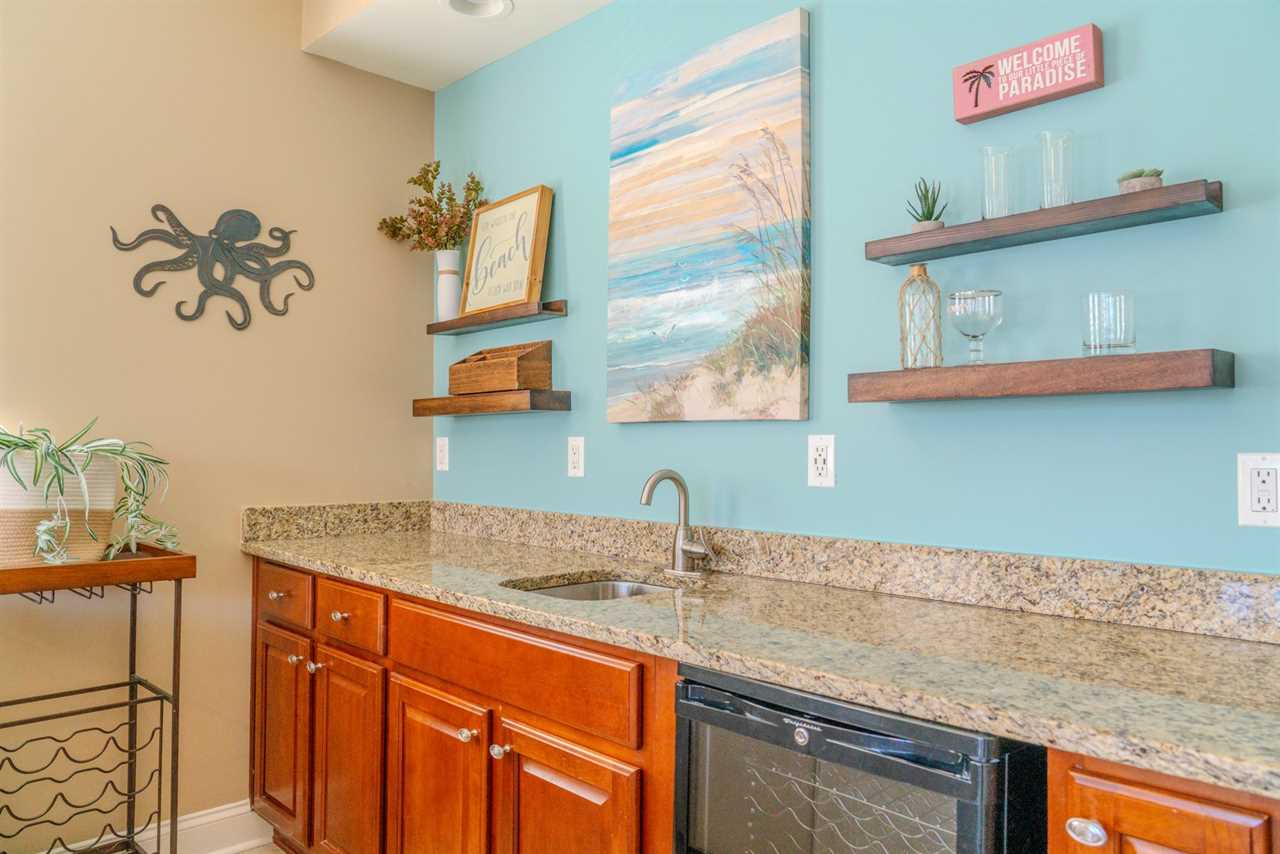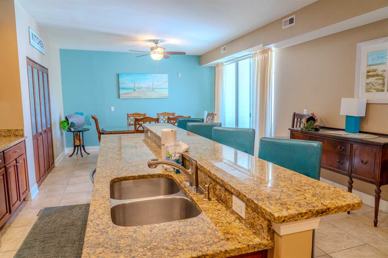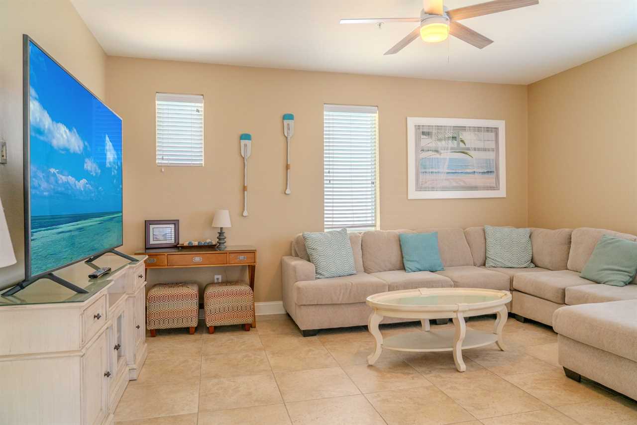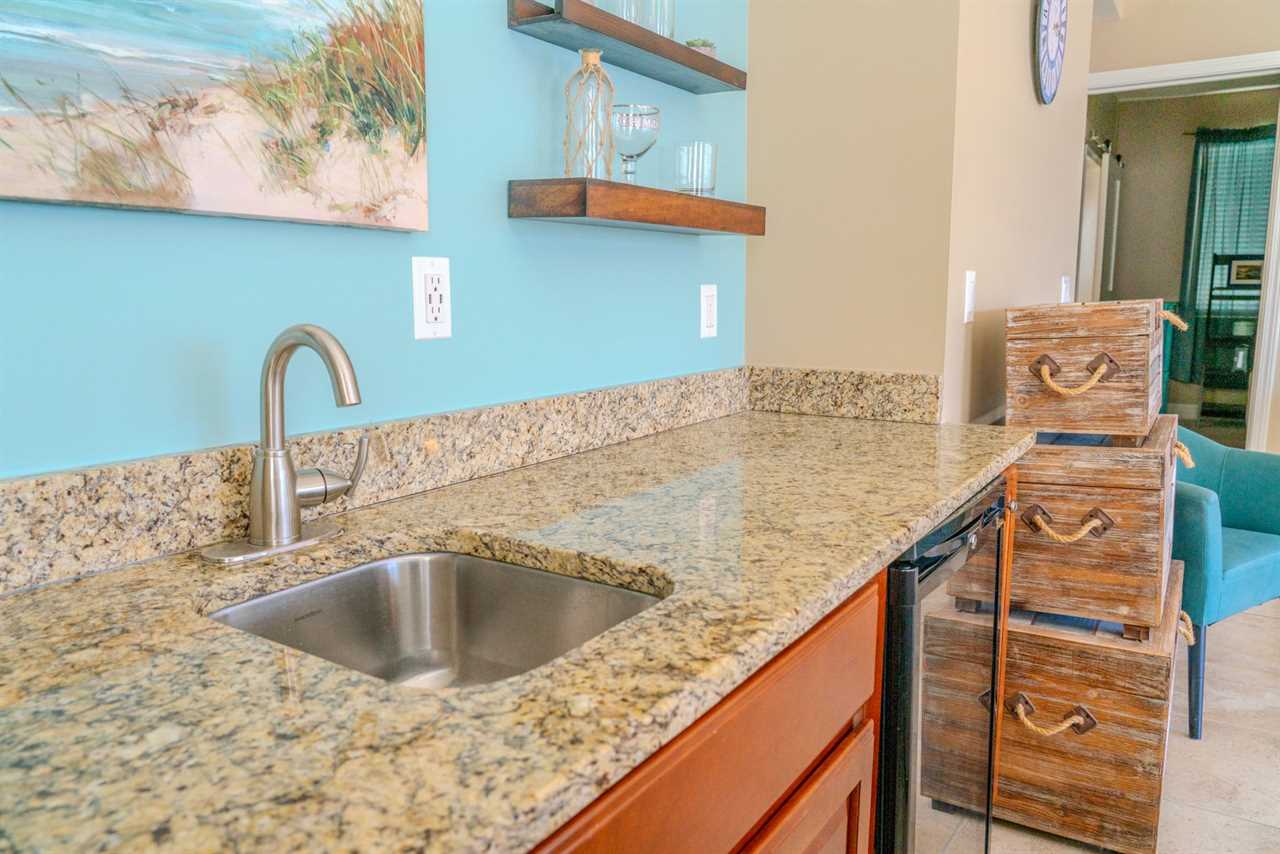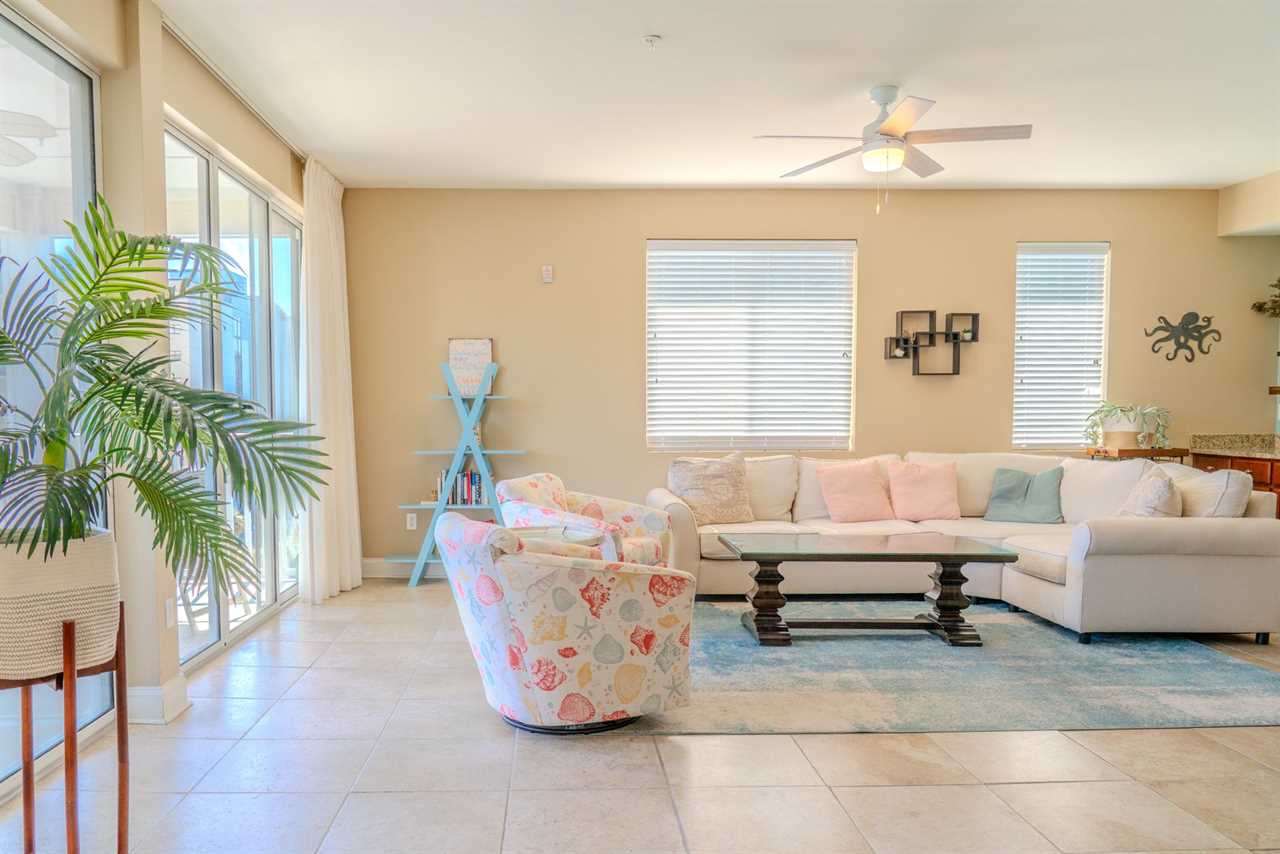 At the front of the condo is the main living area. This condo features two separate living spaces, making it the perfect setup for a large group. Both living areas are fully furnished, and one includes a wet bar. Please note that the beverages shown in the photos are not included in the rental. Guests will have access to two large sofas, accent chairs, an entertainment center, a TV with cable, and access to the private balcony.