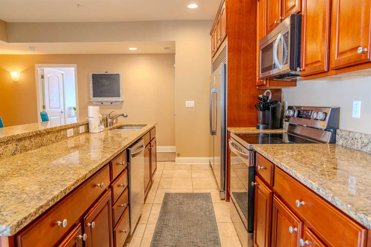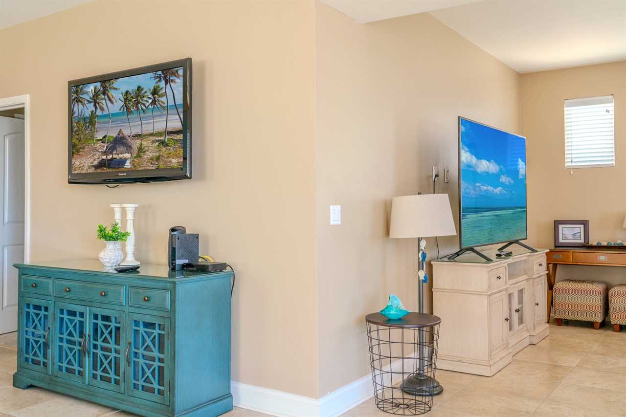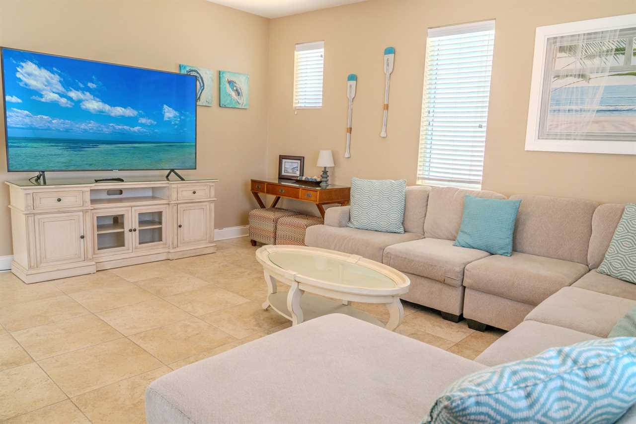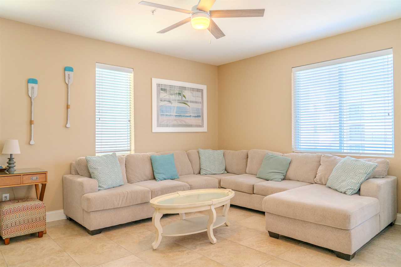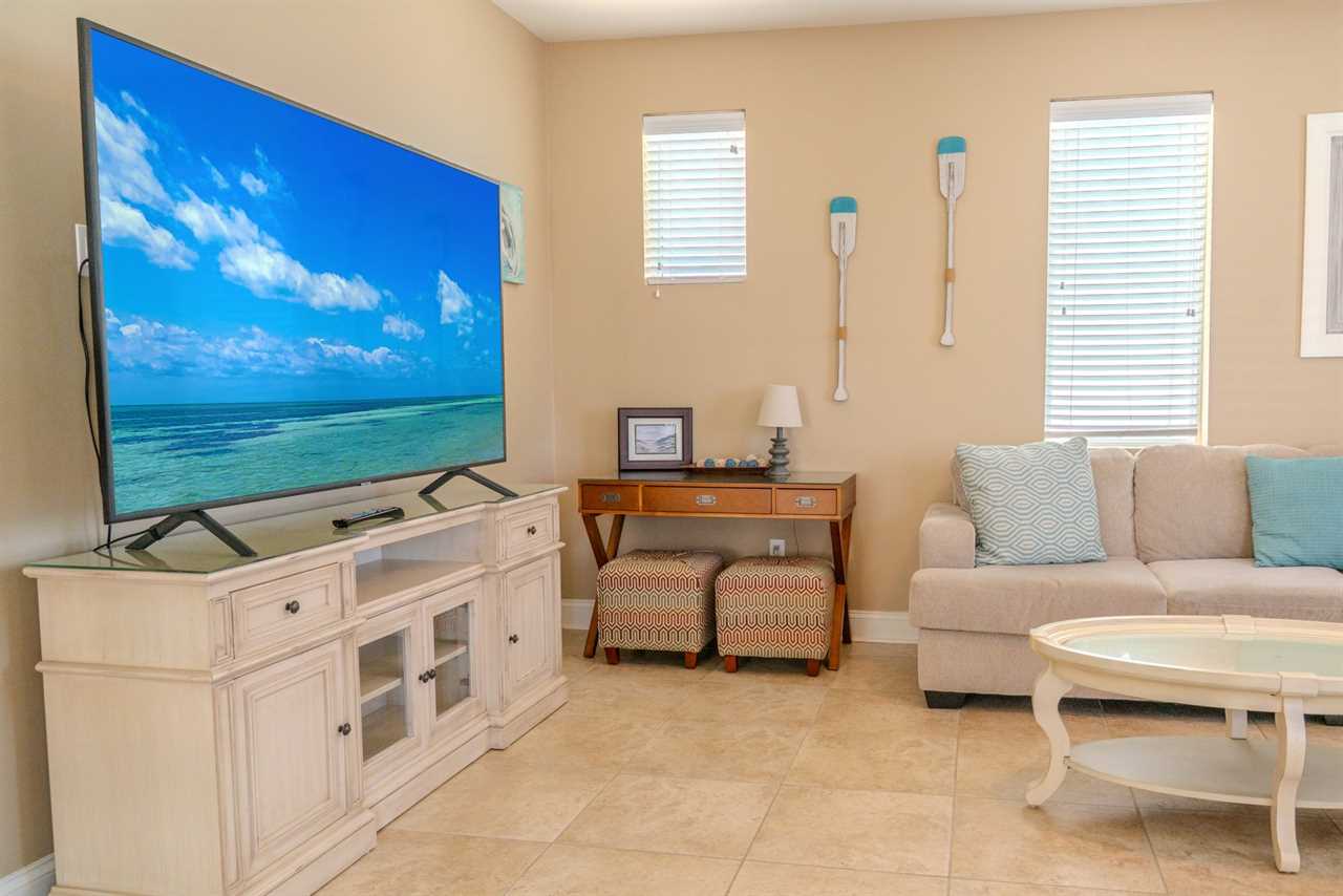 At the front of the condo is the main living area. This condo features two separate living spaces, making it the perfect setup for a large group. Both living areas are fully furnished, and one includes a wet bar. Please note that the beverages shown in the photos are not included in the rental. Guests will have access to two large sofas, accent chairs, an entertainment center, a TV with cable, and access to the private balcony.