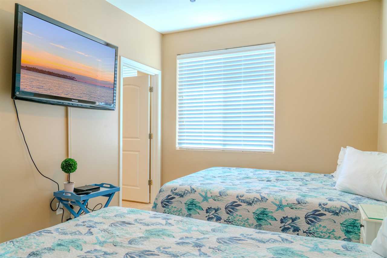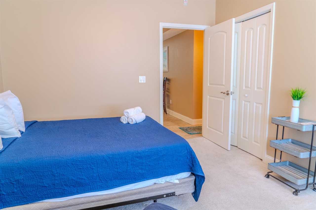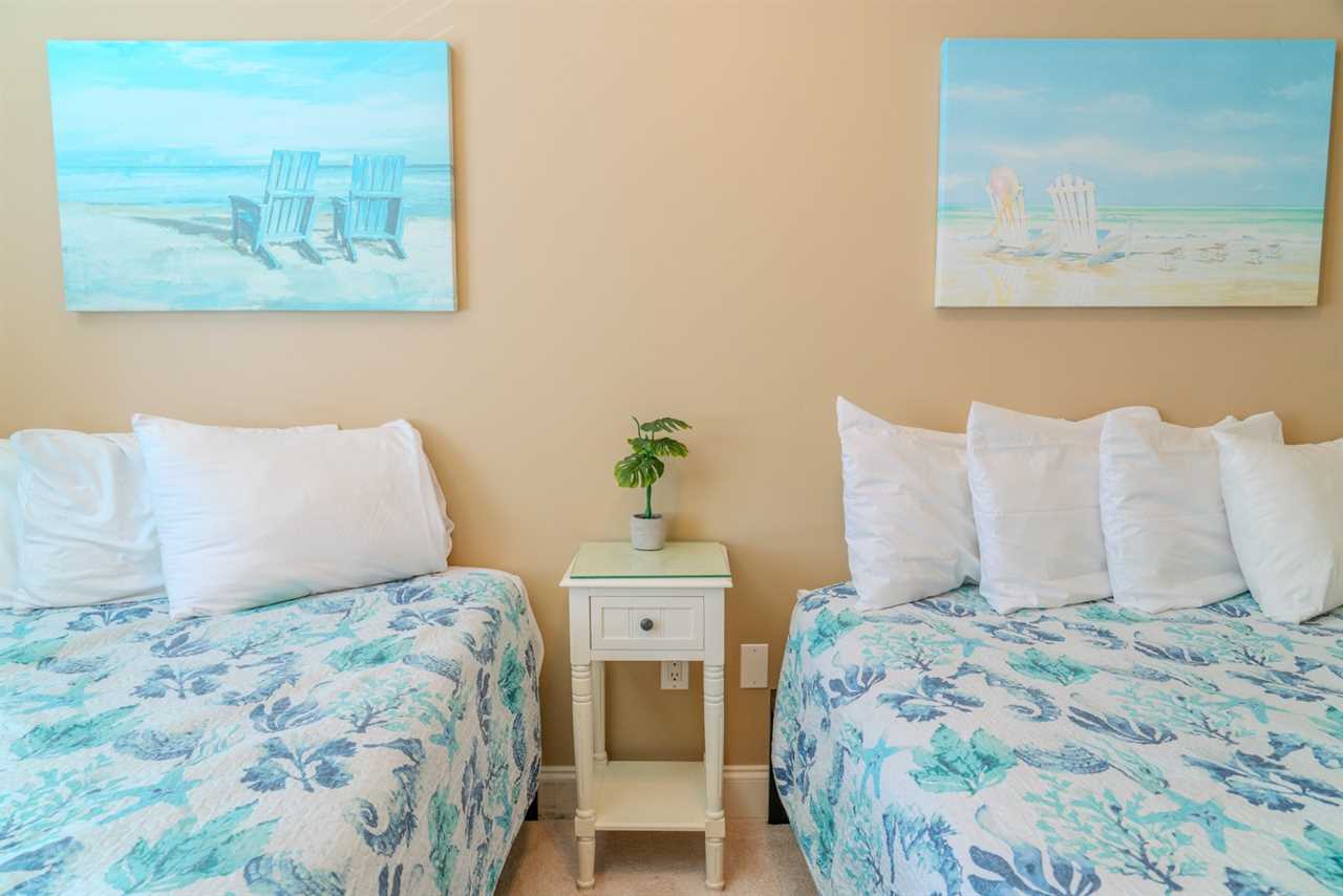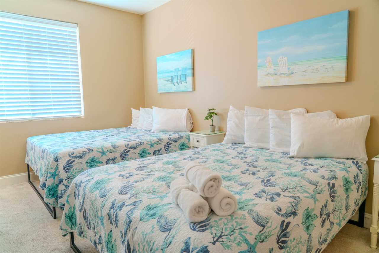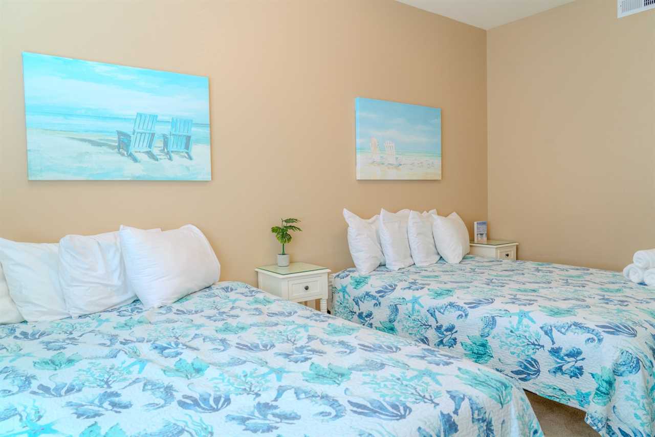 As you make your way through the condo, you'll find a total of four bedrooms. Each bedroom includes its own closet, dresser, and full-size bathroom. The bedroom layouts and bed sizes are as follows: