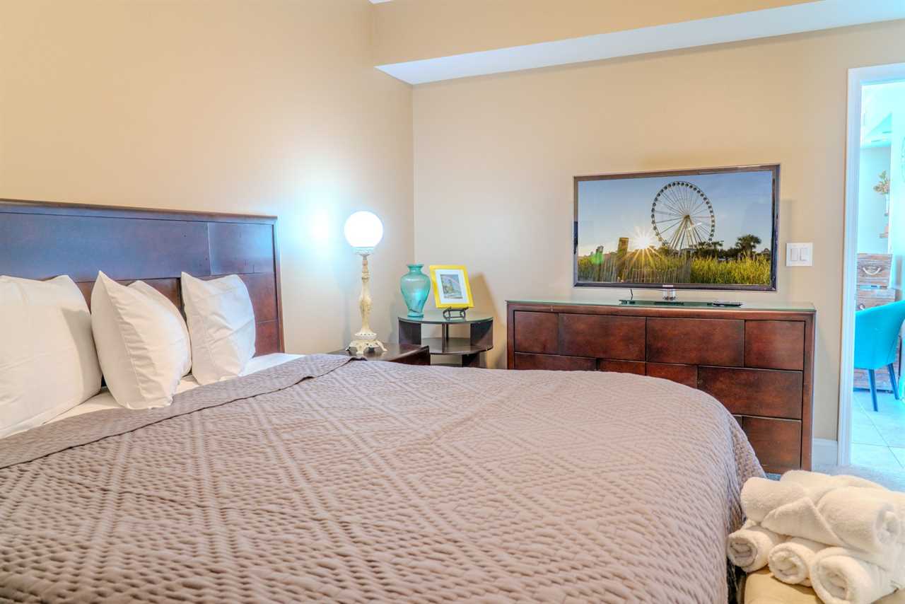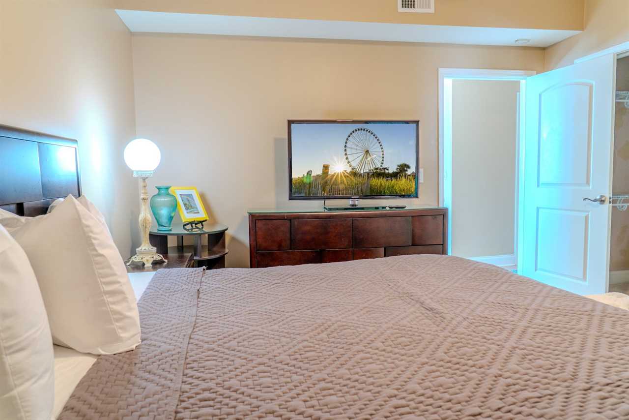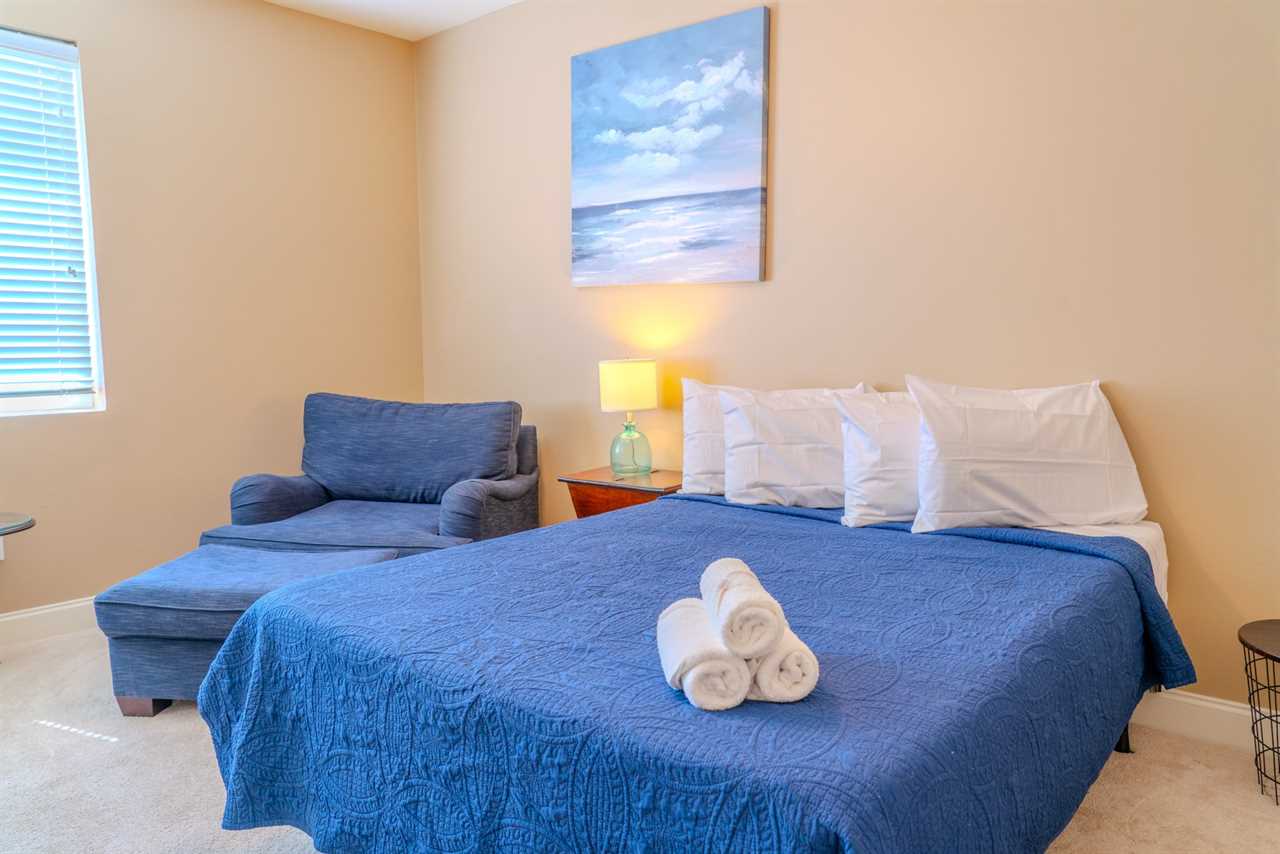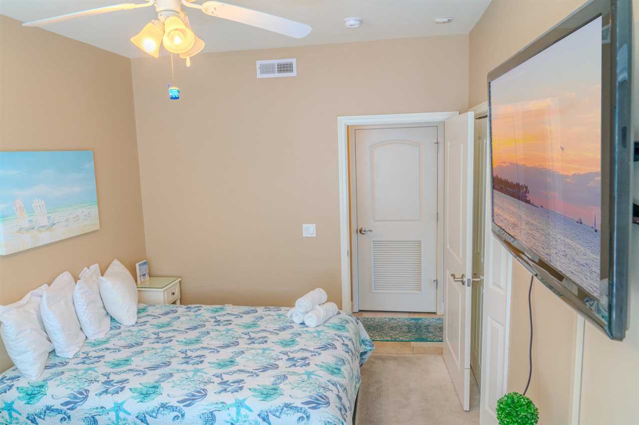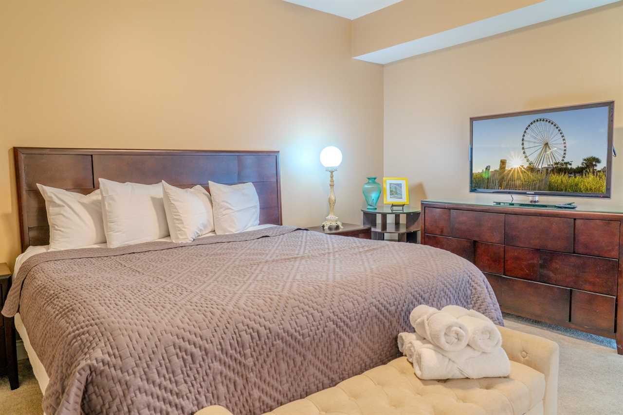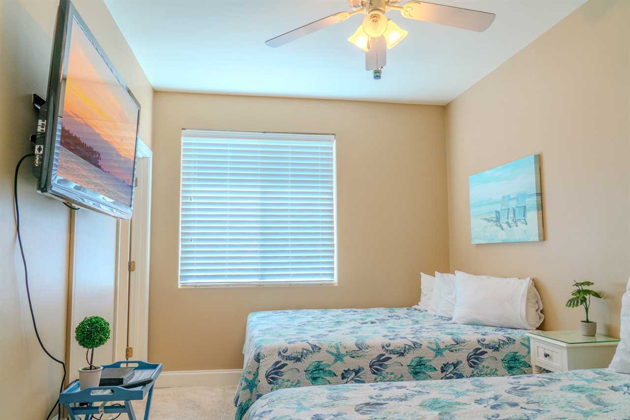 As you make your way through the condo, you'll find a total of four bedrooms. Each bedroom includes its own closet, dresser, and full-size bathroom. The bedroom layouts and bed sizes are as follows: