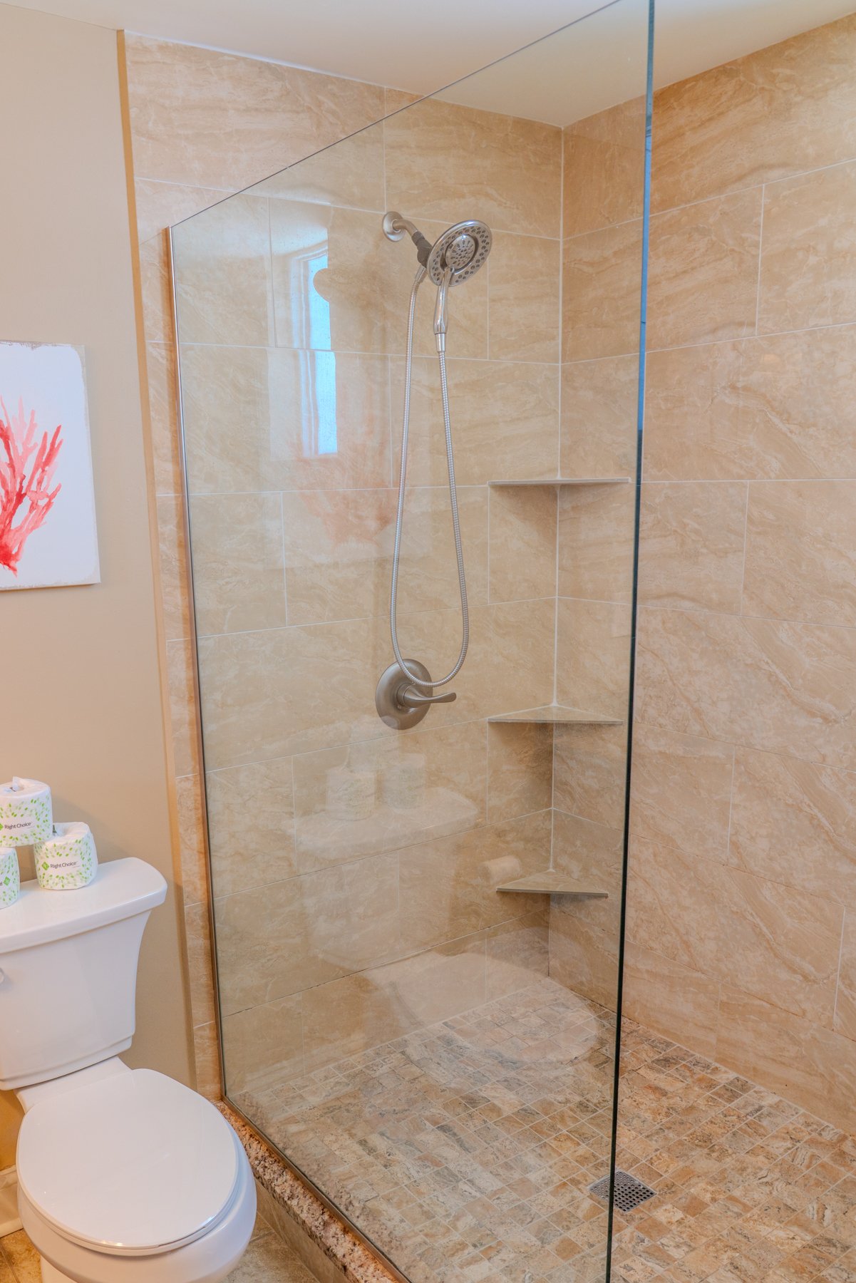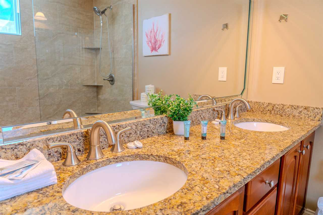 Bedroom 4 (Master): One king bed, with a sliding barn door leading to the bathroom, which features double sinks and a large tile shower