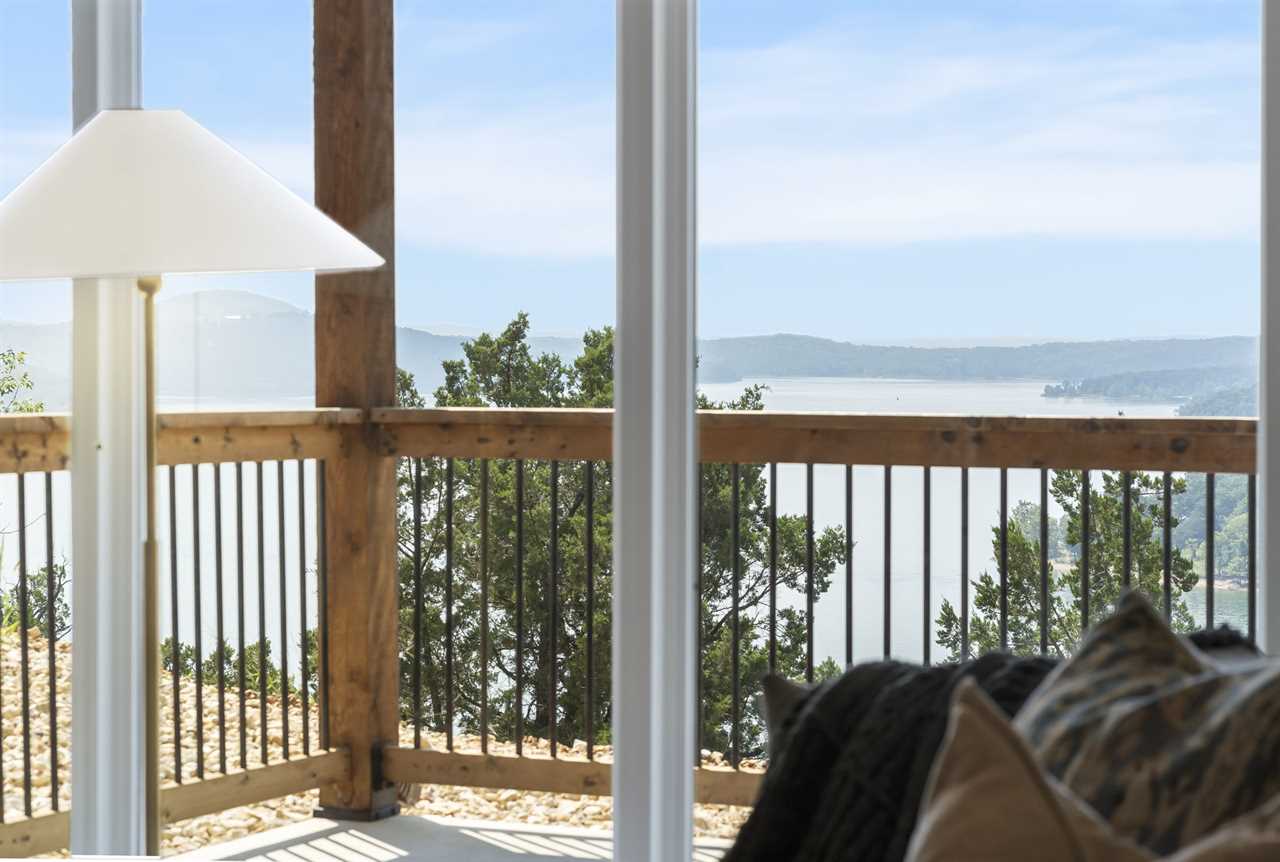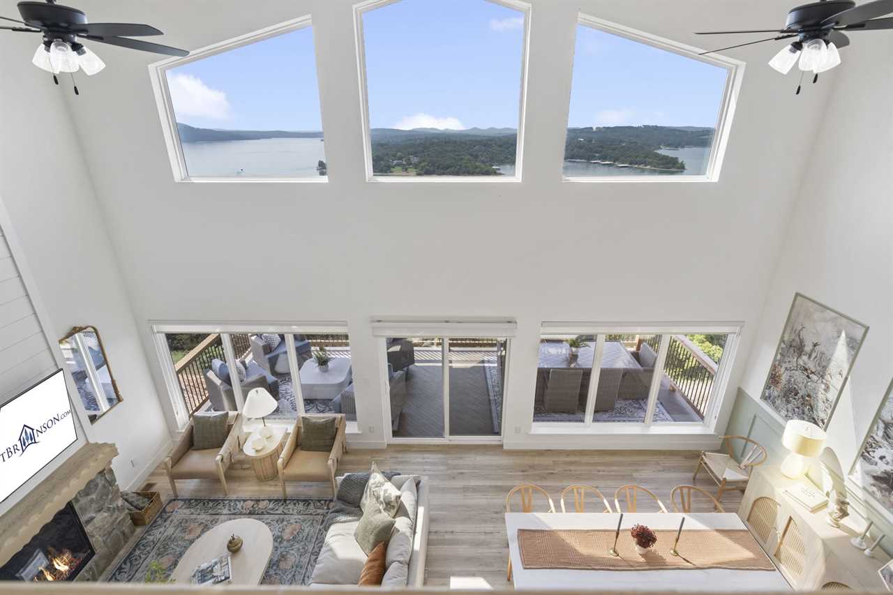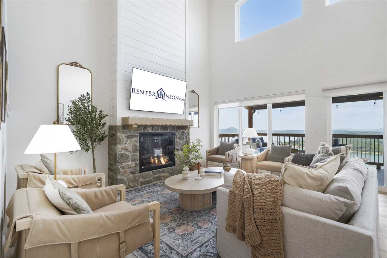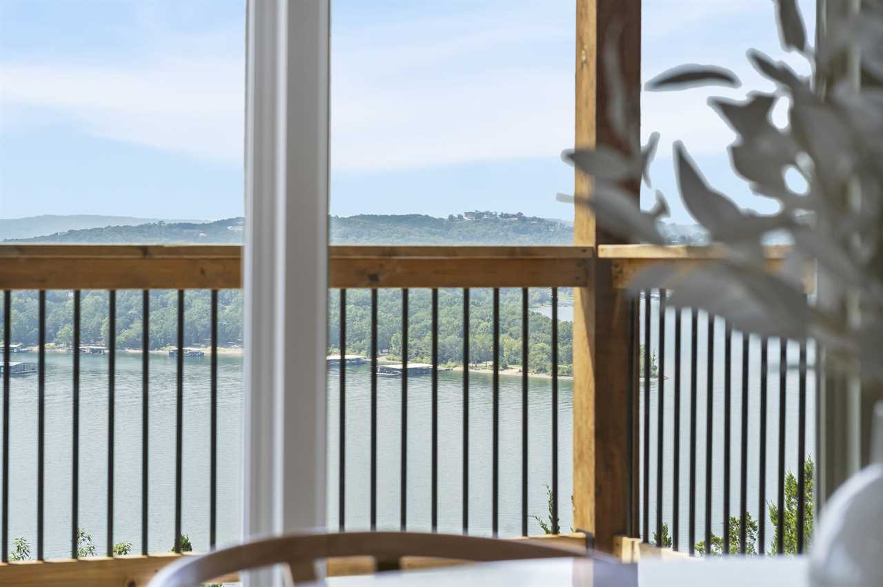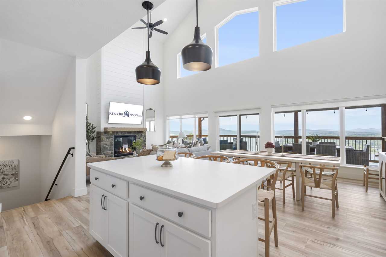 Step inside where the warmth of the living area welcomes you. Cozy up next to the elegant fireplace, the perfect companion for those cooler evenings, and let the gentle flames lull you into relaxation. Floor-to-ceiling windows ensure that the breathtaking outside view is never too far away, inviting the beauty of nature indoors. For those who love to cook or simply enjoy a hearty meal, our fully-equipped kitchen awaits. Crafted with premium appliances and modern amenities such as bibs/utensils for the younger children, oils, and a spice cabinet, it is perfectly suited for creating gourmet dinners or quick snacks. The adjoining dining area provides space for memorable family feasts, all against the backdrop of the stunning lake views. On the main level, there are two King bedrooms with ensuite bathrooms, ensuring a great night's sleep. The main level deck also provides outdoor dining and lounging to enjoy beautiful, lake-view evenings with the family. Enjoy watching the children from the front patio that overlooks the community pool and tree house playground. Head upstairs, where you will enjoy lounging in the loft area with great views of Table Rock Lake. You will find the convenience of a home office for when duty calls. This level is home to two more king bedrooms with their ensuite bathrooms.