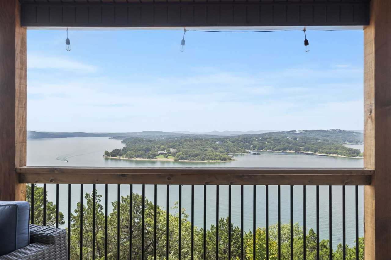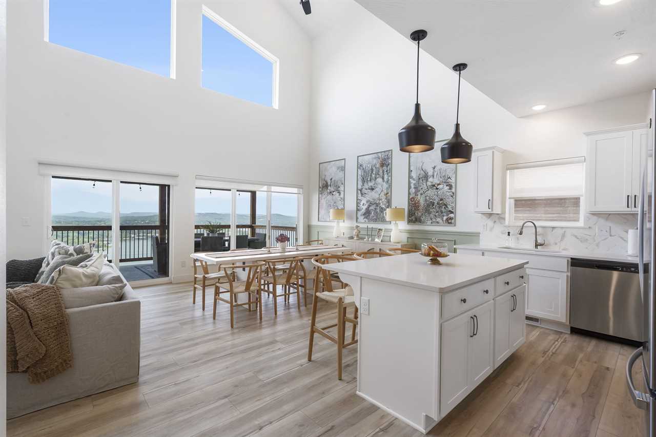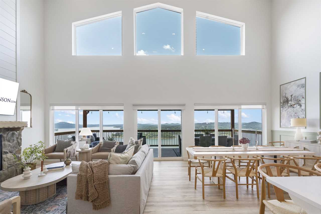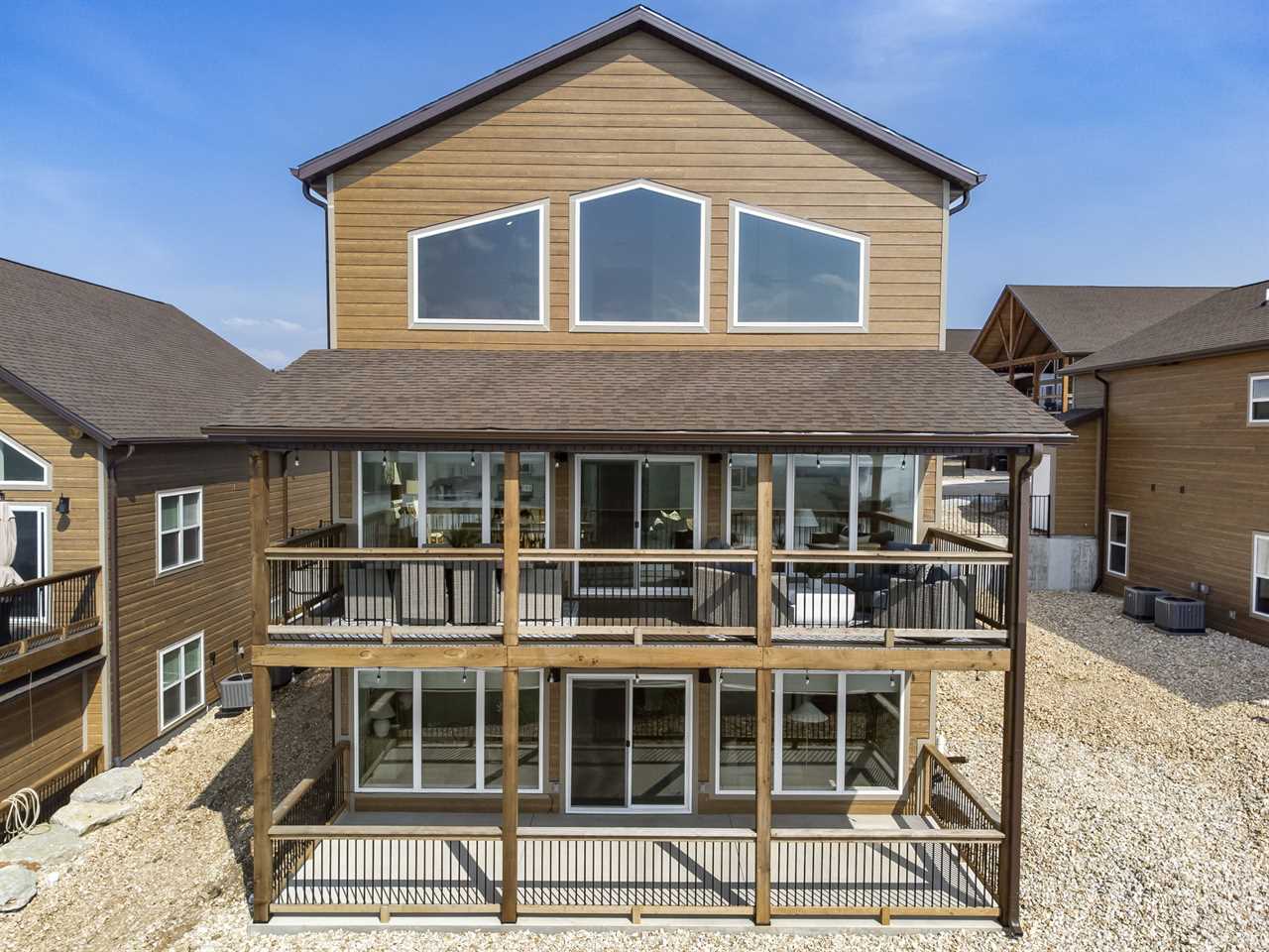 Step inside where the warmth of the living area welcomes you. Cozy up next to the elegant fireplace, the perfect companion for those cooler evenings, and let the gentle flames lull you into relaxation. Floor-to-ceiling windows ensure that the breathtaking outside view is never too far away, inviting the beauty of nature indoors. For those who love to cook or simply enjoy a hearty meal, our fully-equipped kitchen awaits. Crafted with premium appliances and modern amenities such as bibs/utensils for the younger children, oils, and a spice cabinet, it is perfectly suited for creating gourmet dinners or quick snacks. The adjoining dining area provides space for memorable family feasts, all against the backdrop of the stunning lake views. On the main level, there are two King bedrooms with ensuite bathrooms, ensuring a great night's sleep. The main level deck also provides outdoor dining and lounging to enjoy beautiful, lake-view evenings with the family. Enjoy watching the children from the front patio that overlooks the community pool and tree house playground. Head upstairs, where you will enjoy lounging in the loft area with great views of Table Rock Lake. You will find the convenience of a home office for when duty calls. This level is home to two more king bedrooms with their ensuite bathrooms.