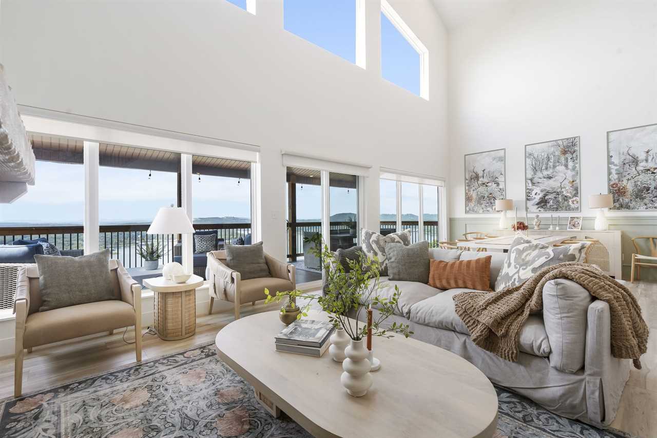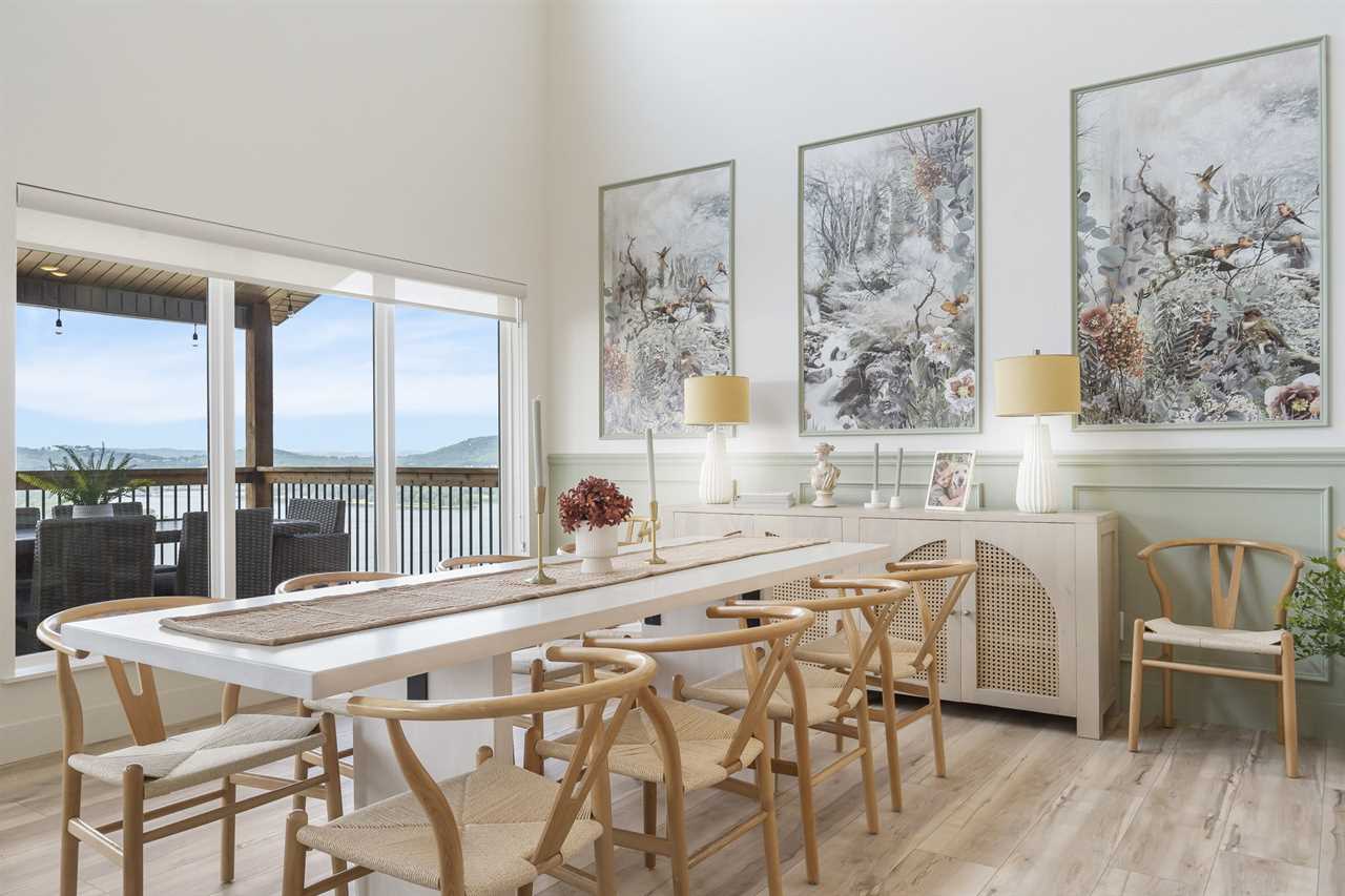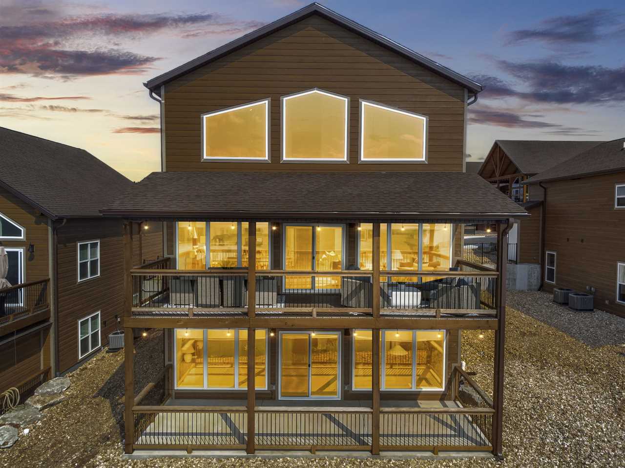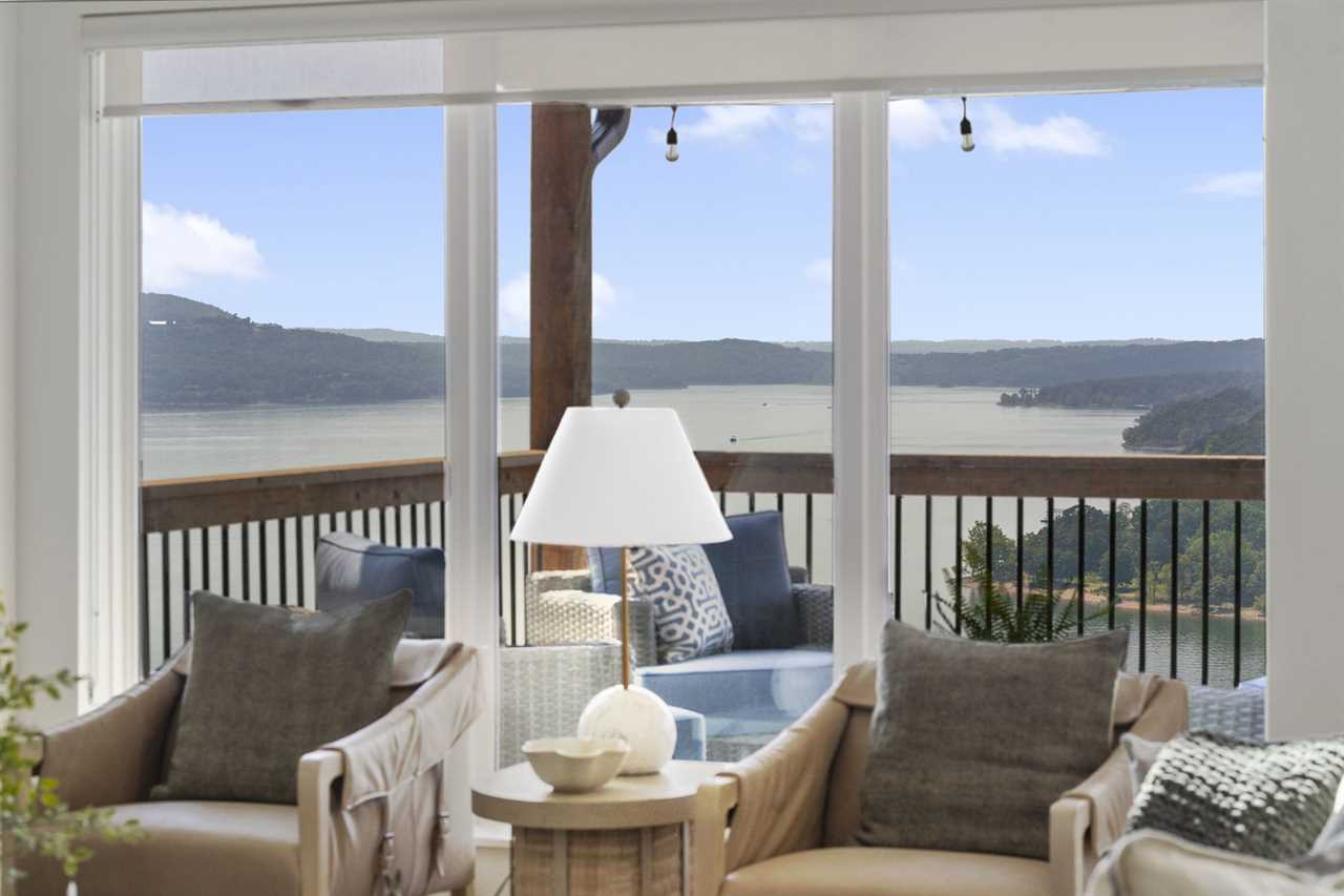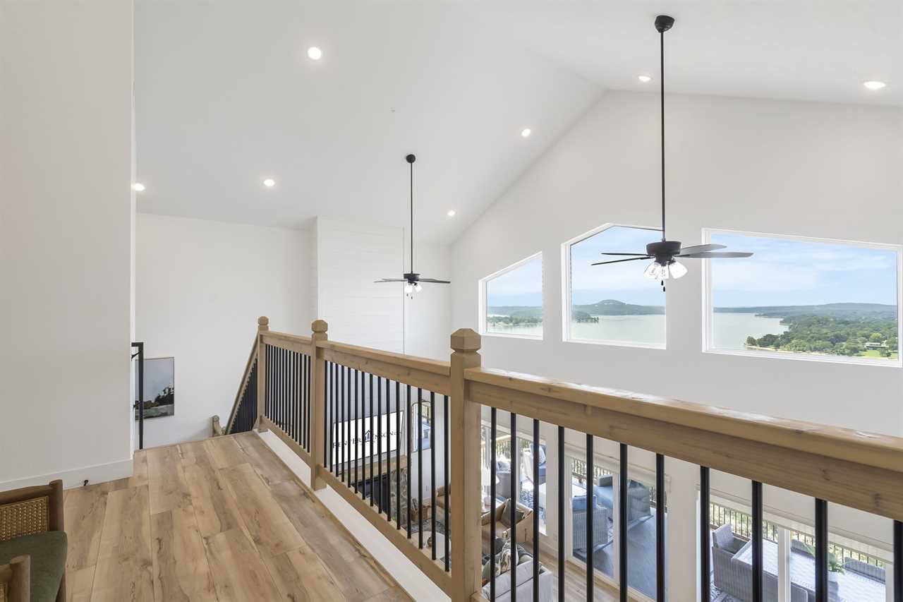 Step inside where the warmth of the living area welcomes you. Cozy up next to the elegant fireplace, the perfect companion for those cooler evenings, and let the gentle flames lull you into relaxation. Floor-to-ceiling windows ensure that the breathtaking outside view is never too far away, inviting the beauty of nature indoors. For those who love to cook or simply enjoy a hearty meal, our fully-equipped kitchen awaits. Crafted with premium appliances and modern amenities such as bibs/utensils for the younger children, oils, and a spice cabinet, it is perfectly suited for creating gourmet dinners or quick snacks. The adjoining dining area provides space for memorable family feasts, all against the backdrop of the stunning lake views. On the main level, there are two King bedrooms with ensuite bathrooms, ensuring a great night's sleep. The main level deck also provides outdoor dining and lounging to enjoy beautiful, lake-view evenings with the family. Enjoy watching the children from the front patio that overlooks the community pool and tree house playground. Head upstairs, where you will enjoy lounging in the loft area with great views of Table Rock Lake. You will find the convenience of a home office for when duty calls. This level is home to two more king bedrooms with their ensuite bathrooms.