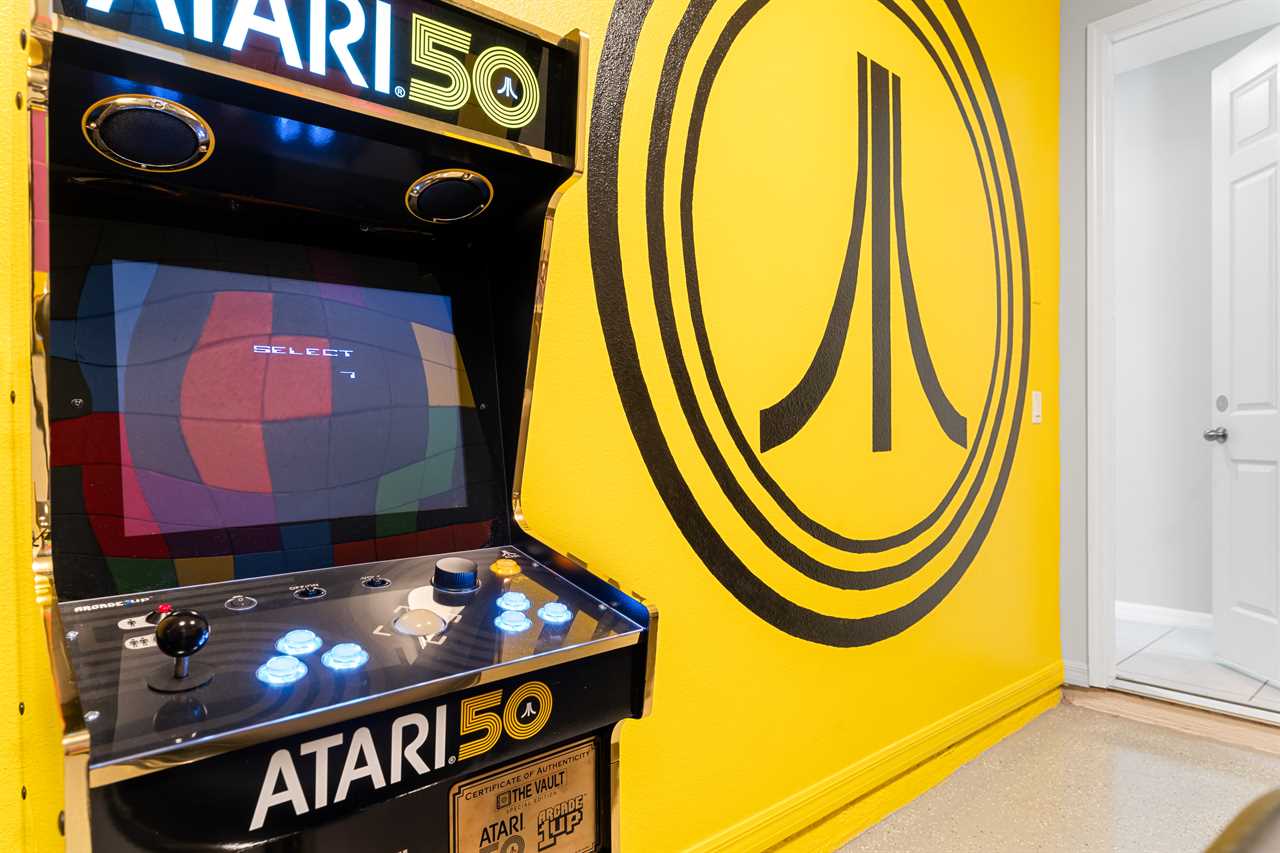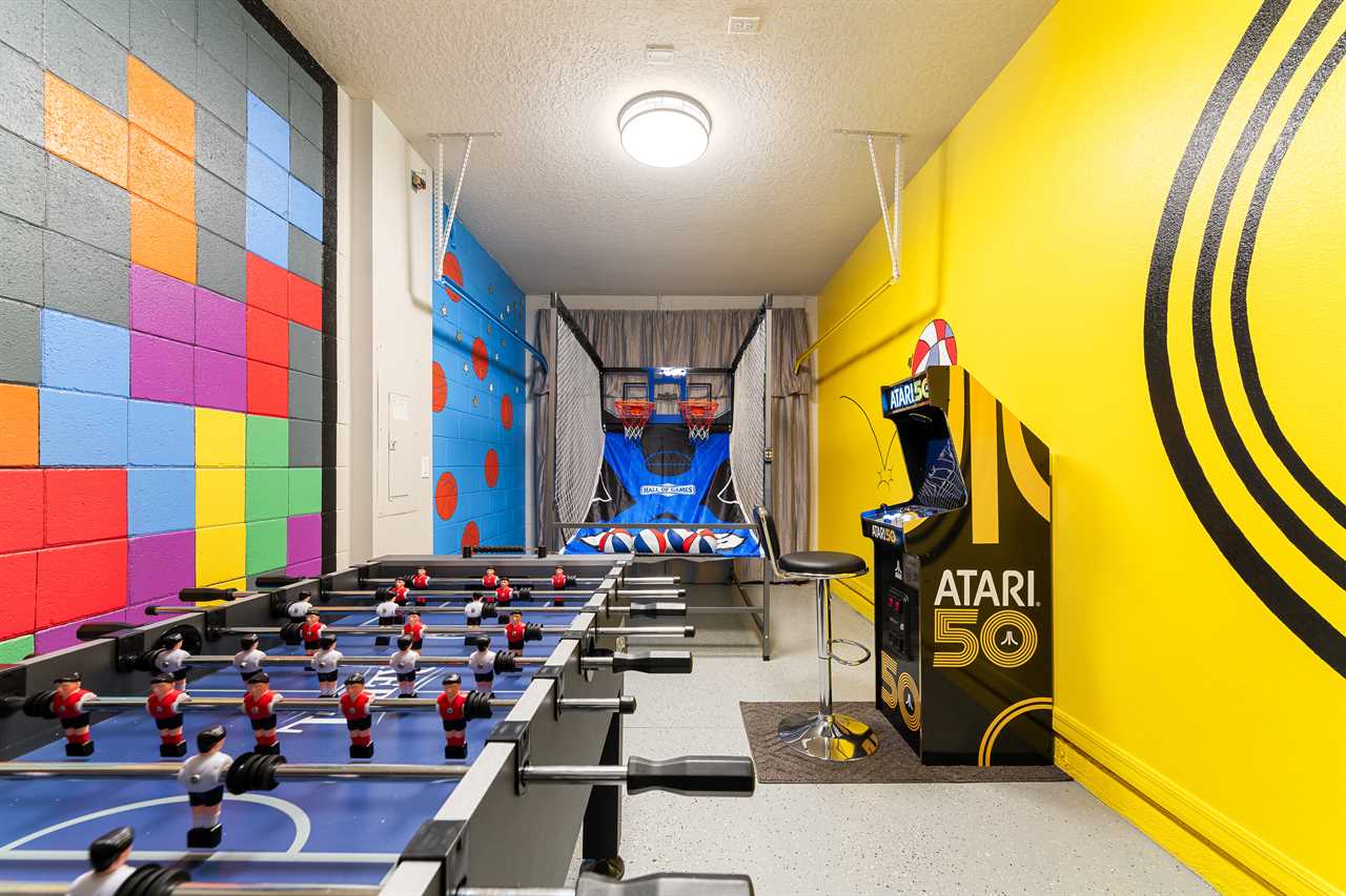 The garage has been converted into a game room with a foosball table, an arcade Atari game, and a pop-a-shot basketball. If you wish to relax before a favorite movie away from it all, there is a comfy wrap-around couch on the second-floor landing with a large wall-mounted TV.