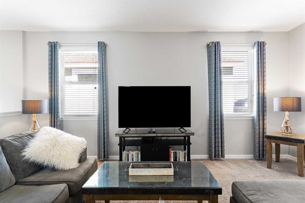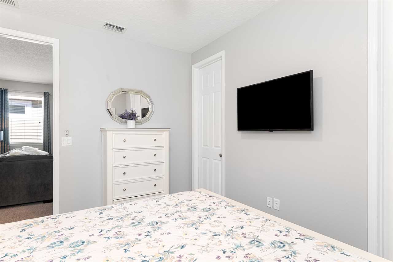 The great room includes a living area with comfy seating before a wall-mounted TV. A formal dining table seats 8, while there is additional bar stool seating for 4 by the kitchen counter. The kitchen itself comes with all stainless steel appliances and is fully equipped so you can enjoy home-cooked meals or reheat and store take-out.