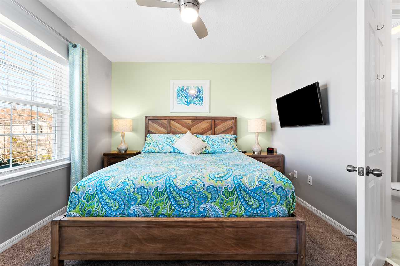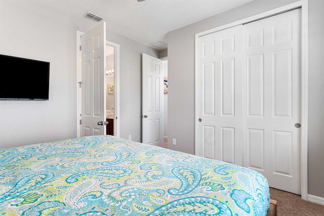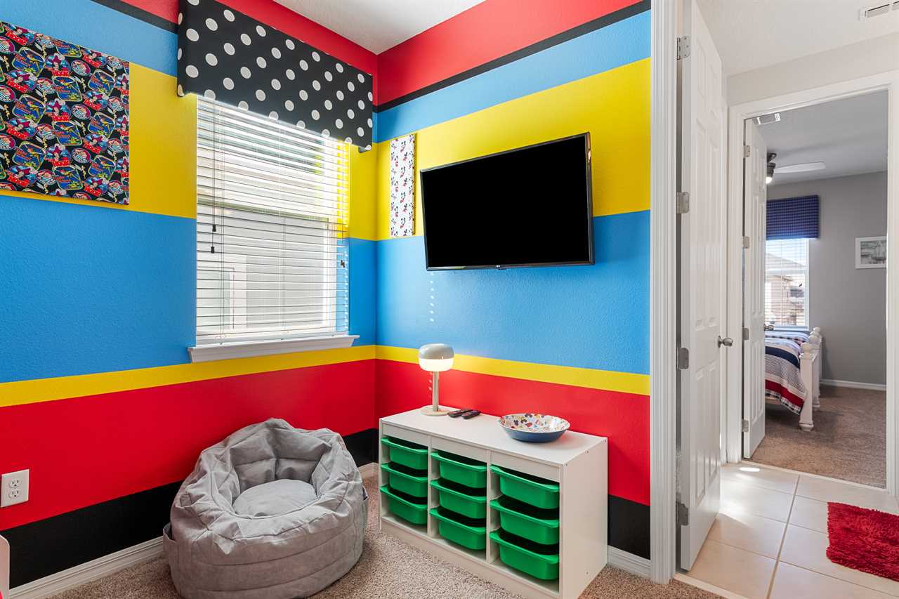 There are four rooms with king-size beds, one downstairs and the rest upstairs. A children's themed room has a full/twin bunk bed, while a second kid's room has two twin beds. All of the bedrooms have their TVs, and there is a laundry room available with a full-sized washer and dryer for your convenience.