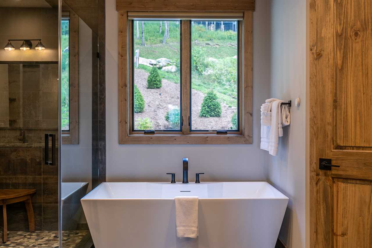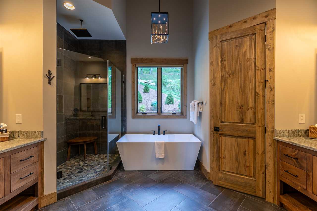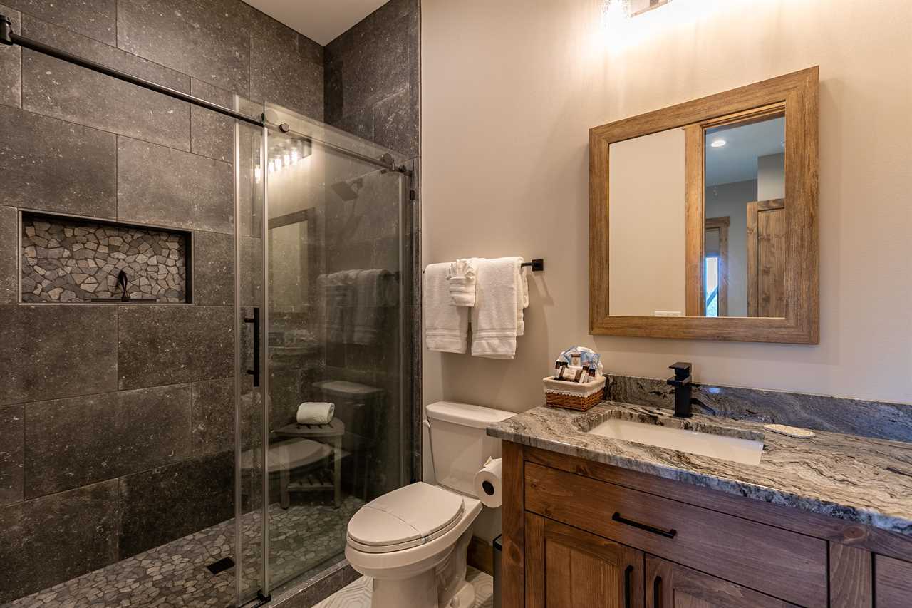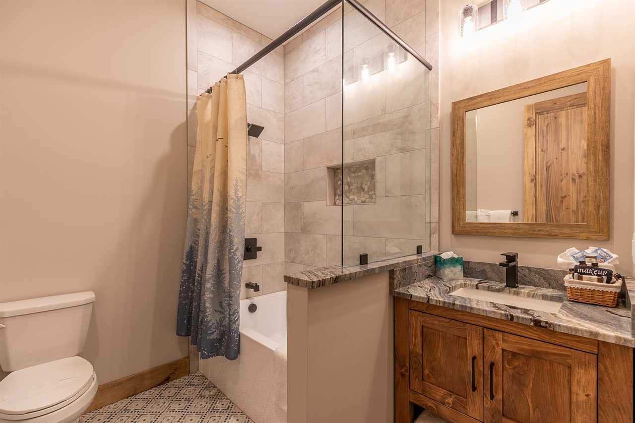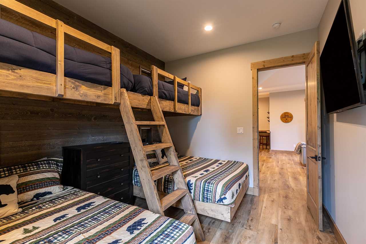 Walk down the stairs to the lower level and you are met with a place for fun (and sleeping). The Recreation Room offers a pool table, a shuffleboard table, a multi-arcade, a Peloton and yoga mats to enjoy a tranquil session on one of the lower decks. This floor has three bedrooms - the second king primary with a double vanity, heated floor, ensuite bathroom, a queen bedroom with ensuite bathroom and a bunk room with two queen and two twin beds. You will also find an additional full bathroom and laundry room on this floor. Walking out through the sliding glass doors brings more deck space with a large hot tub embedded in the deck and a third level deck for hanging out, washing your furry family and gaining access to the backyard.