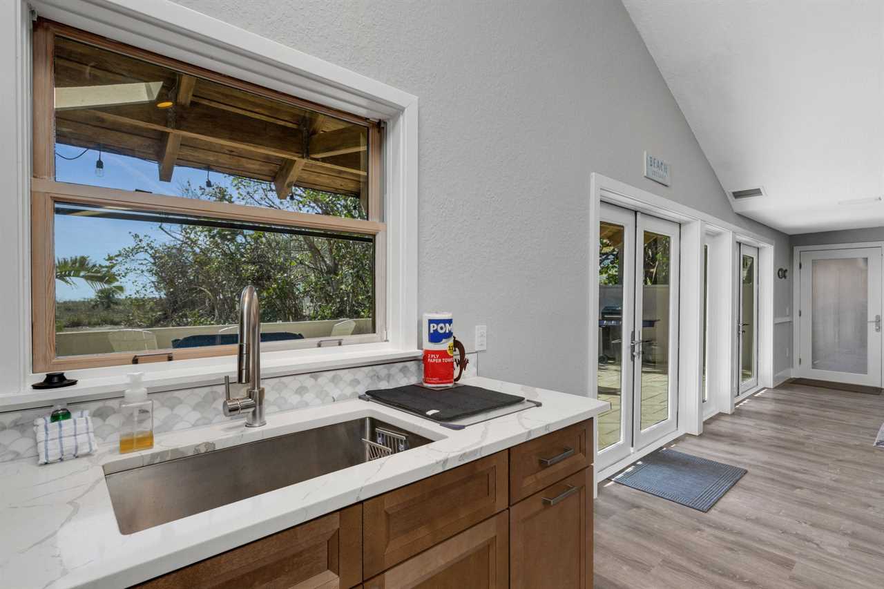 The home boasts a completely renovated kitchen equipped with 5-piece stainless steel appliance set among other small kitchen appliances. Plenty of counter space to offer even buffet style dining. The kitchen is furnished for all your light to medium cooking needs. Open shelving allows for quick and easy access to cooking and dining essentials. Dining can take place both indoors and out at either the eat-in kitchen table or the outdoor patio dining set. The open dining area offers a 5-person table as well as a 3-person counter height table equipped with charging and USB ports. This table provides a great view of the ocean (Gulf of Mexico) while dining or working on your computer.