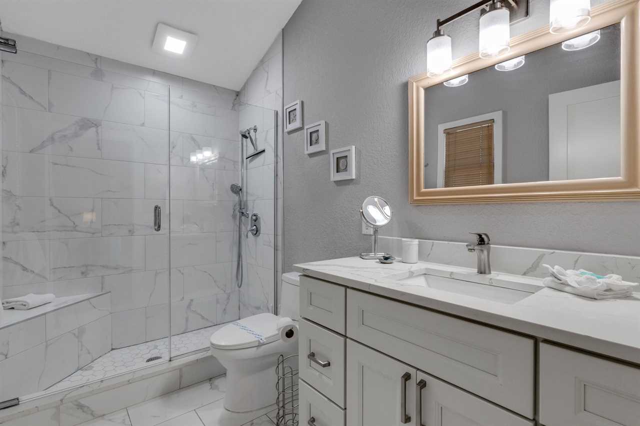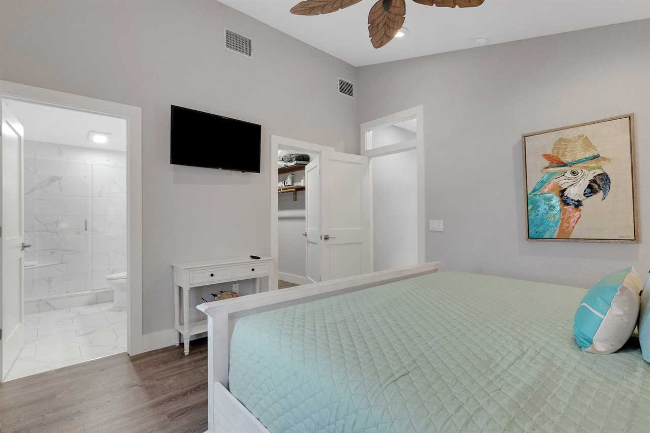 Moving along towards the sleeping accommodations, you will find the first of three bedrooms furnished with a queen-size bedroom set, offers a large walk-in closet, and equipped with smart TV. This queen bedroom also has direct access to the guest bathroom which offers a stall shower. Further down the hall you will come to the bunk-bed bedroom. This bedroom is furnished with a full over full-size bunk bed with twin-size trundle allowing sleeping accommodations of up to 5 persons. This room is also equipped with smart TV and furnished with a cabinet closet. Moving along to the end of the hall you will end up in the master suite. This suite is furnished with king-size bedroom set, offers access to a large walk-in closet, en-suite bathroom with stall shower, and equipped with smart TV.