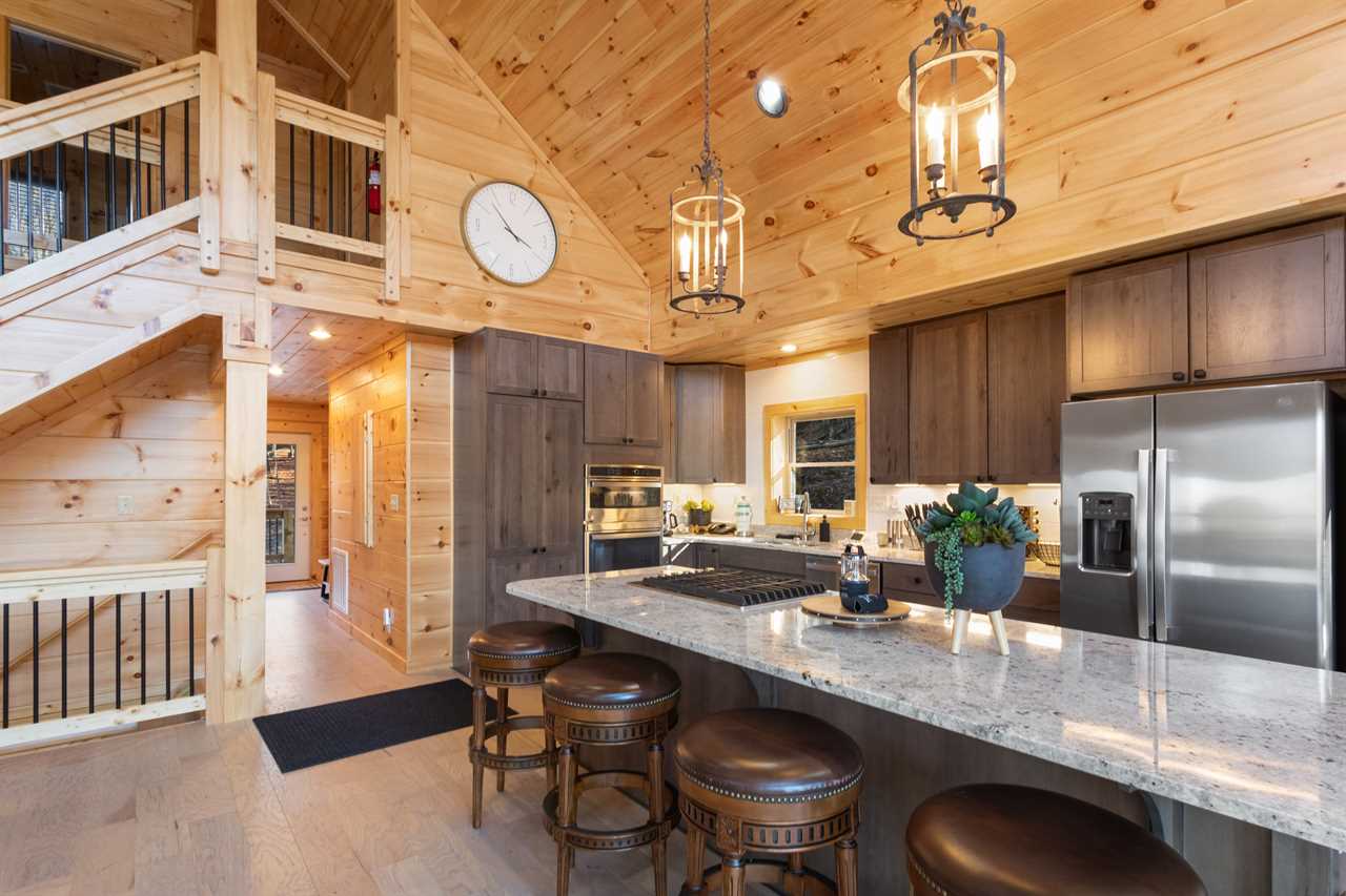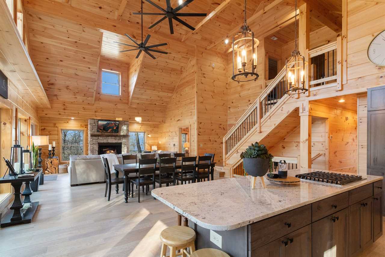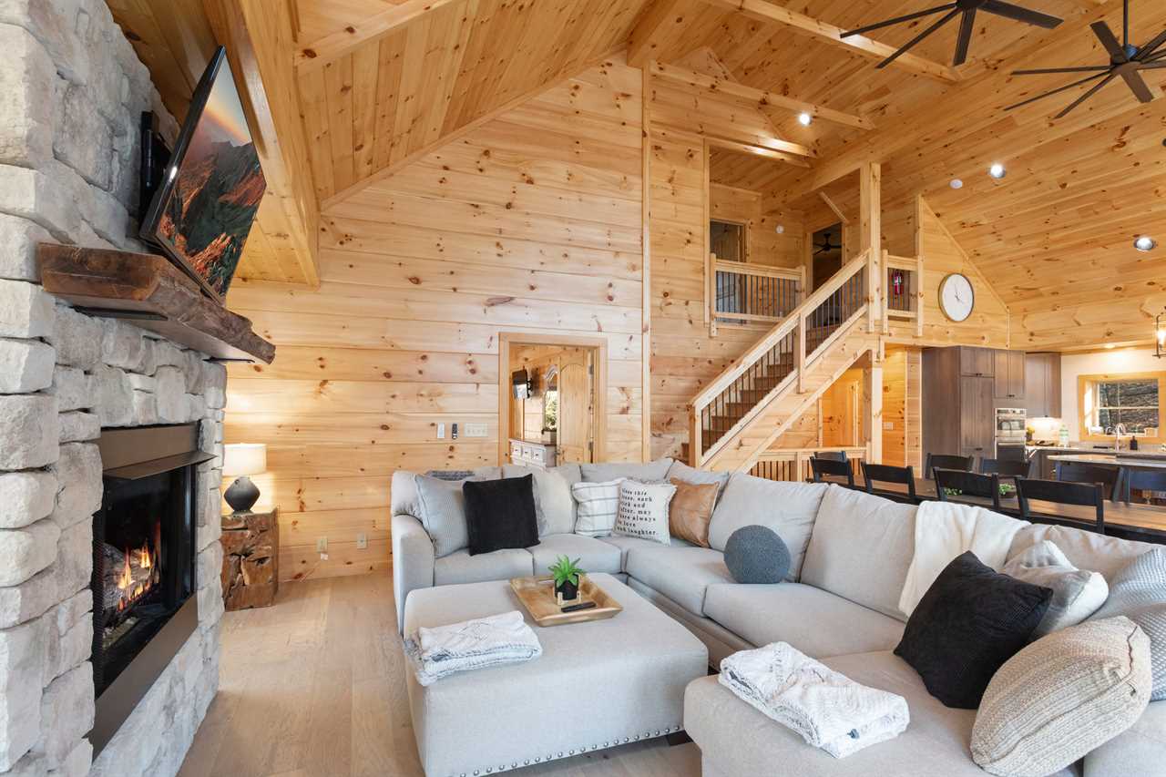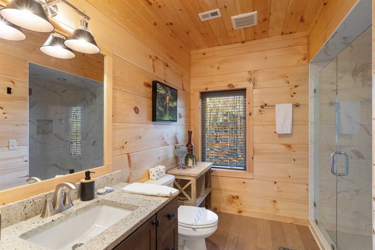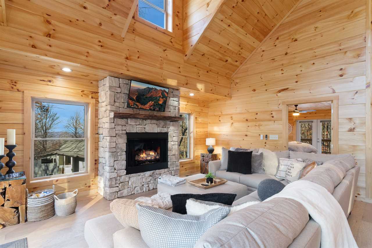 Enter into the bottom level of the cabin directly from the parking area and find a unique game room with a pool table, a wet bar, and comfortable theater-style seats around a stone gas log fireplace and big screen TV. There is a master bedroom on the lower level with a king bed and ensuite bathroom, an additional king guest room, and a full hallway bathroom. Upstairs is the spacious main living area with a high cathedral-style tongue-and-groove ceiling and wood floors, all framed by a wall of windows overlooking the fairway. The comfortable sectional sofa is around the gas fireplace and TV. The open-concept living space includes a dining area with seating for the whole house and a fully stocked kitchen to meet your needs. The expansive decks off the main level have seating and a gas grill with lovely views in any season. There is a second master bedroom on the main level with a king bed and ensuite bathroom. Upstairs is a king guest bedroom and a queen guest bedroom, with TVs and a shared hallway bathroom. All rooms have luxury and comfort in mind.
