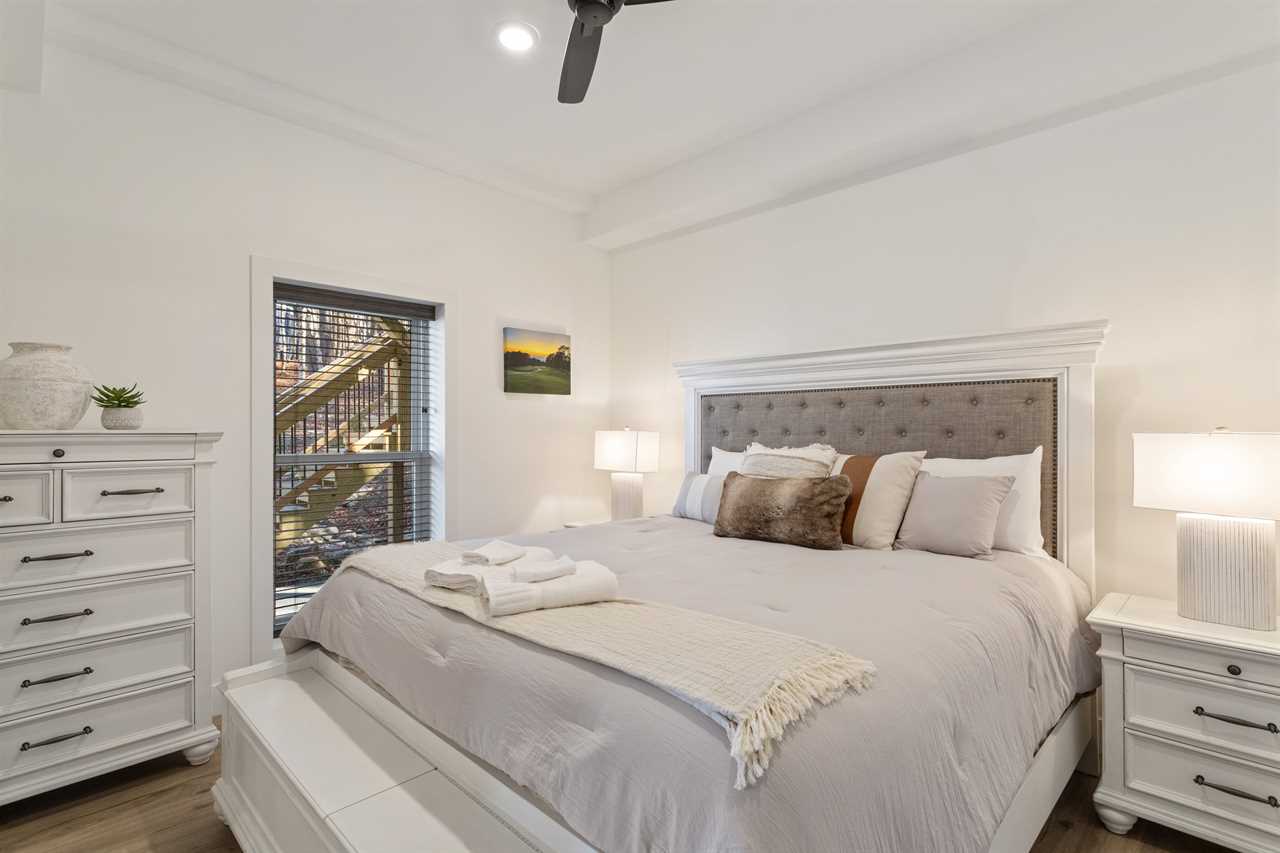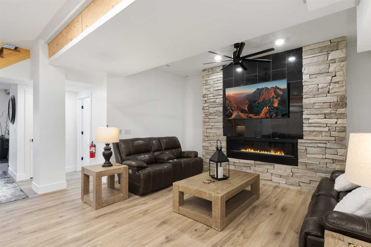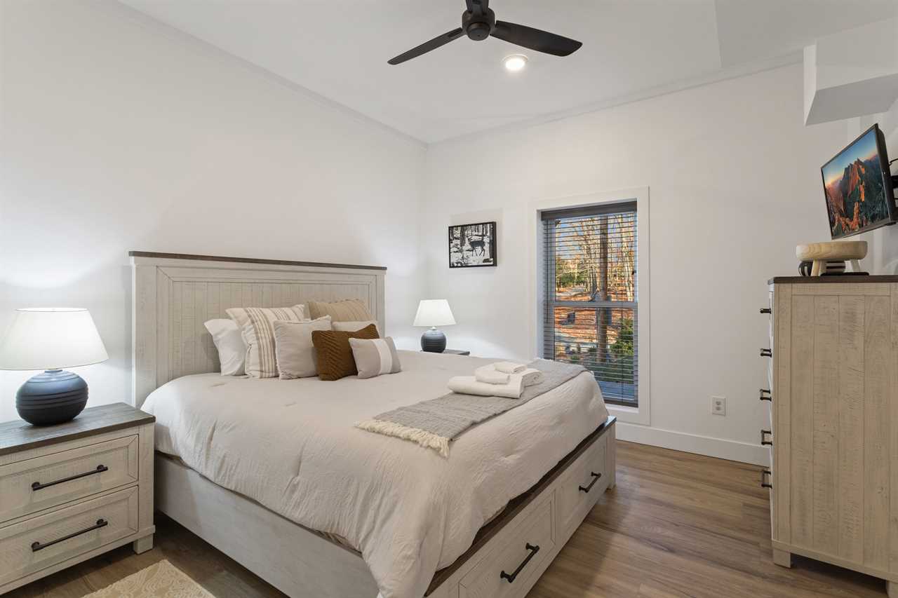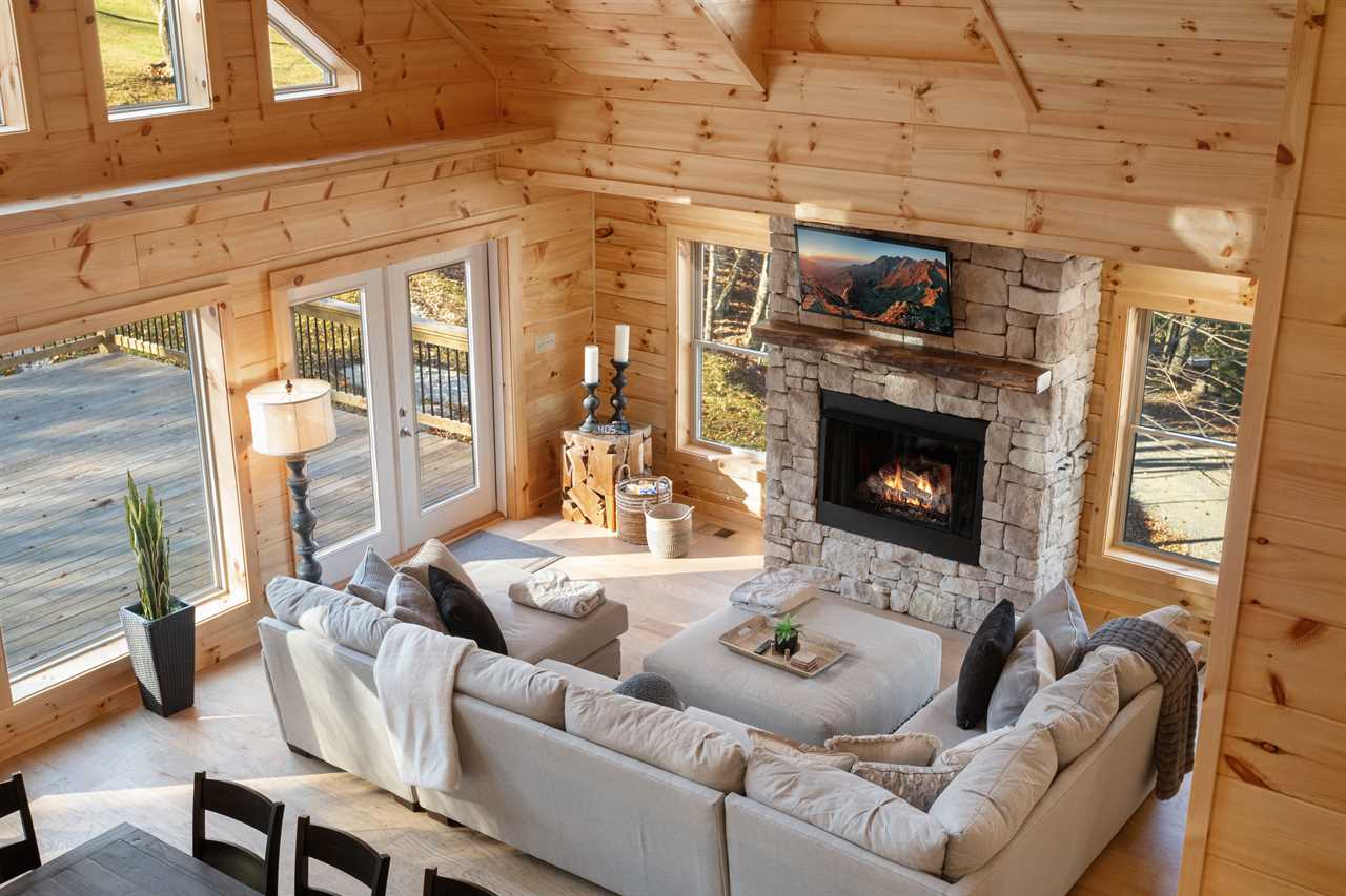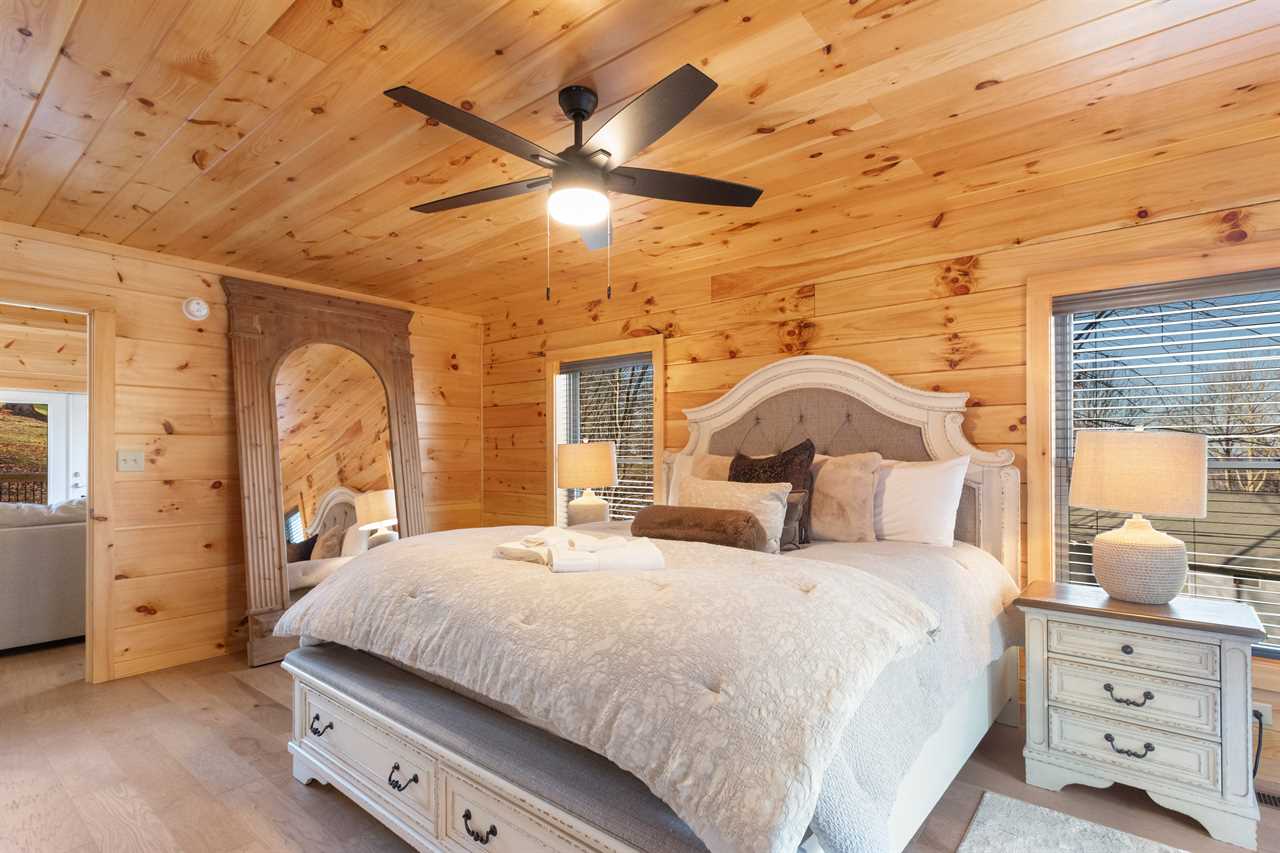Enter into the bottom level of the cabin directly from the parking area and find a unique game room with a pool table, a wet bar, and comfortable theater-style seats around a stone gas log fireplace and big screen TV. There is a master bedroom on the lower level with a king bed and ensuite bathroom, an additional king guest room, and a full hallway bathroom. Upstairs is the spacious main living area with a high cathedral-style tongue-and-groove ceiling and wood floors, all framed by a wall of windows overlooking the fairway. The comfortable sectional sofa is around the gas fireplace and TV. The open-concept living space includes a dining area with seating for the whole house and a fully stocked kitchen to meet your needs. The expansive decks off the main level have seating and a gas grill with lovely views in any season. There is a second master bedroom on the main level with a king bed and ensuite bathroom. Upstairs is a king guest bedroom and a queen guest bedroom, with TVs and a shared hallway bathroom. All rooms have luxury and comfort in mind.