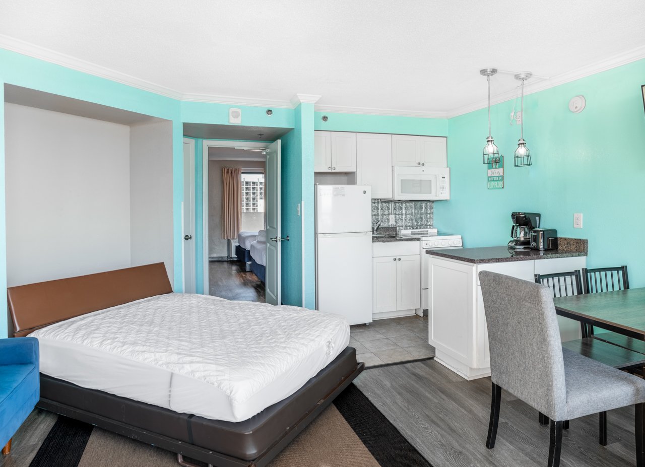 Moving on from the bedroom, is the living and kitchen space. The living area features a small couch, accent chair, wall mounted murphy bed, table and chairs, wall mounted TV and breathtaking ocean views from the oversize, private balcony that is located right off the living area. The kitchen can be found right off the living space. The kitchen offers full size appliances, fridge, stove, oven, microwave, and plentiful cabinet space. We provide all cookware, utensils, plates, cups, and basic kitchen necessities. For guests who prefer to dine out, there are several restaurants within a short walk or ride from the Caravelle. In addition, Uber Eats, DoorDash, and Postmates have become very popular food delivery options.