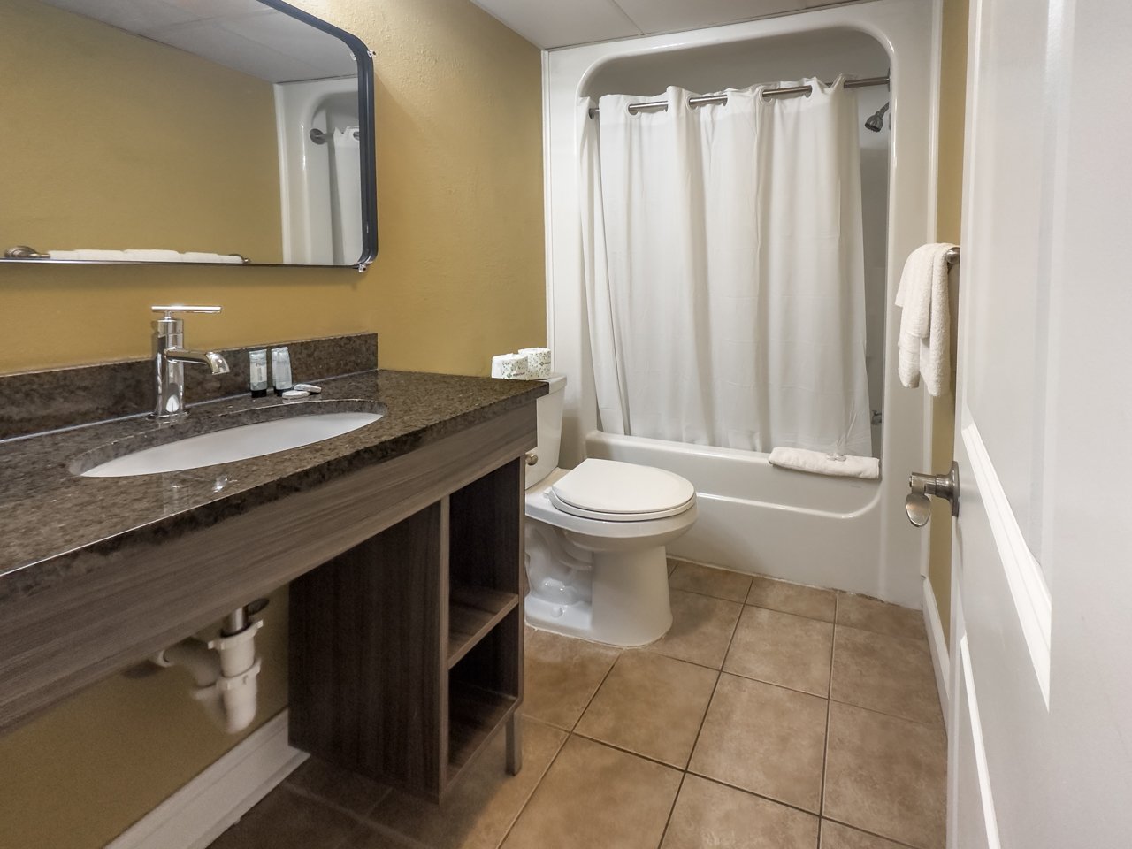 Upon entry into the unit, guests will enter right into the bedroom. The bedroom features 2 full-size beds, large dresser, wall mounted TV, night stand between the two beds, a window providing natural light, and access to the ensuite bathroom. The bathroom features a tub/shower combo, vanity, sink, large mirror, and toilet. Guests will arrive to a fully stocked bathroom with towels, wash cloths, and toiletry items such as soaps, shampoo, lotion, conditioner, and more!