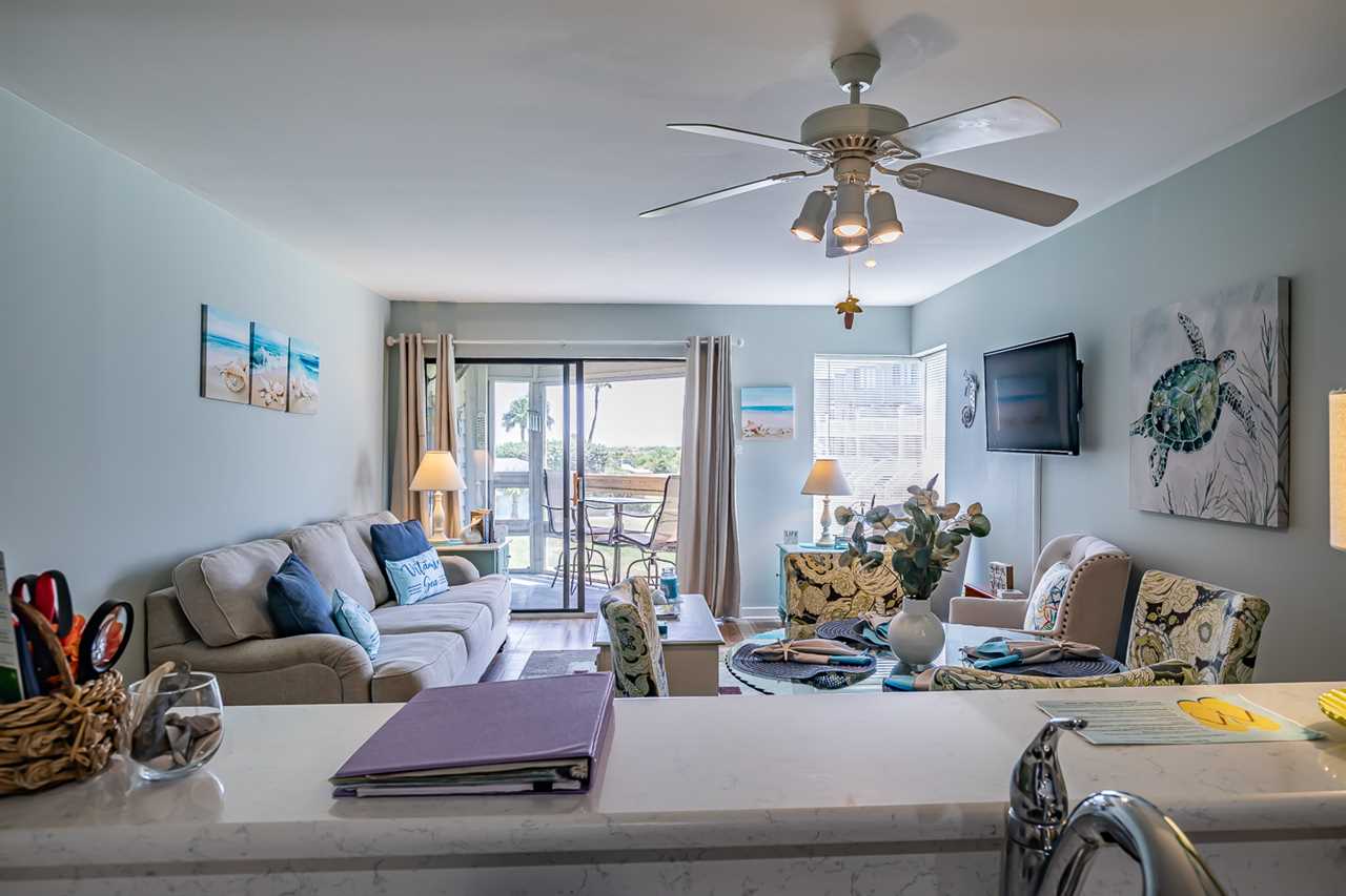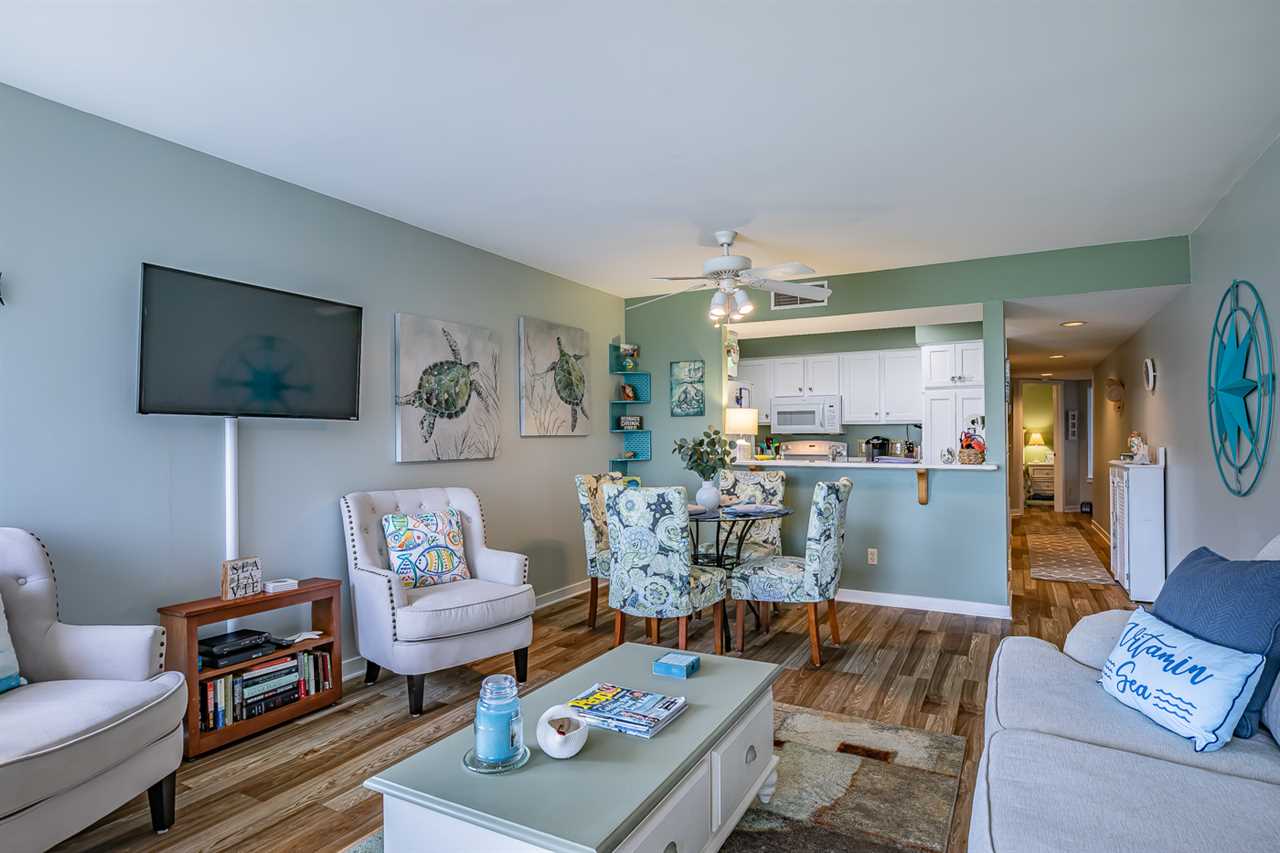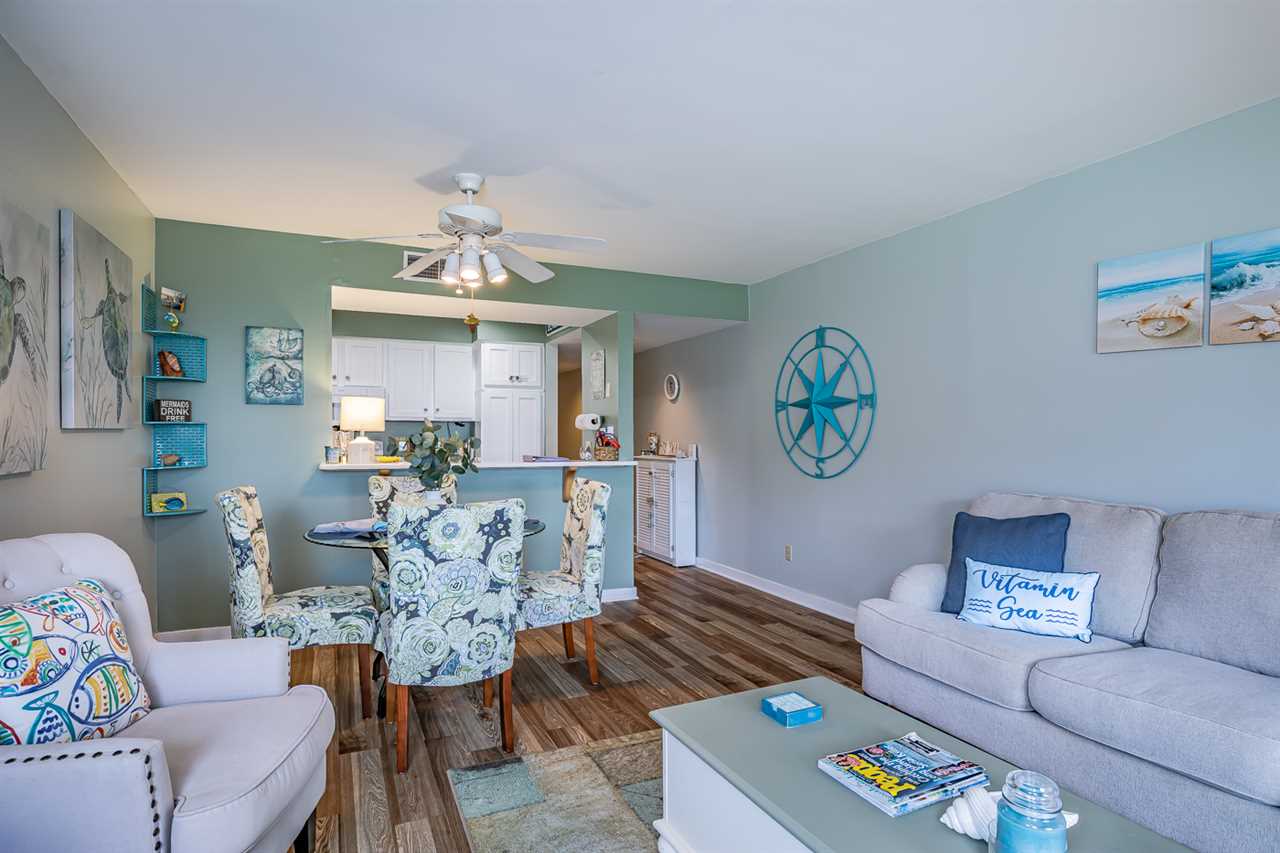 Step inside to find an inviting living space that exudes a relaxed beachy ambiance. The open layout seamlessly connects the living, dining, and kitchen areas, making it ideal for both relaxing and entertaining. The kitchen boasts modern appliances, ample counter space, and a breakfast bar, making meal preparation a breeze.