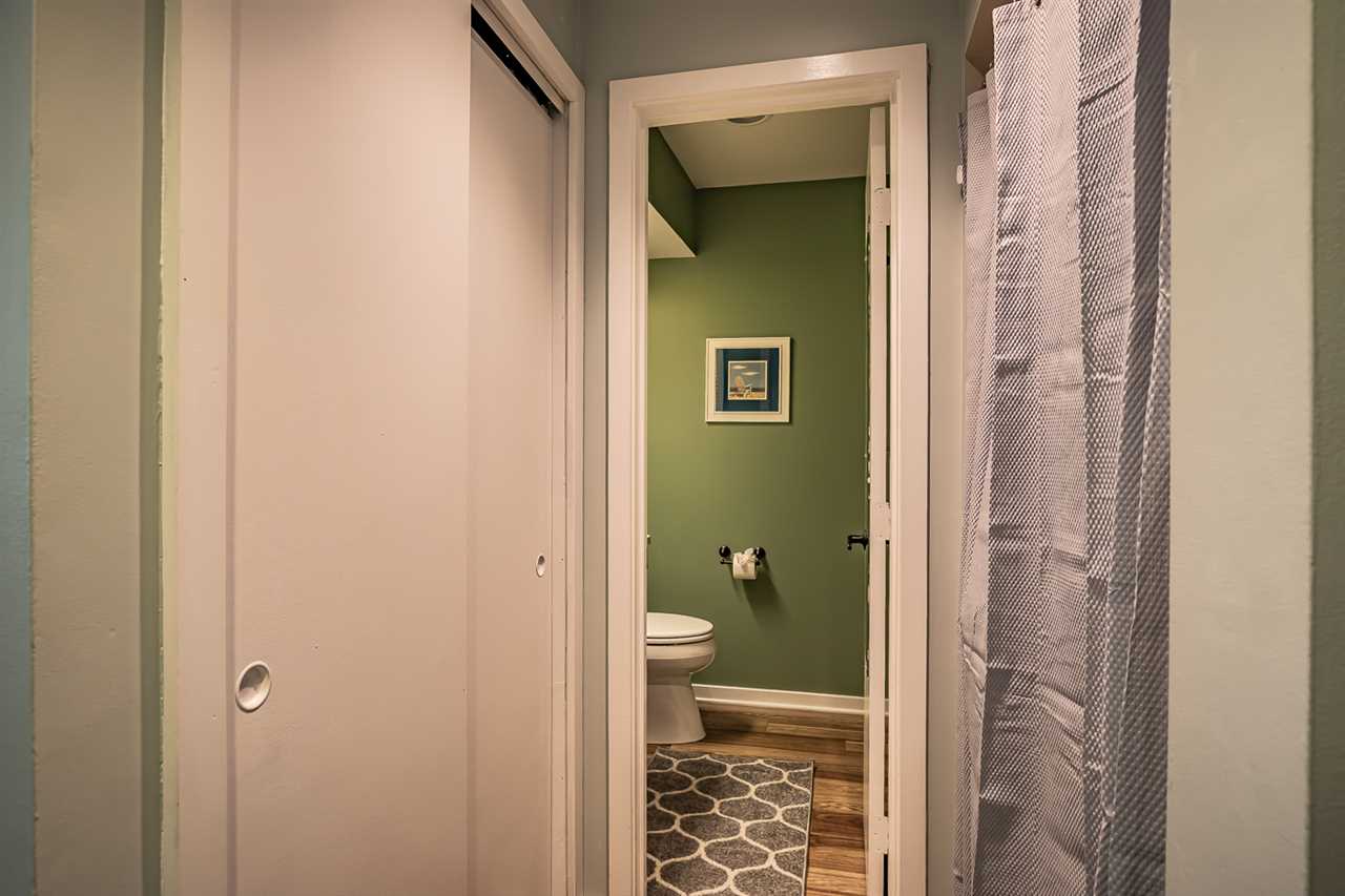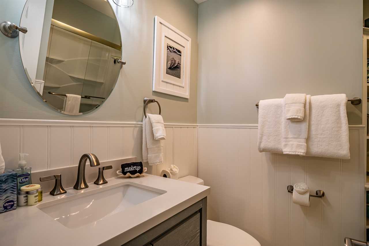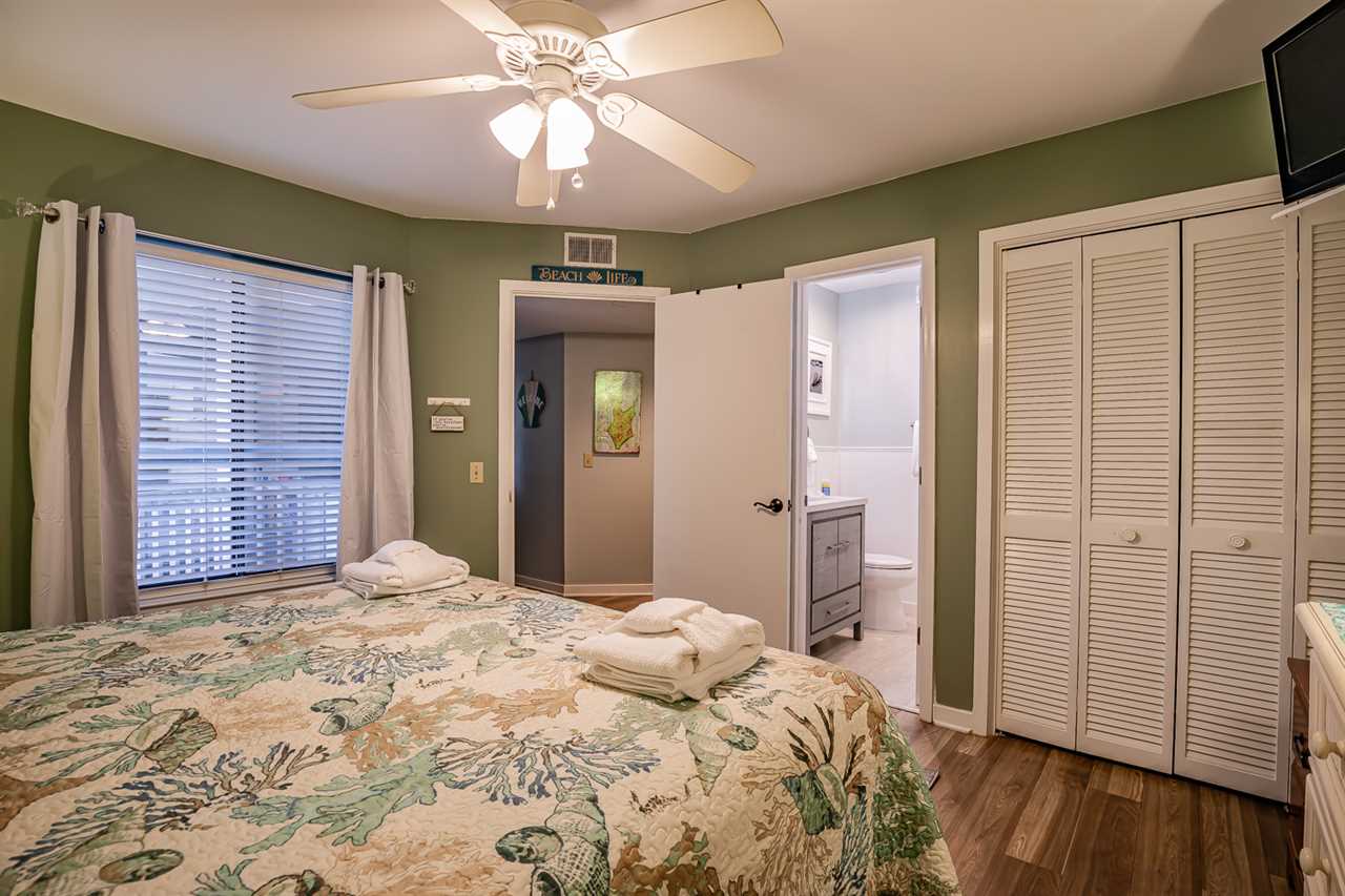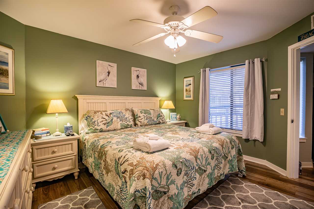 The well-appointed bedroom is equipped with a king size bed and ensuite bathroom. The ensuite master bath features modern fixtures and a spacious vanity. A convenient half bath serves other guests.