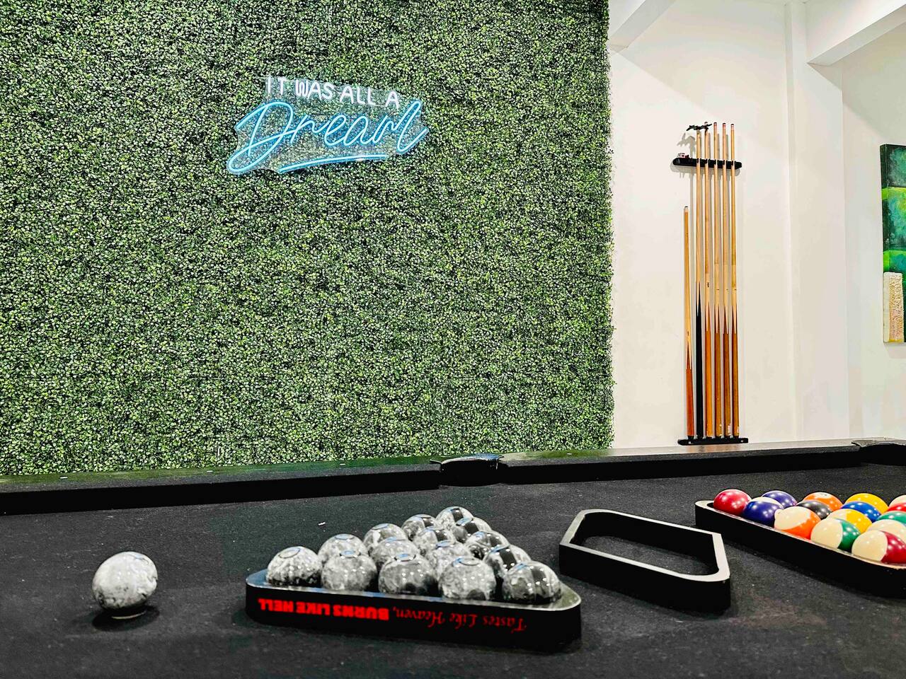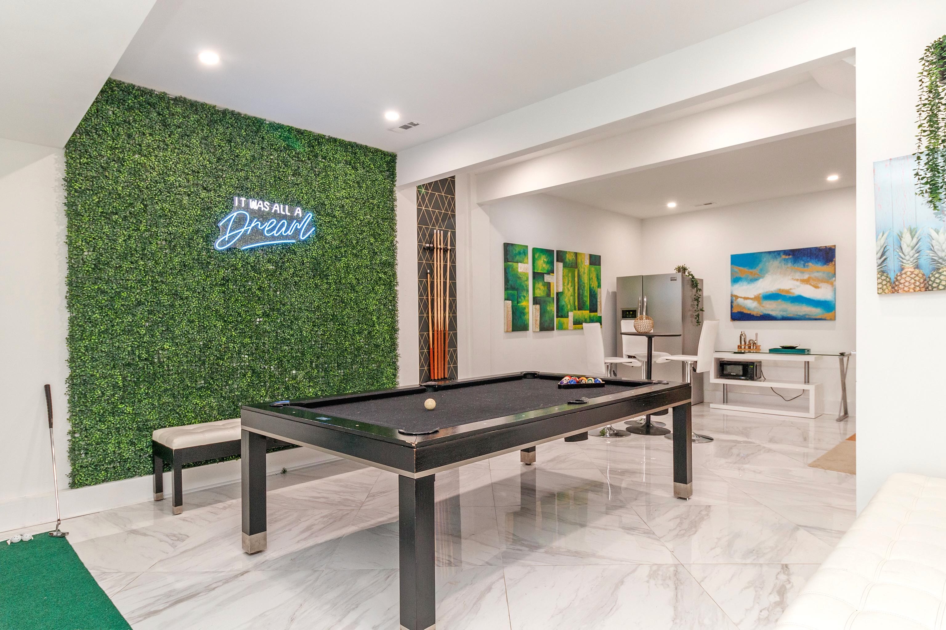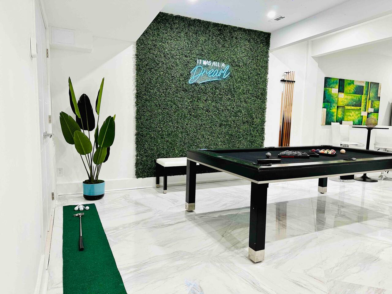Enjoy a game of billiards! Turn off the overhead lights and turn on the blacklight starry night lights instead, and relish that you are indeed living a dream. While you're waiting for your turn, practice your golf puts on the green.