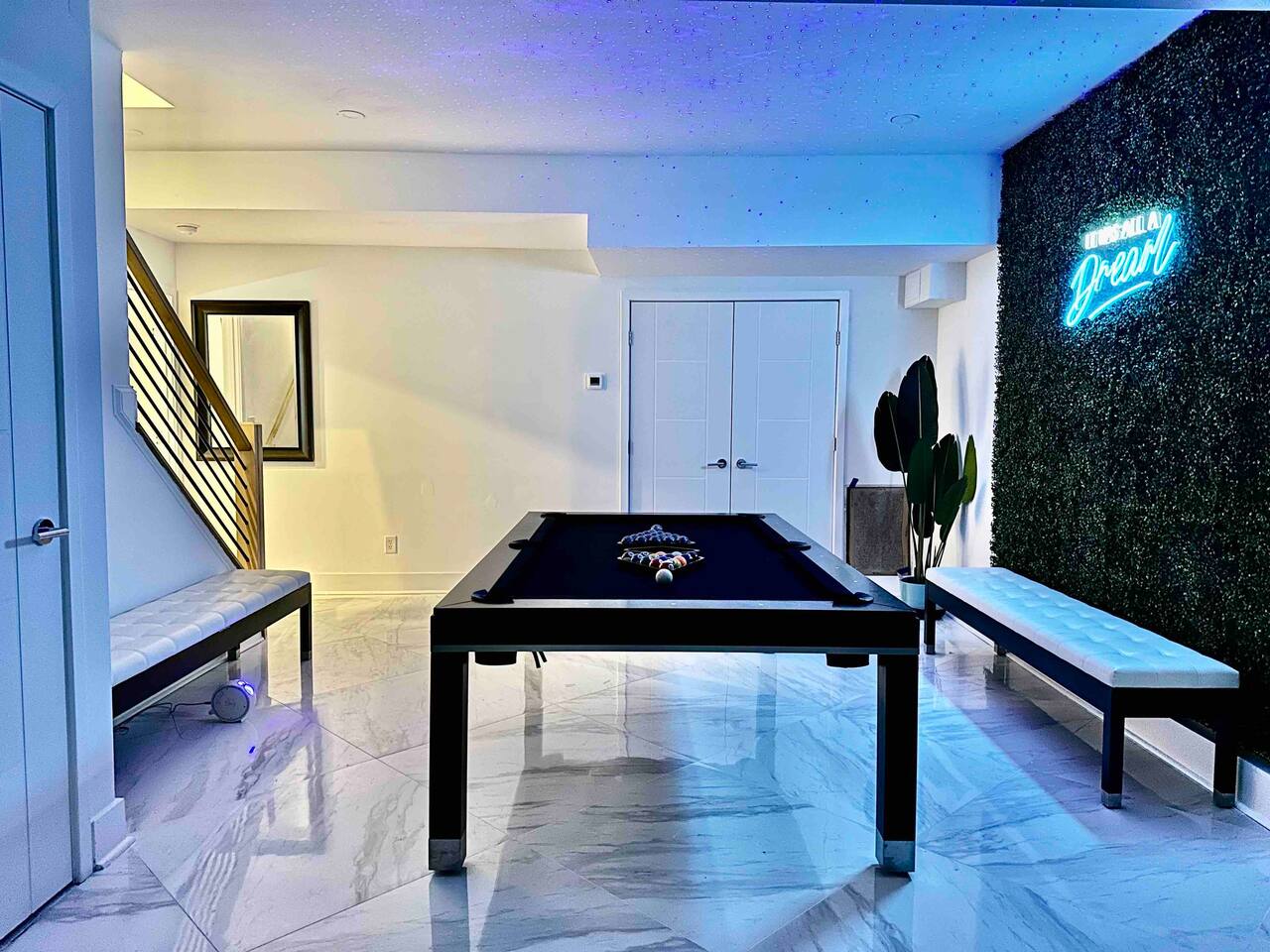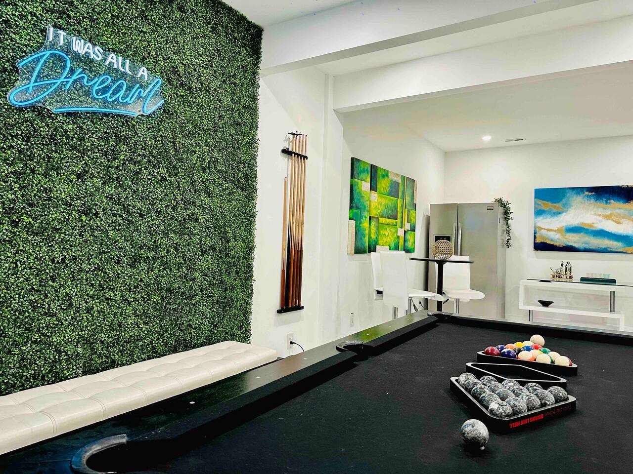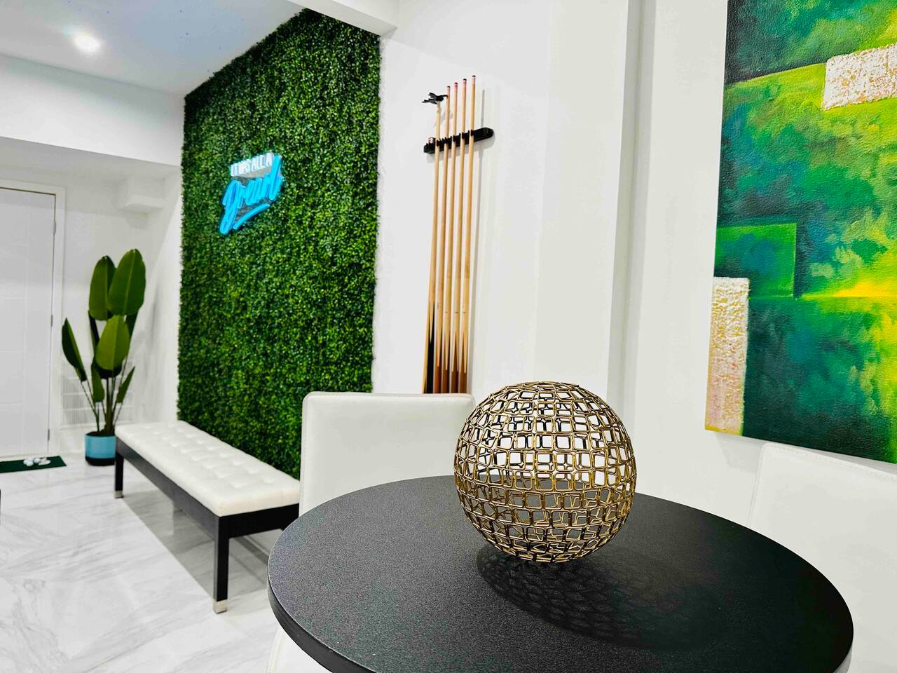 Enjoy a game of billiards! Turn off the overhead lights and turn on the blacklight starry night lights instead, and relish that you are indeed living a dream. While you're waiting for your turn, practice your golf puts on the green.