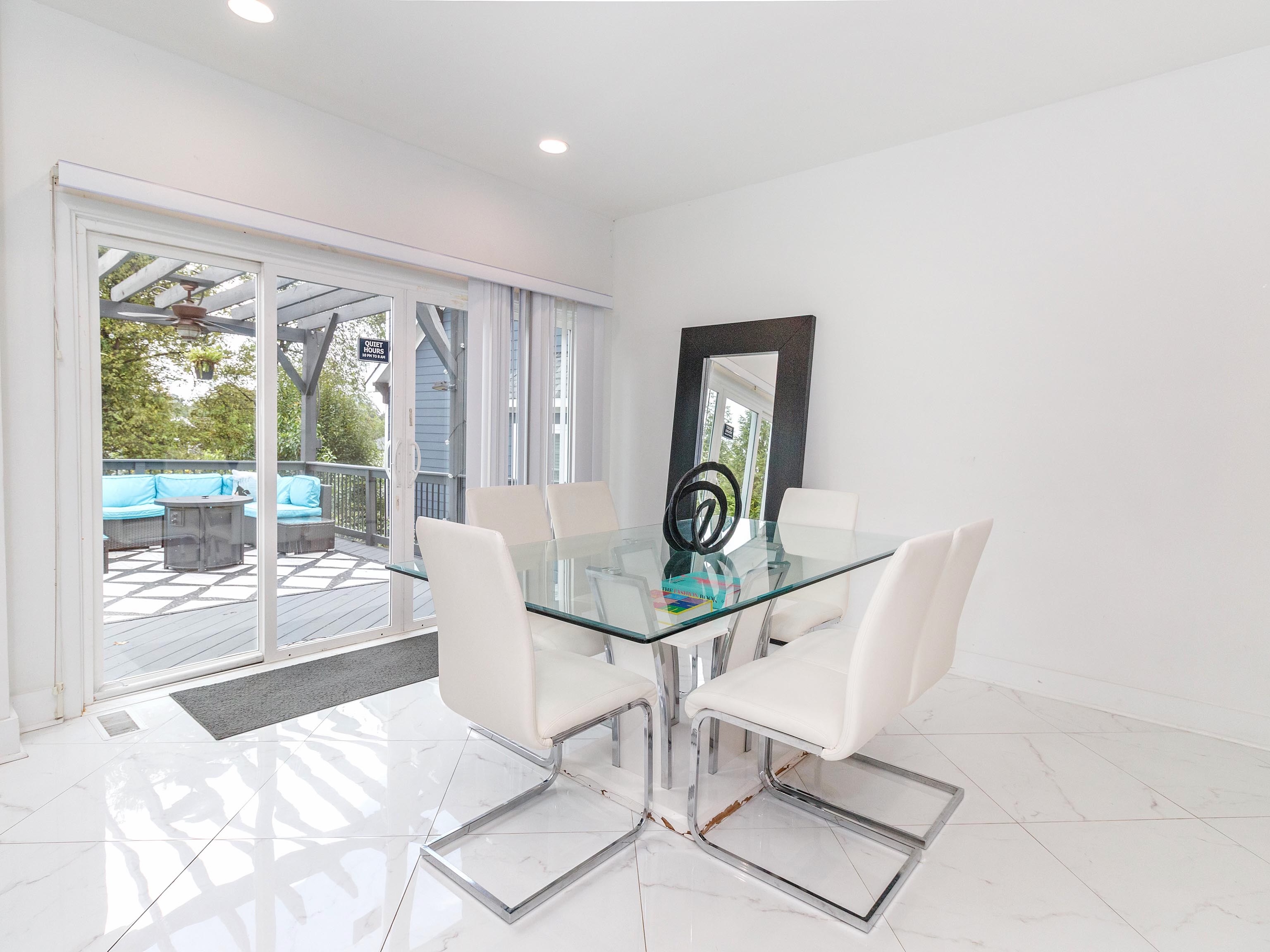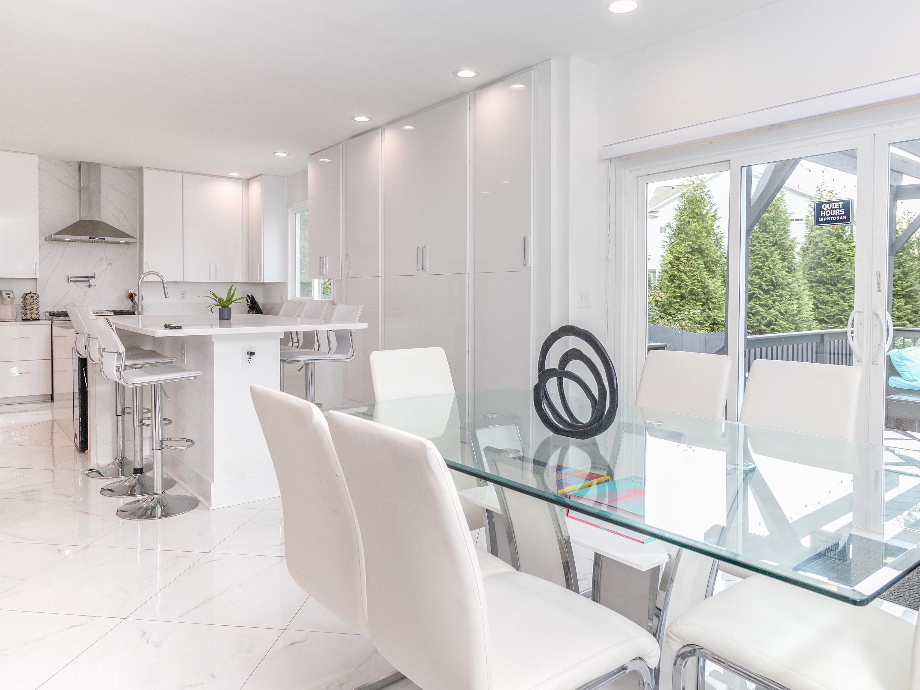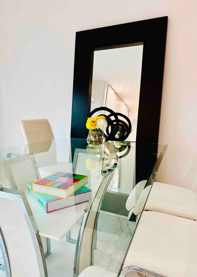 The glass dining room table seats 6. With the nearby kitchen island seating, you can enjoy meals for larger groups (up to 10 maximum, per house rules).