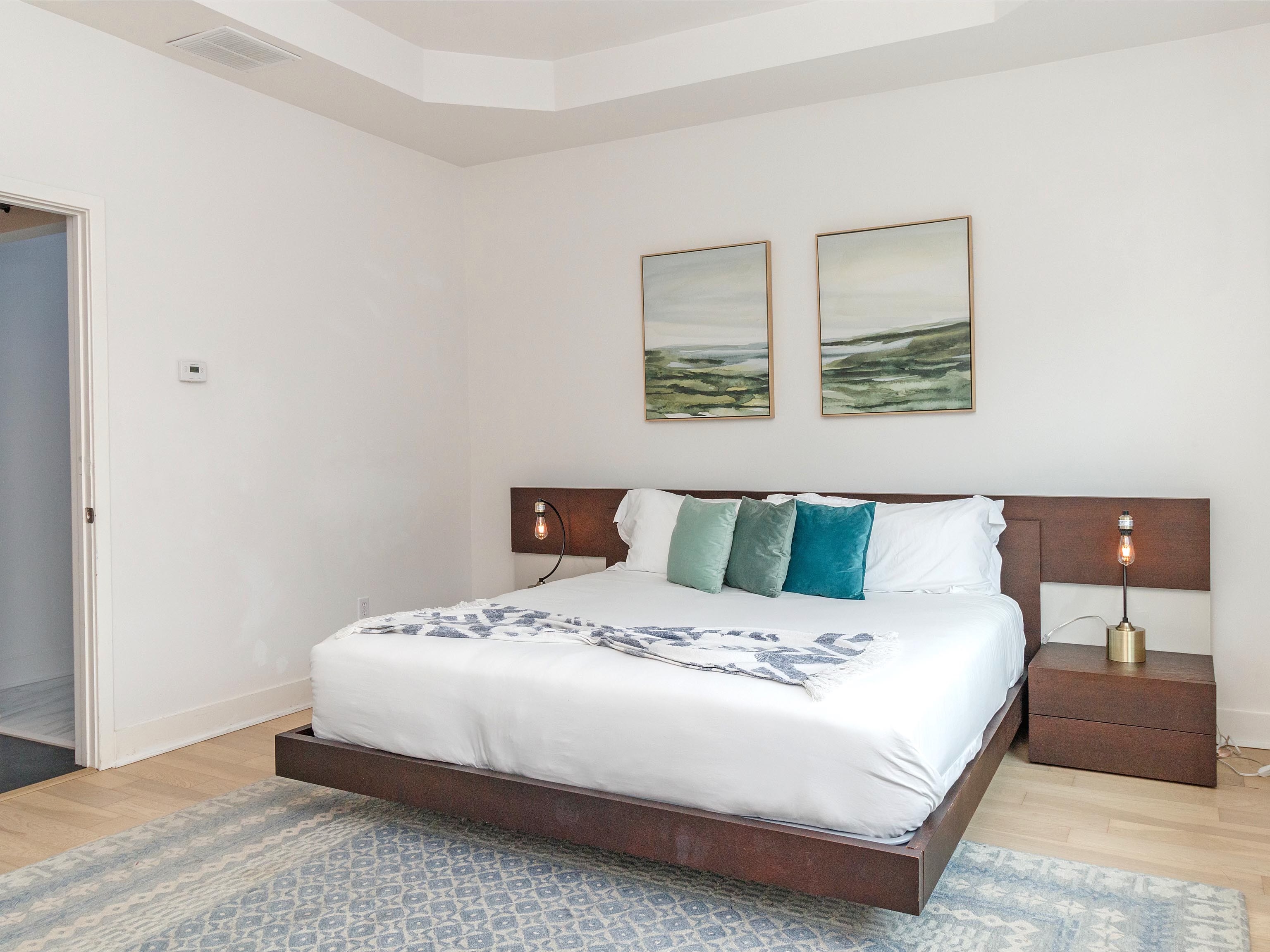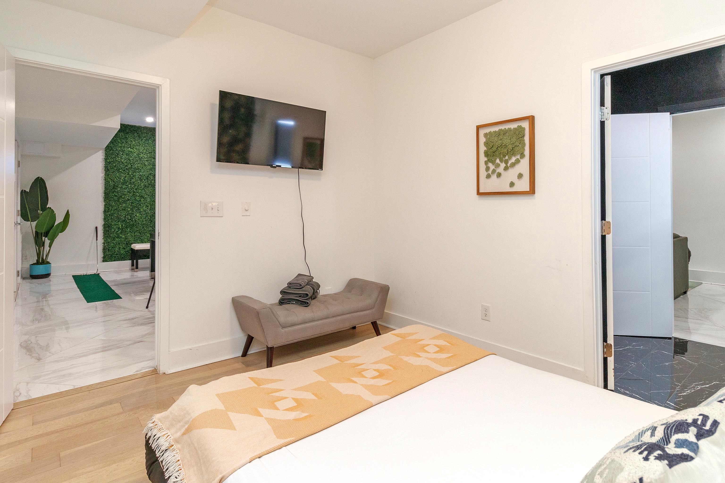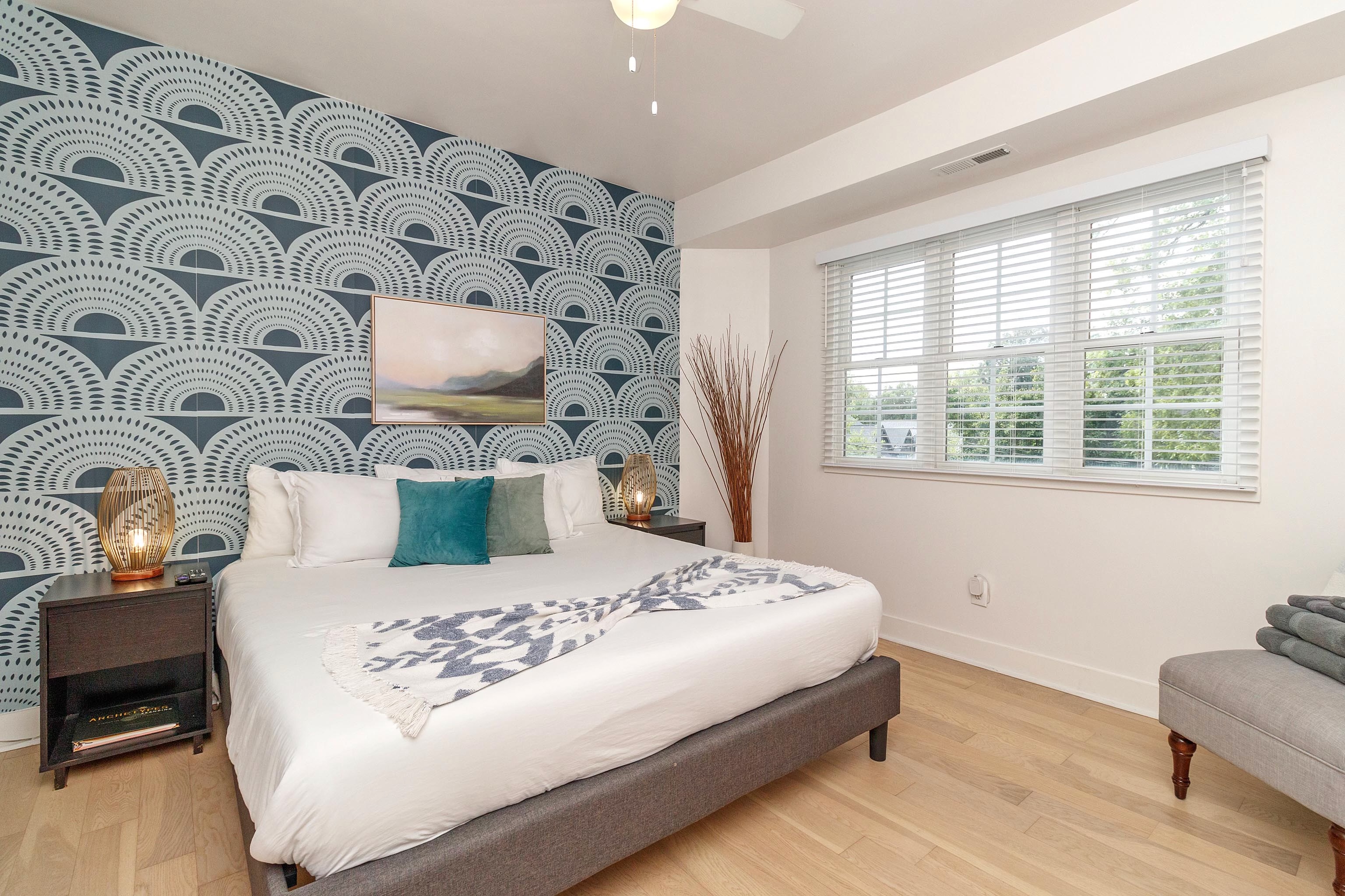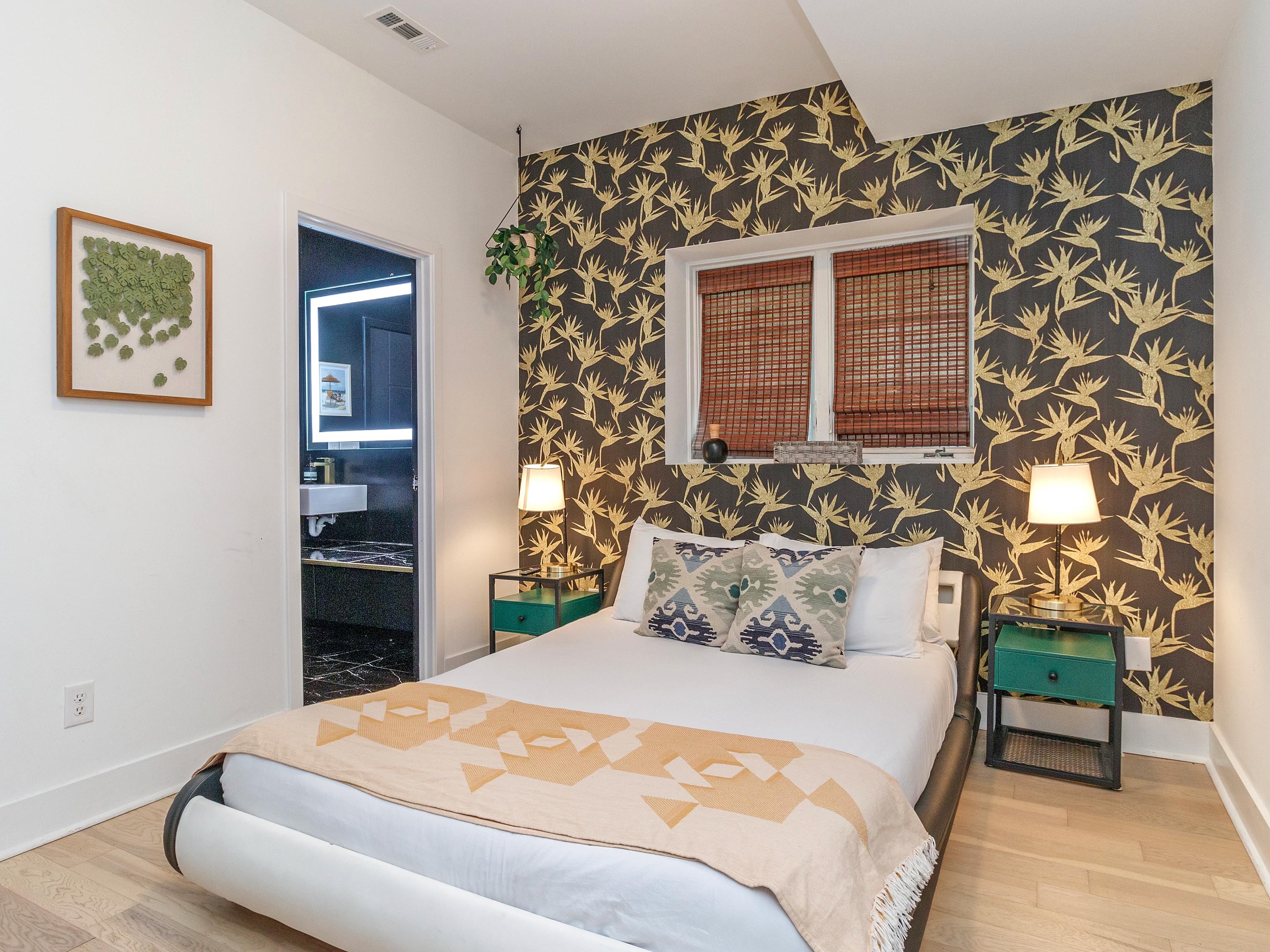 There is a second king bedroom at the end of the hall, sitting at the front of the house and along a quiet residential street. Blinds on windows. Overhead fan. Dresser. TV in room. A dramatic art deco print on the wall is accentuated by Edison bulb lighting.