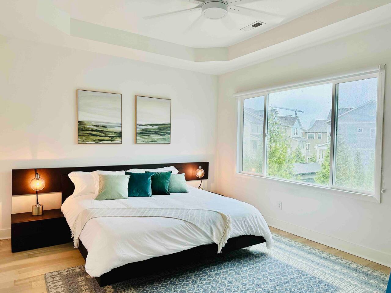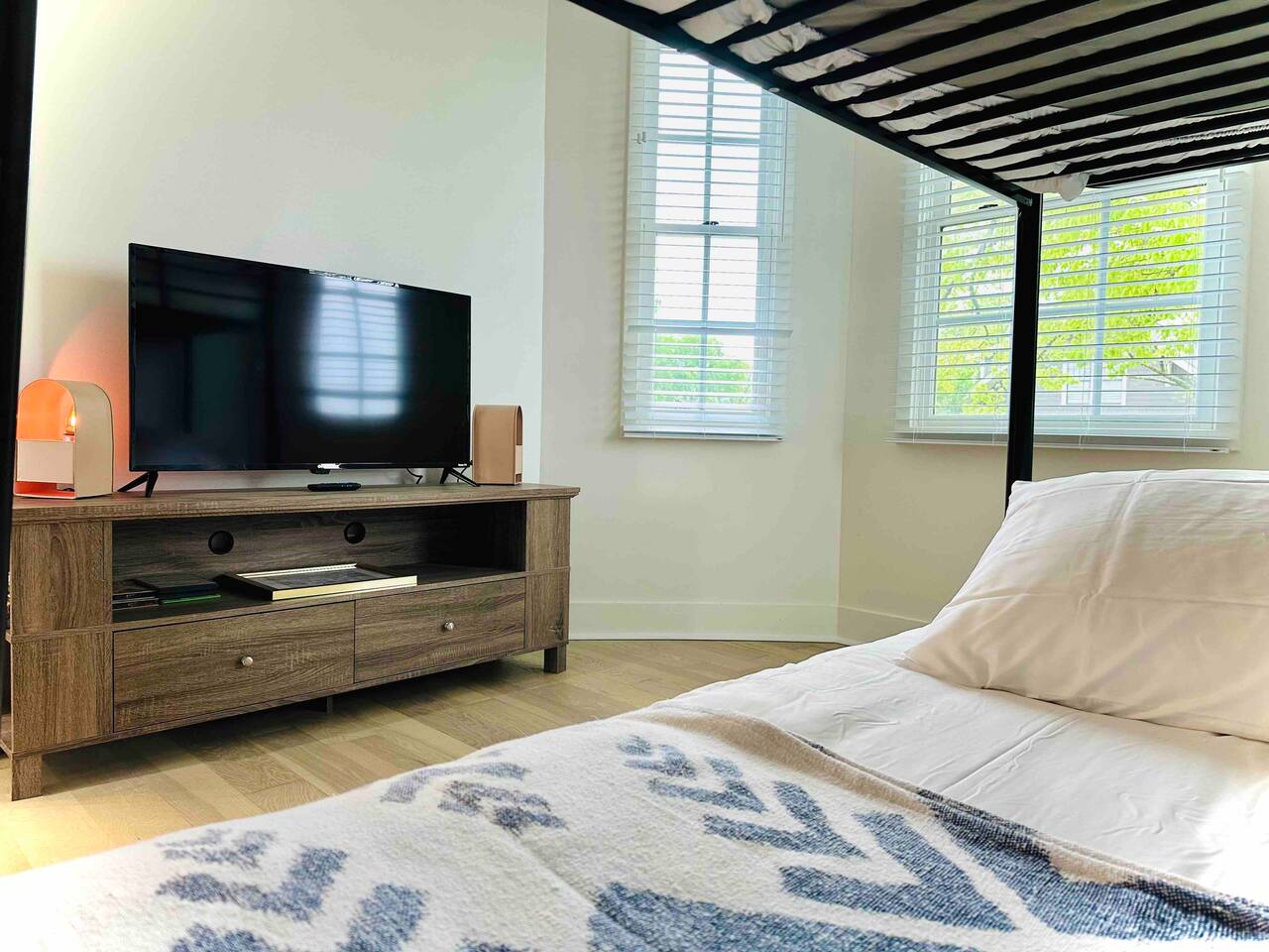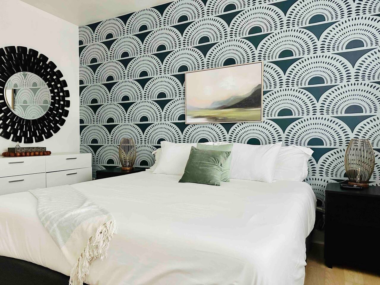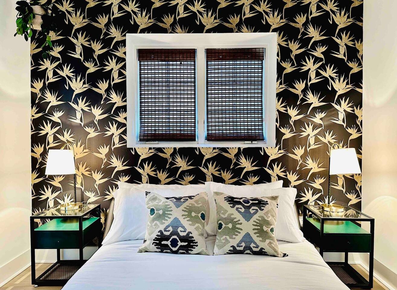 There is a second king bedroom at the end of the hall, sitting at the front of the house and along a quiet residential street. Blinds on windows. Overhead fan. Dresser. TV in room. A dramatic art deco print on the wall is accentuated by Edison bulb lighting.