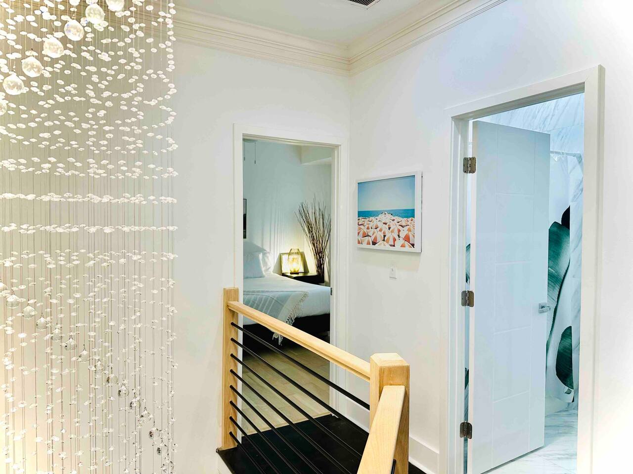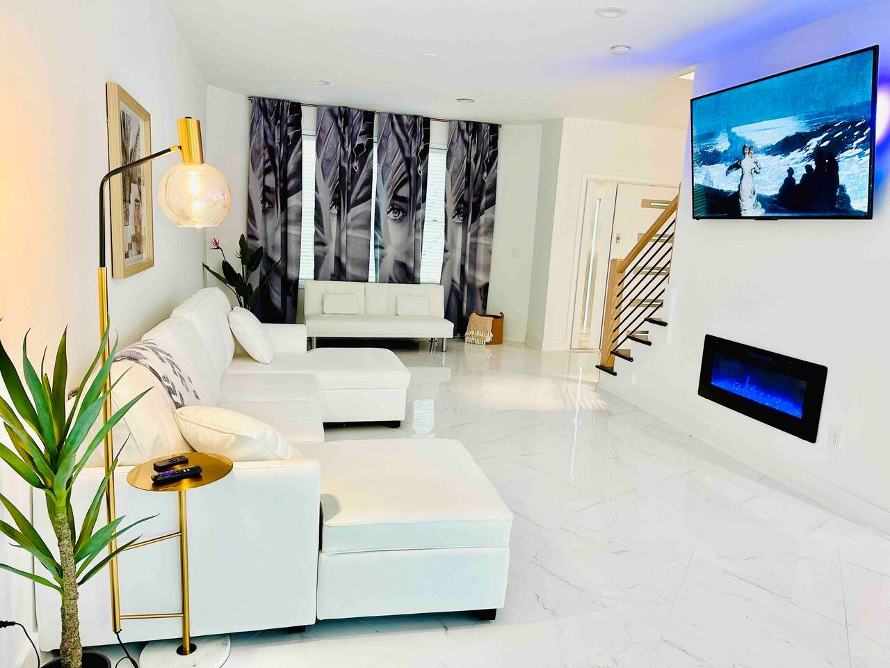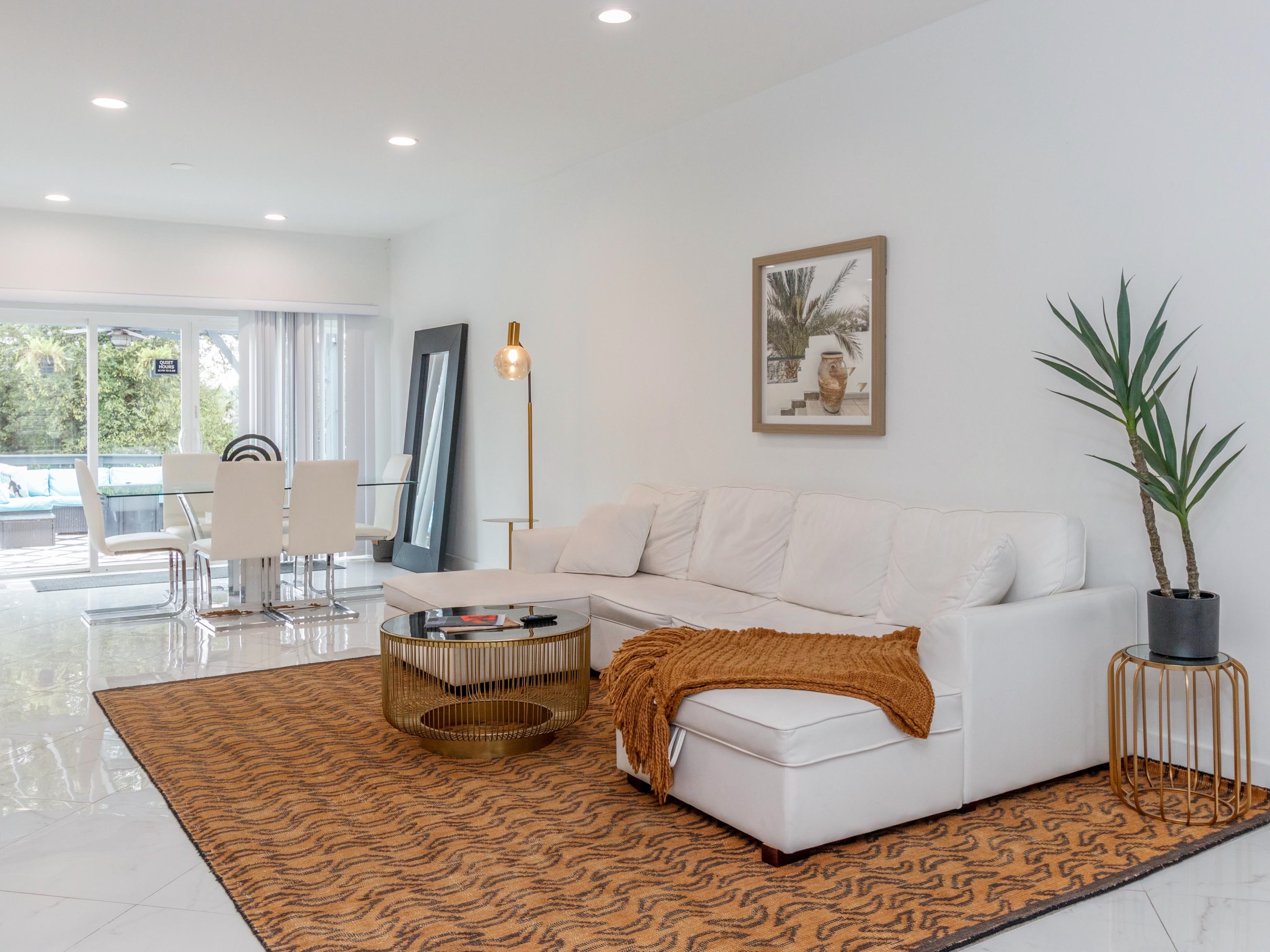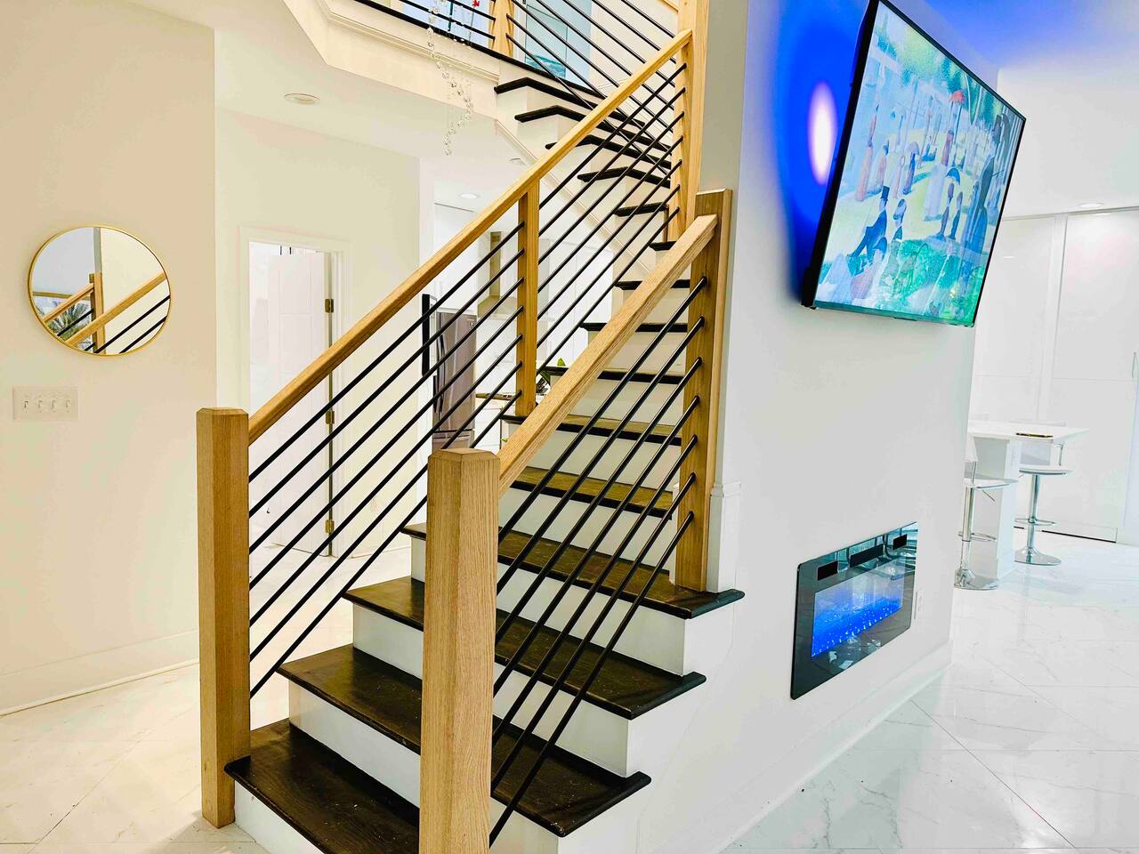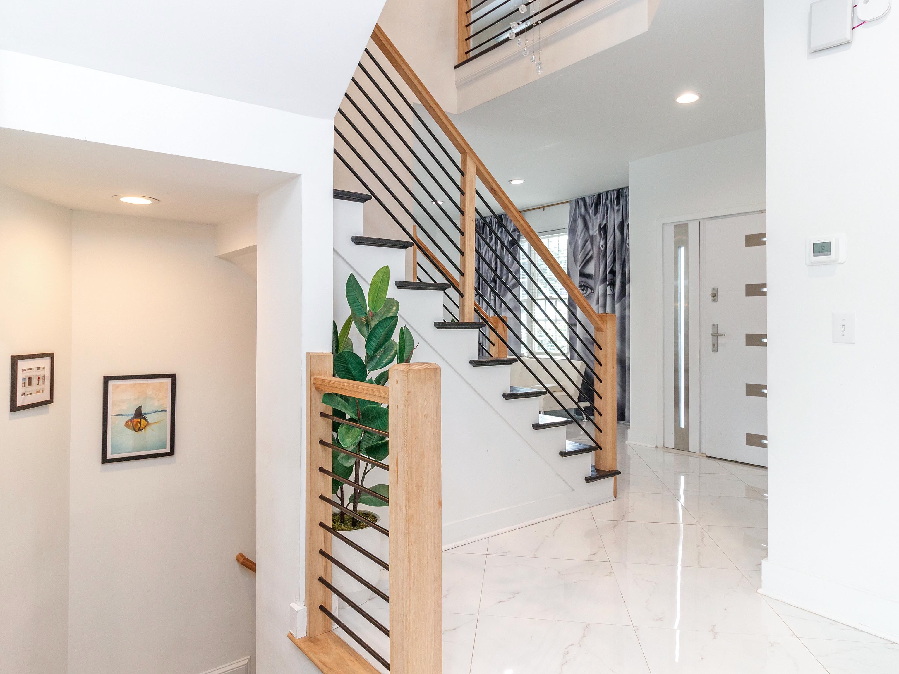 Make a grand entrance through the custom front door and find yourself looking into a bright, white, modern, and fully decked out Miami-style interior. The crystal chandelier floats down through the center of the dramatic black, white, and natural oak staircase and invites your eyes upwards. Towards the right is the first floor living room (there's another downstairs), which flows into the dining area and the backyard.
